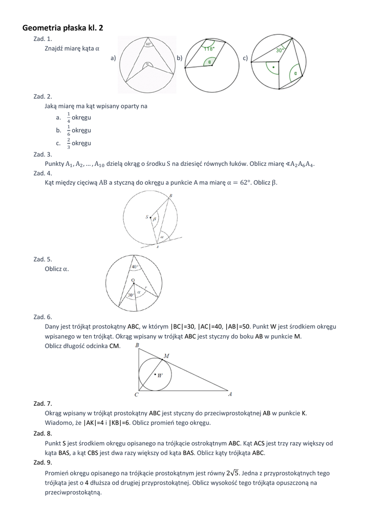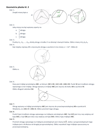 Geometria płaska kl. 2 Zad. 1. Znajdź miarę kąta a) b) c) Zad. 2. Jaką miarę ma kąt wpisany oparty na a. okręgu b. okręgu c. okręgu Zad. 3. Punkty Zad. 4. Kąt między cięciwą dzielą okrąg o środku na dziesięć równych łuków. Oblicz miarę a styczną do okręgu a punkcie A ma miarę . . Oblicz . Zad. 5. Oblicz . Zad. 6. Dany jest trójkąt prostokątny ABC, w którym |BC|=30, |AC|=40, |AB|=50. Punkt W jest środkiem okręgu wpisanego w ten trójkąt. Okrąg wpisany w trójkąt ABC jest styczny do boku AB w punkcie M. Oblicz długość odcinka CM. Zad. 7. Okrąg wpisany w trójkąt prostokątny ABC jest styczny do przeciwprostokątnej AB w punkcie K. Wiadomo, że |AK|=4 i |KB|=6. Oblicz promień tego okręgu. Zad. 8. Punkt S jest środkiem okręgu opisanego na trójkącie ostrokątnym ABC. Kąt ACS jest trzy razy większy od kąta BAS, a kąt CBS jest dwa razy większy od kąta BAS. Oblicz kąty trójkąta ABC. Zad. 9. Promień okręgu opisanego na trójkącie prostokątnym jest równy . Jedna z przyprostokątnych tego trójkąta jest o 4 dłuższa od drugiej przyprostokątnej. Oblicz wysokość tego trójkąta opuszczoną na przeciwprostokątną. Zad. 10. Dany jest trójkąt prostokątny o przyprostokątnych 5 i 12. Oblicz promień okręgu opisanego na tym trójkącie. Zad. 11. Przyprostokątne trójkąta prostokątnego mają długości 6 cm i 8 cm. Oblicz: a. Pole koła opisanego na tym trójkącie. b. Obwód okręgu wpisanego w ten trójkąt. c. Długość wysokości poprowadzonej z wierzchołka kąta prostego. Zad. 12. Dany jest trójkąt równoboczny o boku długości 4 cm. Z każdego wierzchołka trójkąta zakreślono koło o promieniu 2 cm. Oblicz pole wyciętej z tego trójkąta figury przez zakreślone koła. Zad. 13. Na okręgu o promieniu 2 cm opisano trapez prostokątny, w którym miara kąta ostrego wynosi 60°. Oblicz pole i obwód tego trapezu. Zad. 14. W trapez równoramienny o kącie ostrym 60° wpisano okrąg o promieniu 2 cm. Oblicz pole i obwód tego trapezu. Zad. 15. W trapezie równoramiennym opisanym na okręgu suma długości podstaw jest równa 8 cm. Kąt ostry ma miarę 30°. Oblicz pole tego trapezu i obwód koła wpisanego w ten trapez. Zad. 16. W trapezie równoramiennym przekątna ma długość 7 cm, a ramię długość 5 cm. Stosunek długości wysokości trapezu do ramienia jest równy . Oblicz pole trapezu i długość promienia okręgu opisanego na trapezie. Zad. 17. W trapez równoramienny, którego podstawy różnią się o 6 cm, wpisano okrąg o promieniu 2 cm. Oblicz długość przekątnej trapezu. Zad. 18. Na okręgu o promieniu długości opisano trapez równoramienny. Znajdź długość ramienia trapezu wiedząc, że jedna z podstaw tego trapezu ma 5cm długości. Zad. 19. Długości podstaw trapezu równoramiennego opisanego na okręgu są równe 4cm i 16cm. Oblicz długość promienia tego okręgu. Zad. 20. W trapez prostokątny o podstawach i wpisano okrąg. Podaj wzór uzależniający promień okręgu wpisanego od długości podstaw trapezu. Zad. 21. Dany jest trapez równoramienny o podstawach i . Jaką wysokość powinien mieć ten trapez, aby można było wpisać w niego okrąg. Wyznacz promień okręgu. Zad. 22. W romb o polu równym wpisano okrąg o promieniu . Wyznacz długość boku rombu i długości odcinków, na jakie punkt styczności z okręgiem dzieli bok. Przybliżone wartości podaj w metrach z dokładnością do trzech miejsc po przecinku. Wynik podaj z dokładnością do trzeciego miejsca po przecinku. Zad. 23. W czworokącie opisanym na okręgu oznaczono punkty styczności boków czworokąta z okręgiem w sposób podany na rysunku. Wyznacz obwód tego czworokąta na podstawie następujących informacji: , , Zad. 24. Mając dane długości , , . boków trójkąta ostrokątnego oraz długość promienia okręgu na nim opisanego, oblicz sinusy kątów oraz długość trzeciego boku trójkąta. Wykonaj obliczenia, gdy , , . Dokładność do dwóch miejsc po przecinku. Zad. 25. W trójkącie bok , bok , bok . Dwusieczna kąta przecina bok w punkcie . Oblicz długości odcinków i . Zad. 26. Dany jest trójkąt o bokach , , . Promień okręgu opisanego na tym trójkącie równy jest . Oblicz pole tego trójkąta. Zad. 27. W trójkącie mamy dane: długości boków i , długość promienia okręgu wpisanego oraz miarę kąta . Oblicz: długość boku , miary kątów i , pole trójkąta i długość promienia okręgu opisanego na trójkącie. Wykonaj obliczenia dla: Zad. 28. Boki i trójkąta Oblicz długość boku Zad. 29. , mają odpowiednie długości tego trójkąta. Oblicz kąty trójkąta , w którym prostokątny czy rozwartokątny. Zad. 30. W trójkącie , z wierzchołka . , , , , , i i tworzą kąt , . o mierze . . Rozstrzygnij, czy trójkąt jest ostrokątny, . Znajdź długość środkowej poprowadzonej