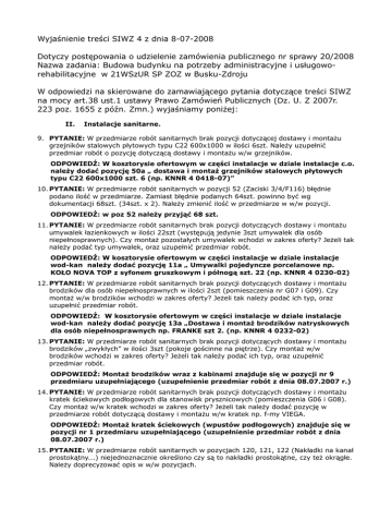Wyjaśnienie treści SIWZ 4 z dnia 8-07-2008 Dotyczy postępowania o udzielenie zamówienia publicznego nr sprawy 20/2008 Nazwa zadania: Budowa budynku na potrzeby administracyjne i usługoworehabilitacyjne w 21WSzUR SP ZOZ w Busku-Zdroju W odpowiedzi na skierowane do zamawiającego pytania dotyczące treści SIWZ na mocy art.38 ust.1 ustawy Prawo Zamówień Publicznych (Dz. U. Z 2007r. 223 poz. 1655 z późn. Zmn.) wyjaśniamy poniżej: II. Instalacje sanitarne. 9. PYTANIE: W przedmiarze robót sanitarnych brak pozycji dotyczącej dostawy i montażu grzejników stalowych płytowych typu C22 600x1000 w ilości 6szt. Należy uzupełnić przedmiar robót o pozycję dotyczącą dostawy i montażu w/w grzejników. ODPOWIEDŹ: W kosztorysie ofertowym w części instalacje w dziale instalacje c.o. należy dodać pozycję 50a „ dostawa i montaż grzejników stalowych płytowych typu C22 600x1000 szt. 6 (np. KNNR 4 0418-07)” 10. PYTANIE: W przedmiarze robót sanitarnych w pozycji 52 (Zaciski 3/4/F116) błędnie podano ilość w przedmiarze. Zamiast błędnie podanych 64szt. powinno być wg dokumentacji 68szt. (34szt. x 2). Należy zmienić ilość w przedmiarze w w/w pozycji. ODPOWIEDŹ: w poz 52 należy przyjąć 68 szt. 11. PYTANIE: W przedmiarze robót sanitarnych brak pozycji dotyczących dostawy i montażu umywalek łazienkowych w ilości 22szt (występują jedynie 3szt umywalek dla osób niepełnosprawnych). Czy montaż pozostałych umywalek wchodzi w zakres oferty? Jeżeli tak należy podać typ umywalek, oraz uzupełnić przedmiar robót. ODPOWIEDŹ: W kosztorysie ofertowym w części instalacje w dziale instalacje wod-kan należy dodać pozycję 11a „ Umywalki pojedyncze porcelanowe np. KOŁO NOVA TOP z syfonem gruszkowym i półnogą szt. 22 (np. KNNR 4 0230-02) 12. PYTANIE: W przedmiarze robót sanitarnych brak pozycji dotyczących dostawy i montażu brodzików dla osób niepełnosprawnych w ilości 2szt (pomieszczenia nr G07 i G09). Czy montaż w/w brodzików wchodzi w zakres oferty? Jeżeli tak należy podać ich typ, oraz uzupełnić przedmiar robót. ODPOWIEDŹ: W kosztorysie ofertowym w części instalacje w dziale instalacje wod-kan należy dodać pozycję 13a „Dostawa i montaż brodzików natryskowych dla osób niepełnosprawnych np. FRANKE szt 2. (np. KNNR 4 0232-02) 13. PYTANIE: W przedmiarze robót sanitarnych brak pozycji dotyczących dostawy i montażu brodzików „zwykłych” w ilości 3szt (pokoje gościnne na piętrze). Czy montaż w/w brodzików wchodzi w zakres oferty? Jeżeli tak należy podać ich typ, oraz uzupełnić przedmiar robót. ODPOWIEDŹ: Montaż brodzików wraz z kabinami znajduje się w pozycji nr 9 przedmiaru uzupełniającego (uzupełnienie przedmiar robót z dnia 08.07.2007 r.) 14. PYTANIE: W przedmiarze robót sanitarnych brak pozycji dotyczących dostawy i montażu kratek ściekowych podłogowych dla stanowisk prysznicowych (pomieszczenia G06 i G08). Czy montaż w/w kratek wchodzi w zakres oferty? Jeżeli tak należy dodać pozycję w przedmiarze robót dotyczącą dostawy i montażu w/w kratek np. f-my VIEGA. ODPOWIEDŹ: Montaż kratek ściekowych (wpustów podłogowych) znajduje się w pozycji nr 1 przedmiaru uzupełniającego (uzupełnienie przedmiar robót z dnia 08.07.2007 r.) 15. PYTANIE: W przedmiarze robót sanitarnych w pozycjach 120, 121, 122 (Nakładki na kanał prostokątny...) niejednoznacznie określono czy są to nakładki prostokątne, czy też okrągłe. Należy doprecyzować opis w w/w pozycjach. ODPOWIEDŹ: Mają być okrągłe. 16. PYTANIE: W przedmiarze robót sanitarnych w pozycjach 147, 148, 149, 150 (Przepustnice jednopłaszczyznowe winidurowe, prostokątne...) występują przepustnice winidurowe. Wg dokumentacji przewody winidurowe nie występują. Należy wyjaśnić opis pozycji (czego dotyczy). ODPOWIEDŹ: Mają być stalowe. III. Pozostałe. 17. PYTANIE: Po czyjej stronie jest wyposażenie budynku w podręczny sprzęt gaśniczy oraz „instrukcje postępowania na wypadek pożaru”, o których mowa jest w opisie technicznym projekt wykonawczy, punkt 10 – Warunki ochrony przeciwpożarowej, podpunkt „k” – wyposażenie w gaśnice? Jeśli po stronie wykonawcy to należy uzupełnić przedmiar robót o odpowiednie pozycje. ODPOWIEDŹ: Po stronie inwestora. 18. PYTANIE: W opublikowanym w dniu 07.07.2008. „Uzupełnieniu dokumentacji – konstrukcja niecki basenowej” widnieje zapis o konieczności zastosowania pokryw zbiorników wyrównawczych z odpowietrzeniem - po stronie firmy budowlanej. Zarówno w dokumentacji jak i przedmiarach robót budowlanych brak jest informacji dotyczących w/w pokryw. Należy uzupełnić informację oraz dodać pozycję w przedmiarze robót, dotycząca dostawy i montażu w/w pokryw. ODPOWIEDŹ: Dostawa i montaż pokryw zbiorników wyrównawczych po stronie Inwestora. 19. PYTANIE: W przedmiarze robót budowlanych brak jest pozycji dotyczących wykonania zabudów instalacji sanitarnych w ilości 54m2. Czy zamawiający przewiduje konieczność zabudowy instalacji sanitarnych wykonanych z płyt GK? Jeżeli tak, należy uzupełnić przedmiar robót budowlanych. ODPOWIEDŹ: W kosztorysie ofertowym w części budowlanej należy dodać pozycję 264 „Obudowa słupów płytami gipsowo-kartonowymi na rusztach metalowych pojedynczych jednowarstwo „ (np. KNR-W 2-02 2004-01) w ilości 54 m2