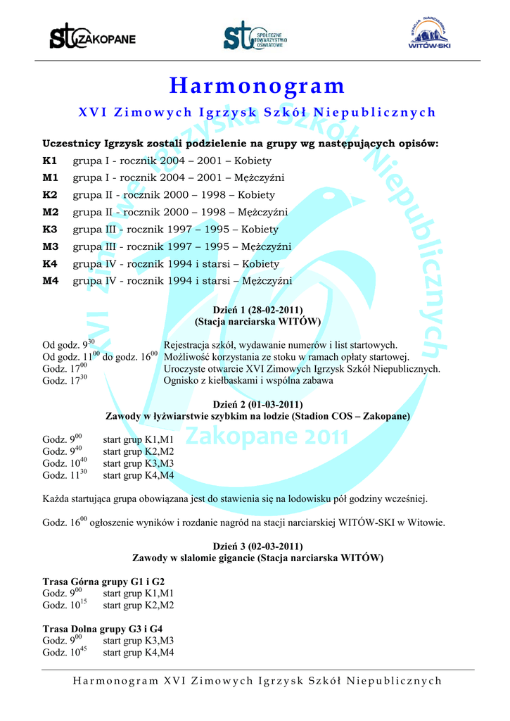 Harmonogram XVI Zimowych Igrzysk Szkół Niepublicznych do