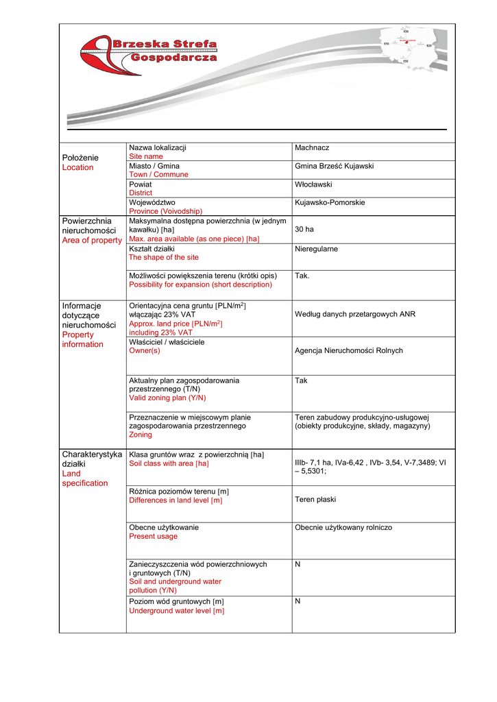 Nazwa lokalizacji Site name Miasto / Gmina Town / Commune Powiat District Województwo Province (Voivodship) Maksymalna dostępna powierzchnia (w jednym Powierzchnia kawałku) ha nieruchomości Area of property Max. area available (as one piece) ha Kształt działki The shape of the site Położenie Location Możliwości powiększenia terenu (krótki opis) Possibility for expansion (short description) Informacje dotyczące nieruchomości Property information Orientacyjna cena gruntu PLN/m2 włączając 23% VAT Approx. land price PLN/m2 including 23% VAT Właściciel / właściciele Owner(s) Machnacz Gmina Brześć Kujawski Włocławski Kujawsko-Pomorskie 30 ha Nieregularne Tak. Według danych przetargowych ANR Agencja Nieruchomości Rolnych Aktualny plan zagospodarowania przestrzennego (T/N) Valid zoning plan (Y/N) Tak Przeznaczenie w miejscowym planie zagospodarowania przestrzennego Zoning Teren zabudowy produkcyjno-usługowej (obiekty produkcyjne, składy, magazyny) Charakterystyka Klasa gruntów wraz z powierzchnią ha Soil class with area ha działki Land specification Różnica poziomów terenu m Differences in land level m IIIb- 7,1 ha, IVa-6,42 , IVb- 3,54, V-7,3489; VI – 5,5301; Teren płaski Obecne użytkowanie Present usage Obecnie użytkowany rolniczo Zanieczyszczenia wód powierzchniowych i gruntowych (T/N) Soil and underground water pollution (Y/N) N Poziom wód gruntowych m Underground water level m N Połączenia transportowe Transport links Istniejąca infrastruktura Existing infrastructure Czy były prowadzone badania geologiczne terenu (T/N) Were geological research done (Y/N) Brak danych Ryzyko wystąpienia zalań lub obsunięć terenu (T/N) Risk of flooding or land slide (Y/N) Brak danych Przeszkody podziemne (T/N) Underground obstacles (Y/N) Gazociąg DN 500 / przebiega w krańcowej części działki/ Przeszkody występujące na powierzchni terenu (T/N) Ground and overhead obstacles (Y/N) Rów melioracyjny Istniejące ograniczenia ekologiczne (T/N) Ecological restrictions (Y/N) Nie Budynki i zabudowania na terenie (T/N) Buildings / other constructions on site (Y/N) Nie Droga dojazdowa do terenu (rodzaj drogi i jej szerokość) Access road to the plot (type and width of access road) Droga technologiczna 6 m. Autostrada / droga krajowa km Nearest motorway / national road km Autostrada A1 – 3 ,50 ( do wjazdu) Droga krajowa 62 – 2,5 km Porty rzeczne i morskie w odległości do 200 km Sea and river ports located up to 200 km Gdańsk - 196 km Kolej km Railway line km Włocławek – ok.10 km (7,8 km do granicy Wlocławka) Bocznica kolejowa km Railway siding km Włocławek – ok. 10 km (7,8 km do granicy Włocławka) Najbliższe lotnisko międzynarodowe km Nearest international airport km Bydgoszcz – 96 km Warszawa - 165 km Najbliższe miasto wojewódzkie km Nearest province capital km Bydgoszcz 96 km Elektryczność na terenie (T/N) Electricity (Y/N) Tak Odległość przyłącza od granicy terenu Connection point (distance from boundary) m Napięcie Voltage kV Wg uzgodnień z Energa Operator Dostępna moc Available capacity MW Dane Energa Operator Gaz na terenie (T/N) Gas (Y/N) 15kV-110kV Tak Odległość przyłącza od granicy działki Connection point (distance from boundary) m Rodzaj paliwa gazowego: Gazociąg średniego ciśnienia dn. 160 PE, lokalizacja: północna granica obszaru inwestycyjnego. Gaz ziemny wysokometanowy, rodzina 2, grupa E wg PN-C-04753 Minimalne ciśnienie paliw gazowego w sieci 100 [kPa] dystrybucyjnej Dostępna objętość Available capacity Nm3/h Woda na terenie (T/N) Water supply (Y/N) Tak Odległość przyłącza od granicy terenu Connection point (distance from boundary) m Sieć wodno-kanalizacyjna przebiega w drodze technologicznej bezpośrednio przyległej do działki. Dostępna objętość Available capacity m3/24h Zapewniająca potrzeby inwestora Kanalizacja na terenie (T/N) Sewage discharge (Y/N) Tak Odległość przyłącza od granicy terenu Connection point (distance from boundary) m Sieć wodno-kanalizacyjna przebiega w drodze technologicznej bezpośrednio przyległej do działki. Dostępna objętość Available capacity m3/24h Tak zapewniająca potrzeby inwestora Oczyszczalnia ścieków na terenie bądź w bezpośrednim sąsiedztwie Treatment plant (Y/N) Telefony (T/N) Telephone (Y/N) Uwagi Comments Dane w PSG Odległość przyłącza od granicy terenu Connection point (distance from boundary) m N T W obrębie działki dostępność sieci światłowodowej, która umozliwia przyłączenie podmiotu / operator Firma Sat-Film Włocławek/ Teren jest laureatem w konkursie „Grunt na medal” z roku 2014.