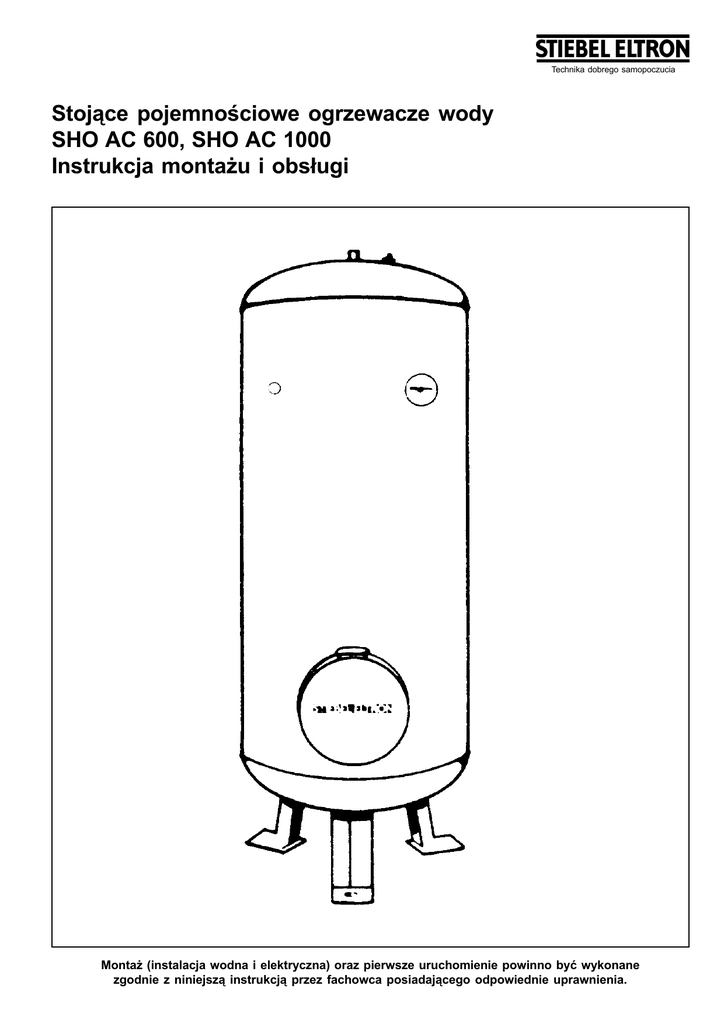 Technika dobrego samopoczucia Stoj¹ce pojemnociowe ogrzewacze wody SHO AC 600, SHO AC 1000 Instrukcja monta¿u i obs³ugi Monta¿ (instalacja wodna i elektryczna) oraz pierwsze uruchomienie powinno byæ wykonane zgodnie z niniejsz¹ instrukcj¹ przez fachowca posiadaj¹cego odpowiednie uprawnienia. 1 2 3 4 5 6 7 Pojemnoæ Waga netto l kg a ømm b mm c mm do du e ømm f mm h mm Dopuszczalne cinienie robocze bar SHO AC 600 600 160 750 1030 530 G2A G 1 1/2A 750 115 1685±10 6 SHO AC 1000 1000 228 750 1030 530 G2A G 1 1/2A 750 115 2525±10 6 Typ Rys. 1 2 Doprowadzenie wody zimnej (gwint zewnêtrzny) Grza³ka Zbiornik Króciec dla cyrkulacji G 1/2A (gwint zewnêtrzny) Izolacja cieplna 100 mm (wyposa¿enie dodatkowe) Anoda ochronna G 1 1/4 A (gwint zewnêtrzny) Wyjcie wody gor¹cej (gwint zewnêtrzny) Wymiary Opis ogólny Pod³¹czenie wodne Monta¿ i uruchomienie mo¿e byæ dokonane tylko i wy³¹cznie przez fachowca, który posiada odpowiednie uprawnienia. Monta¿ nale¿y wykonaæ zgodnie z instrukcj¹ monta¿u i obs³ugi. Stoj¹ce pojemnociowe ogrzewacze wody zabezpieczaj¹ jeden lub wiêcej punktów poboru wody. Znajduj¹ siê pod pe³nym cinieniem instalacji wodoci¹gowej, które podczas ogrzewania wody jak i wystêpuj¹cych w niej wahañ cinienia nie powinno przekroczyæ granicy zaworu bezpieczeñstwa (6 bar). Zbiornik stalowy jest zabezpieczony specjaln¹ emali¹ antykorozyjn¹ oraz anod¹ ochronn¹. Stoj¹cy ogrzewacz SHO wyposa¿ony jest w dwa typy g³owic grzewczych. G³owicê jednolub dwutaryfow¹. Grzanie podstawowe w ogrzewaczach z g³owic¹ dwutaryfow¹ jest ustawione w pozycji I (8 h). Gdy wymagany jest krótszy okres korzystania podgrzewania, wówczas istnieje mo¿liwoæ poprzez prze³¹cznik znajduj¹cy siê obok listwy zaciskowej, skrócenia czasu korzystania z taryfy nocnej I (8 h) na II (4 h). W celu wygodnej obs³ugi szybkiego grzania zalecamy zastosowanie zdalnego prze³¹cznika, który mo¿e byæ umieszczony w pomieszczeniu mieszkalnym. Urz¹dzenie musi byæ ustawione w wolnym od mrozu pomieszczeniu i jak najbli¿ej punktu poboru, z którego jest najczêciej pobierana ciep³a woda. Pod³o¿e pod ogrzewaczem musi byæ wytrzyma³e na jego ciê¿ar ca³kowity. Ciê¿ar zbiornika SHO AC 600 wype³nionego wod¹ wynosi oko³o 760 kg. Urz¹dzenie musi byæ umocowany do pod³ogi. Do izolacji zbiornika zalecamy 100 mm izolacjê: 600 l - WD 612 - nr kat. 071732 100 l - WD 1012 - nr kat. 071733 Prosimy zwróciæ uwagê podczas zak³adania izolacji na zbiorniku, aby otwory odwadniaj¹ce znajduj¹ce siê w dolnej czêci komory mieszcz¹cej grza³kê nie zosta³y zakryte, co mog³o by powodowaæ brak mo¿liwoci odp³ywu kondensatu. Pod³¹czenie wodne nale¿y wykonaæ zgodnie z obowi¹zuj¹cymi normami. Na tabliczce znamionowej podane cinienie robocze 6 bar nie mo¿e byæ przekroczone. Nale¿y po³¹czyæ znajduj¹ce siê w dolnej i górnej czêci urz¹dzenia wyprowadzone króæce z sieci¹ zimnej i gor¹cej wody. Nastêpnie nale¿y zainstalowaæ zawór bezpieczeñstwa na dolnym wp³ywie wody zimnej w kolejnoci jak na rys. 2. Przed zamontowaniem zaworu bezpieczeñstwa nale¿y przep³ukaæ instalacjê wodn¹. Przep³yw maksymalny: SHO AC 600 - 50 l/min SHO AC 1000 - 70 l/min Przep³yw maksymalny nie powinien podczas chwilowych przyrostów cinienia przekroczyæ podanych wartoci. Rozprê¿ona woda musi w sposób widoczny wydostawaæ siê z zaworu bezpieczeñstwa i powinna byæ odprowadzana do pojemnika lub kratki ciekowej. Odprowadzacz wody w kratce ciekowej powinien byæ tak du¿y, ¿eby w przypadku pe³nego otwarcia zaworu bezpieczeñstwa by³ w stanie odprowadzaæ wydostaj¹c¹ siê wodê. Aby podczas prac inspekcyjnych mo¿na by³o szybko opró¿niæ ogrzewacz nale¿y zamontowaæ w najni¿szym miejscu zawór opró¿niaj¹cy. Musi on odpowiadaæ przekrojowi instalacji. W celu kontroli cinienia wody zalecamy zastosowanie manometru pomiêdzy zaworem bezpieczeñstwa, a zaworem zwrotnym. Zawór bezpieczeñstwa powinien byæ tak ustawiony aby podczas wy³¹czonego grzania nie wydostawa³a siê woda. Gdyby jednak z zaworu bezpieczeñstwa kapa³a woda znaczy to, ¿e gniazdo zaworu jest brudne lub cinienie wody za wysokie. Przy skokach cinienia w instalacji powy¿ej 4,8 bar potrzebny jest zawór redukuj¹cy cinienie i przy cinieniu wy¿szym, drugi ponad 10 bar. Do instalacji wody zimnej i ciep³ej mo¿na stosowaæ rury stalowe lub miedziane w nastêpuj¹cej kolejnoci: Uwaga! Ko³nierz grzewczy nie mo¿e byæ izolowany za wzglêdu na uk³ady elektryczne w nim zamontowane. Instalacja wody Þ zimnej Niniejsz¹ instrukcje monta¿u i obs³ugi nale¿y starannie przechowywaæ. W przypadku zmiany w³aciciela urz¹dzenia przekazaæ nowemu u¿ytkownikowi. Podczas konserwacji i ewentualnej naprawy urz¹dzenia nale¿y udostêpniæ do wgl¹du fachowcowi Wszystkie prace mog¹ byæ wykonywane tylko przez osoby uprawnione! Rura stalowa Þ Instalacja wody ciep³ej Emaliowany zbiornik Þ stalowy Rura miedziana Þ Emaliowany Þ zbiornik Rura stalowa lub miedziana Rura Þ miedziana Uwagi dla u¿ytkownika Zbiornik stoj¹cy 1 Cyrkulacja musi byæ wykonana odpowiednio wed³ug przepisów o oszczêdnoci energii. 2 Temperatura wody gor¹cej nie mo¿e byæ wy¿sza max 60OC (centralne mieszanie wody przy temperaturze wody w zbiorniku > 60OC). 3 Nale¿y zainstalowaæ na instalacji wodnej w najdalej po³o¿onym punkcie poboru wody regulator temperatury. po osi¹gniêciu zadanej temperatury wy³¹cza on pompê cyrkulacyjn¹. Z dodatkowo zamontowanym zaworem magnetycznym nie dopuszcza siê do zjawiska cyrkulacji grawitacyjnej. 4 Proszê wzi¹æ pod uwagê przy doborze ogrzewacza straty ciep³a zwi¹zane z cyrkulacj¹. Instalacja wody ciep³ej musi byæ ocieplona. W przypadku zastosowania baterii termostatycznych, pod³¹czenie wody zimnej musi znajdowaæ siê pomiêdzy ogrzewaczem a zainstalowanym na sieci zaworem redukuj¹cym cinienie, aby baterie znajdowa³y siê pod zredukowanym cinieniem wody. Pod³¹czenie elektryczne