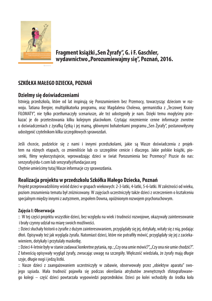 Fragment książki „Sen Żyrafy”, G. i F. Gaschler, wydawnictwo „Porozumiewajmy się”, Poznań, 2016. SZKÓŁKA MAŁEGO DZIECKA, POZNAŃ Dzielmy się doświadczeniami Istnieją przedszkola, które od lat inspirują się Porozumieniem bez Przemocy, towarzysząc dzieciom w rozwoju. Tatiana Bergier, multiplikatorka programu, oraz Magdalena Cholewa, germanistka z „Teczowej Krainy FILOMATY”, nie tylko przetłumaczyły scenariusze, ale też udostępniły je nam. Dzięki temu mogłyśmy przekazać je do przetestowania kilku kolejnym placówkom. Czytając niezmiernie cenne informacje zwrotne o doświadczeniach z żyrafką Cętką i jej mamą, głównymi bohaterkami programu „Sen Żyrafy”, postanowiłysmy udostępnić czytelnikom kilka szczegółowych sprawozdań. Jeśli chcecie, podzielcie się z nami i innymi przedszkolami, jakie są Wasze doświadczenia z projektem na różnych etapach, co zmieniliście lub co szczególnie cenicie i dlaczego. Jakie polskie książki, piosenki, filmy wykorzystujecie, wprowadzając dzieci w świat Porozumienia bez Przemocy? Piszcie do nas: [email protected] lub [email protected] Chętnie umieścimy tutaj Wasze informacje czy sprawozdania. Realizacja projektu w przedszkolu Szkółka Małego Dziecka, Poznań Projekt przeprowadziliśmy wśród dzieci w grupach wiekowych: 2-3-latki, 4-latki, 5-6-latki. W zależności od wieku, poziom zrozumienia tematu był zróżnicowany. W zajęciach uczestniczyły także dzieci z orzeczeniem o kształceniu specjalnym między innymi z autyzmem, zespołem Downa, opóźnionym rozwojem psychoruchowym. Zajęcia I: Obserwacja :: W tej części projektu wszystkie dzieci, bez względu na wiek i trudności rozwojowe, okazywały zainteresowanie i brały czynny udział na miarę swoich możliwości. :: Dzieci słuchały historii o żyrafie z dużym zainteresowaniem, przyglądały się jej, dotykały, witały się z nią, podając dłoń. Opisywały też jak wygląda żyrafa. Natomiast dzieci, które nie potrafiły mówić, przyglądały się jej z zaciekawieniem, dotykały i przytulały maskotkę. :: Dzieci 4-letnie były w stanie zadawać konkretne pytania, np.: „Czy ona umie mówić?”, „Czy ona nie umie chodzić?”. Z łatwością opisywały wygląd żyrafy, zwracając uwagę na szczegóły. Większość wiedziała, że żyrafy mają długie szyje, długie nogi i jedzą listki. :: Nasze dzieci z zaangażowaniem uczestniczyły w zabawie, obserwowały przez „obiektyw aparatu” swojego sąsiada. Mała trudność pojawiła się podczas określania atrybutów zewnętrznych sfotografowanego kolegi – część dzieci powtarzała wypowiedzi poprzedników. Dzieci po kolei wchodziły do środka koła i opisywały swojego sąsiada, odnosząc się głównie do jego wyglądu zewnętrznego. Cechy, na jakie zwracały uwagę dzieci dotyczyły głównie koloru oczu, koloru włosów, długości włosów, koloru ubrań i butów. Pojawiły się również określenia takie jak „duży” i „mały”. :: Dzieci z radością zadecydowały, że żyrafa ma pozostać w przedszkolu, próbowały samodzielnie wymyślić, gdzie maskotka ma nocować. Padło wiele pomysłów, m. in.: „Połóżmy ją na materacu”; „A może zróbmy jej domek z drewna?”; „Może włożymy jej trawę do środka?”. Ostatecznie dzieci ułożyły żyrafę w kartonie, do którego włożyły kocyk i poduszkę, a następnie ją przykryły. Wszystkie dzieci uczestniczące w zajęciach z czułością i troską podchodziły do żyrafy, głaskały ją. Dopytywały wprawdzie, czy żyrafa zostanie sama na noc, ale z łatwością zgodziły się, aby tak było. :: Niektóre dzieci, wychodząc z przedszkola, opowiadały rodzicom o tym, że żyrafka zjawiła się w ich przedszkolu i czeka tu na swoją mamę. Zajęcia II: Uczucia :: Przed rozpoczęciem zajęć dzieci z niecierpliwością czekały na spotkanie z Żyrafiątkiem, nie mogły doczekać się, aby być z nim, więc udały się po nie w miejsce, gdzie odpoczywało. Dzieci wspominały dzień poprzedni, chętnie opowiadały o tym, co się wczoraj wydarzyło. Zadawały pytania żyrafie, jak się dziś czuje. :: Kiedy żyrafa wydawała się smutna, dzieciom również było smutno. :: Dzieci aktywnie uczestniczyły w zabawie: „Zgadnij, jak się czuję”. Starały się odgadnąć uczucia, które towarzyszą osobom ukazanym na obrazkach. Podejmowały próbę pantomimicznego przedstawiania uczuć, jednak trudność sprawiło pokazanie strachu czy rozczarowania. Gdy nauczyciel pytał dzieci, jak się czują, kiedy mówią, że jest im „źle”, szukały innych uczuć. Najczęściej z ich ust padały słowa „smutno” lub „niedobrze”, wracały też do „źle”. Posługiwały się przy tym przygotowanymi wcześniej przez nauczyciela kartami obrazującymi różne uczucia. Często z ust młodszych przedszkolaków padały słowa, że jest im źle, kiedy nie ma mamy. Mówiły, że chciałyby się do niej właśnie przytulić. Dzieci 2,5- i 3-letnie potrafiły wymienić takie uczucia jak: radość, smutek, strach, tęsknota. :: Dzieci z orzeczeniem potrzebowały dokładniejszego wytłumaczenia, wsparcia, nakierowania słownego. Była to dla nich trudna część projektu, którą mocno przeżywały, ponieważ odnosiła się do emocji. :: Zapoznaliśmy dzieci z poszczególnymi rodzajami uczuć, których mogłyby doświadczać. Z dużym zaangażowaniem brały udział w zabawie, w której nauczyciel wybierał jedno dziecko, mające pokazać wyraz twarzy przedstawiony na karcie. Sprawiało im to dużą radość. Pytały żyrafę „jak się dziś czuje”, pytały również, jak się czują ich rówieśnicy. Bardzo chciały poprawić humor Żyrafiątku, więc z chęcią zaśpiewały dla niego piosenkę, wesoło się z nią bawiąc. :: W części muzycznej wzięły udział wszystkie dzieci, nawet te, którym trudno było zdefiniować emocje i wykazywały mniejsze zainteresowanie omawianym tematem. :: W jednej z grup 