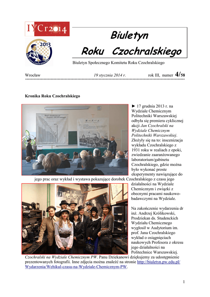 Biuletyn Roku Czochralskiego Biuletyn Społecznego Komitetu Roku Czochralskiego Wrocław 19 stycznia 2014 r. rok III, numer 4/58 ***************************************************************************************************************** Kronika Roku Czochralskiego ► 17 grudnia 2013 r. na Wydziale Chemicznym Politechniki Warszawskiej odbyła się premiera cyklicznej akcji Jan Czochralski na Wydziale Chemicznym Politechniki Warszawskiej. Złożyły się na to: inscenizacja wykładu Czochralskiego z 1931 roku w realiach z epoki, zwiedzanie zaaranżowanego laboratorium/gabinetu Czochralskiego, gdzie można było wykonać proste eksperymenty nawiązujące do jego prac oraz wykład i wystawa pokazujące dorobek Czochralskiego z czasu jego działalności na Wydziale Chemicznym i związki z obecnymi pracami naukowobadawczymi na Wydziale. Na zakończenie wydarzenia dr inż. Andrzej Królikowski, Prodziekan ds. Studenckich Wydziału Chemicznego wygłosił w Audytorium im. prof. Jana Czochralskiego wykład o osiągnięciach naukowych Profesora z okresu jego działalności na Politechnice Warszawskiej. Czochralski na Wydziale Chemicznym PW. Panu Dziekanowi dziękujemy za udostępnienie prezentowanych fotografii. Inne zdjęcia można znaleźć na stronie http://biuletyn.pw.edu.pl/ Wydarzenia/Wehikul-czasu-na-Wydziale-Chemicznym-PW. 1 Czterech wielkich Rozpoczęty Światowy Rok Krystalografii jest znakomitą okazją do dalszego promowania Jana Czochralskiego, tym razem na niwie międzynarodowej. Przy okazji warto zauważyć, że Jan Czochralski nie był jedynym Polakiem, który odcisnął swoje piętno na światowej krystalografii. Jeszcze dwa polskie osiągnięcia należą do kanonu krystalograficznego, choć ich autorzy nie zawsze są przywoływani i pamiętani w Polsce i na świecie. Metoda czasu przelotu (ang. time of flight – TOF) do badania dyfrakcji neutronów jest dziś powszechnie stosowana nie tylko w badaniach neutronograficznych. W badaniach z użyciem promieniowania rentgenowskiego i synchrotronowego nosi nazwę metody dyspersji energii (ang. energy-dispersive method). Autorem metody jest prof. Bronisław Buras (1915-1994), współautor pierwszej publikacji o metodzie: B. Buras, J. Leciejewicz „A time-of-flight method for neutron diffraction crystal structure investigations”, Nukleonika 8, 75 (1963). Może warto teraz, w Roku Krystalografii i w 20. rocznicę śmierci prof. Bronisława Burasa, upomnieć się o jego upamiętnienie choćby przez nazwanie metody metodą Burasa? Mamy metody Lauego, Braggów, Schoenfliesa. Dlaczego nie ma metody Burasa?! Wprowadzenie nazwiska twórcy do nazwy metody (pamiętajmy o przykładzie metody Czochralskiego) miałoby jeszcze jeden aspekt – wskazanie na jedność merytoryczną dwóch metod: czasu przelotu i dyspersji energii. Mamy więc zadanie „bojowe” dla Komitetu Krystalografii PAN i Polskiego Towarzystwa Krystalograficznego – przekonanie Unii Krystalograficznej do wprowadzenia nazwy „metoda Burasa” do obiegu wśród krystalografów. Do tytułowej „czwórki” należy zaliczyć profesorów: matematyka Stanisława Zarembę (1863-1942) i mineraloga i krystalografa Stefana Kreutza (1883-1941). Wprawdzie ich system notacji grup przestrzennych opracowany w 1919 r. („Sur les fondements de la cristallographic géométrique”) został wyparty przez notację międzynarodową Hermana-Mauguina, ale przez dziesięciolecia był uznawany za znaczący wkład do krystalografii. ****** „Kryształowy Jan” Dnia 4 grudnia podczas kcyńskiej wieczornicy Jan Czochralski - geniusz z Kcyni, jeden z wychowanków miejscowego Zakładu, Waldemar Sikora, wykonał w rytmie hip-hopu własną piosenkę poświęconą Janowi Czochralskiemu. Zaśpiewał ją także podczas uroczystości kończących Rok Jana Czochralskiego. Poniżej przedstawiamy jej tekst pamiętając, że strona muzyczna ma też duże znaczenie w odbiorze utworu. I Zapomnienie, strach, cierpienie Wreszcie wyzwolenie Natchnienie naukowca wprawia wszystkich nas w zdumienie. Kcyński geniusz - w 2013 roku odzyskał pamiętliwość i spokój. II W nieznośnej ciszy, obok pustej kliszy rozlega się głos starszego człowieka, który czeka na odbicie echa, trzymając pióro w swoich rękach. O zmęczonych powiekach, z niecierpliwością... Aż trudna pora minie. Zamiast w atramencie - zanurza pióro w cynie. Coś wyjątkowego niebywale – technologia rozwinięta w monokrysztale. Wynaleziona przez Jana Czochralskiego 2 z miasta kcyńskiego - naukowca lekko zwariowanego, lecz w pozytywnym znaczeniu, szczęśliwym przeznaczeniu. Refren: Przypadek spowodował zmieniony los. W nieznośnej ciszy umilkniony głos. Niedoceniony osobiście dla Czochralskiego właśnie tutaj przyszliście! III Czasem tak bywa eksperymentalnie patrzymy na życie całkiem realnie. Nie myśląc o rzeczach, które stworzyć można. Bo człowiek za człowiekiem całkowicie już nie zdąża - z relacjami i pamiętliwością. Stoimy pomiędzy młodością a starością… IV Jan chciał kiedyś zostać wybitnym chemikiem, lecz skończył szkołę ze średnim wynikiem. Zapytał się, czy nie ma z nią nic wspólnego, rozrywając świadectwo ukończenia szkolnego. V Powoli. Do przodu. Zapomniane zasługi dla naszego narodu. W czasie wojny walczył w Armii Krajowej. Zasłużył się dla tej jednostki bojowej. Stał pomiędzy śmiercią a życiem. Nie spodziewał się, że kiedyś będzie na szczycie. Refren: Przypadek spowodował zmieniony los. W nieznośnej ciszy umilkniony głos. Niedoceniony osobiście dla Czochralskiego właśnie tutaj przyszliście! ********* Nowości wydawnicze Na zakończenie Roku Jana Czochralskiego ukazały się dwie pozycje książkowe związane z prof. Czochralskim. Pierwszą, w listopadzie 2013 r., wydała Oficyna Wydawnicza PW dla Muzeum Politechniki Warszawskiej Jan Czochralski – prekursor współczesnej elektroniki. Stulecie odkrycie metody krystalizacji pióra trójki profesorów zaangażow