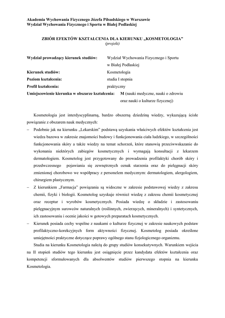 Akademia Wychowania Fizycznego Józefa Piłsudskiego w Warszawie Wydział Wychowania Fizycznego i Sportu w Białej Podlaskiej ZBIÓR EFEKTÓW KSZTAŁCENIA DLA KIERUNKU „KOSMETOLOGIA” (projekt) Wydział prowadzący kierunek studiów: Wydział Wychowania Fizycznego i Sportu w Białej Podlaskiej Kierunek studiów: Kosmetologia Poziom kształcenia: studia I stopnia Profil kształcenia: praktyczny Umiejscowienie kierunku w obszarze kształcenia: M (nauki medyczne, nauki o zdrowiu oraz nauki o kulturze fizycznej) Kosmetologia jest interdyscyplinarną, bardzo obszerną dziedziną wiedzy, wykazującą ścisłe powiązanie z obszarem nauk medycznych: Podobnie jak na kierunku „Lekarskim” podstawą uzyskania właściwych efektów kształcenia jest wiedza bazowa w zakresie znajomości budowy i funkcjonowania ciała ludzkiego, w szczególności funkcjonowania skóry a także wiedzy na temat schorzeń, które stanowią przeciwwskazanie do wykonania niektórych zabiegów kosmetycznych i wymagają konsultacji z lekarzem dermatologiem. Kosmetolog jest przygotowany do prowadzenia profilaktyki chorób skóry i przedwczesnego pojawiania się zewnętrznych oznak starzenia oraz do pielęgnacji skóry zmienionej chorobowo we współpracy z personelem medycznym: dermatologiem, alergologiem, chirurgiem plastycznym. Z kierunkiem „Farmacja” powiązania są widoczne w zakresie podstawowej wiedzy z zakresu chemii, fizyki i biologii. Kosmetolog uzyskuje również wiedzę z zakresu chemii kosmetycznej oraz receptur i wyrobów kosmetycznych. Posiada wiedzę o składzie i zastosowaniu pielęgnacyjnym surowców naturalnych (roślinnych, zwierzęcych, mineralnych) i syntetycznych, ich zastosowaniu i ocenie jakości w gotowych preparatach kosmetycznych. Kierunek posiada cechy wspólne z naukami o kulturze fizycznej w zakresie naukowych podstaw profilaktyczno-korekcyjnych form aktywności fizycznej. Kosmetolog posiada określone umiejętności praktyczne dotyczące poprawy ogólnego stanu fizjologicznego organizmu. Studia na kierunku Kosmetologia należą do grupy studiów konsekutywnych. Warunkiem wejścia na II stopień studiów tego kierunku jest osiągnięcie przez kandydata efektów kształcenia oraz kompetencji sformułowanych dla absolwentów studiów pierwszego stopnia na kierunku Kosmetologia. Opis kierunkowych efektów kształcenia wraz ze wskazaniem ich relacji z efektami kształcenia dla obszaru kształcenia Objaśnienie oznaczeń w symbolach: K_ - kierunkowe efekty kształcenia _W - (po podkreślniku) kategoria wiedzy _U - (po podkreślniku) kategoria umiejętności _K - (po podkreślniku) kategoria kompetencji społecznych Opis kierunkowych efektów kształcenia Symbol Po ukończeniu studiów I stopnia kierunku Kosmetologia o profilu praktycznym absolwent osiąga następujące efekty kształcenia: (1) (2) Odniesienie do efektów kształcenia w obszarze M1 (3) WIEDZA K_W01 K_W02 K_W03 K_W04 K_W05 K_W06 K_W07 K_W08 K_W09 K_W10 Rozumie fenomen funkcjonowania organizmów żywych, genetyczne podłoże ich różnicowania oraz mechanizmy dziedziczenia. Zna zależności pomiędzy organizmem człowieka a środowiskiem życia. Zna wpływ czynników fizycznych środowiska na organizm żywy. Zna budowę i funkcje biologiczne białek, kwasów nukleinowych, węglowodanów, lipidów, hormonów i witamin oraz główne szlaki metaboliczne. Zna znaczenie diagnostyczne, budowę, właściwości i klasyfikację enzymów. Zna strukturę, funkcje błon komórkowych oraz mechanizmy transportu przez błonę komórkową. Zna pojęcia z zakresu chemii związane z budową materii, termodynamiką, stanem równowagi i kinetyką chemiczną, elektrochemią oraz dysocjacją elektrolityczną w aspekcie kosmetologii. Zna właściwości chemiczne, reaktywność, pochodzenie i zastosowanie kosmetyczne wybranych pierwiastków, związków nieorganicznych i organicznych. Zna zasady działania wody jako rozpuszczalnika, sposoby jej uzdatniania i oczyszczania do celów kosmetycznych oraz laboratoryjnych. Zna substancje czynne, pomocnicze i konserwujące w recepturze kosmetycznej oraz ich możliwe interakcje ze środowiskiem preparatu kosmetycznego. Zna stosowanie podłoży gotowych i przykładowe receptury różnych form kosmetyków. Zna elementy anatomii prawidłowej ciała. Rozumie zależność między budową a czynnością narządu. Posiada wiedzę z zakresu prawidłowej budowy histologicznej tkanek i narządów. Zna i rozumie mechanizmy funkcjonowania organizmu ludzkiego jako powiązanych elementów zintegrowanej całości. Zna podstawowe mechanizmy rozwoju zaburzeń czynnościowych i wpływ czynników patogennych na stan czynnościowy skóry. Zna budowę i funkcję układu odpornościowego. Rozumie mechanizm działania układu odpornościowego i reakcji immunologicznych. Ma podstawową wiedzę z zakresu mikrobiologii ogólnej, M1_W01 M1_W02 M1_W01 M1_W02 M1_W01 M1_W02 M1_W01 M1_W01 M1_W02 M1_W02 M1_W02 M1_W03 M1_W02 M1_W03 M1_W01 K_W11 K_W12 K_W13 szczegółowej i kosmetycznej. Zna podstawowe badania laboratoryjne. Rozumie związek między wynikami badań laboratoryjnych a stanem czynnościowym narządów, w tym skóry. Ma podstawową wiedzę z zakresu farmakologii ogólnej: postaci leku, dróg podawania leku, losu leku w organizmie, mechanizmów działania leków oraz rodzajów reakcji organizmu na działanie leków. Posiada wiedzę o ogólnych zasadach stosowania leków dermatologicznych oraz środków odkażających i antyseptycznych. Posiada wiedzę o terapeutycznych i niepożądanych działaniach leków, manifestujących się zmianami skórnymi. Zna podstawowe pojęcia dotyczące trucizn i zatruć. M1_W03 M1_W01 M1_W03 M1_W01 M1_W03 K_W14 Zna zasady profilaktyki chorób przenoszonych drogą płciową. M1_W03 K_W15 Zna wpływ czynników zewnętrznych zwłaszcza promieniowania ultrafioletowego na skórę z uwzględnieniem karcionogenezy posłonecznej. K_W16 Zna budowę i funkcje skóry oraz zasady właściwej pielęgnacji skóry z
