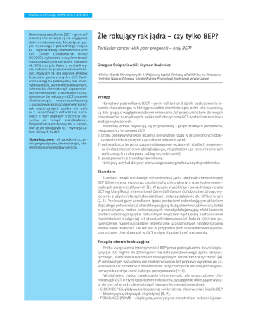 Współczesna Onkologia (2007) vol. 11; 5 (263–266) Nowotwory zarodkowe (GCT – germ cell tumors) charakteryzują się względnie dobrym rokowaniem. Niestety, w grupie wysokiego i pośredniego ryzyka GCT wg klasyfikacji International Germ Cell Cancer Collaborative Group (IGCCCG) wyleczenie z użyciem terapii standardowej jest udziałem zaledwie ok. 50% chorych. Autorzy omówili wyniki dotychczas przeprowadzonych badań, mających na celu poprawę efektów leczenia w grupie chorych z GCT. Zwrócono uwagę na potencjalną rolę intensyfikowanych, ale niemieloablacyjnych, schematów chemioterapii naprzemiennej/sekwencyjnej, stosowanych u pacjentów ze źle rokującym GCT. Leczenie chemioterapią wysokodawkowaną z następowym przeszczepieniem komórek macierzystych szpiku nie dało w 2 ukończonych dotychczas badaniach III fazy poprawy przeżyć w stosunku do terapii standardowej. Optymalizacja postępowania u pacjentów ze źle rokującym GCT wymaga zatem dalszych badań. Słowa kluczowe: rak zarodkowy, czynniki prognostyczne, chemioterapia, chemioterapia wysokodawkowana. Źle rokujący rak jądra – czy tylko BEP? Testicular cancer with poor prognosis – only BEP? Grzegorz Świątoniowski1, Szymon Brużewicz2 1 2 Klinika Chorób Wewnętrznych, 4. Wojskowy Szpital Kliniczny z Polikliniką we Wrocławiu Instytut Nauk o Zdrowiu, Szkoła Wyższa Psychologii Społecznej w Warszawie Wstęp Nowotwory zarodkowe (GCT – germ cell tumors) dzięki zastosowaniu leczenia skojarzonego, w którego składzie chemioterapia pełni rolę kluczową, są dziś grupą o względnie dobrym rokowaniu. W przeciwieństwie do innych nowotworów narządowych, większość chorych na GCT w stadium rozsiewu zostaje wyleczonych. Niemniej jednak pojawiają się przynajmniej 3 grupy istotnych problemów, związanych z leczeniem GCT: 1) próba poprawy wyników leczenia pierwszego rzutu w grupie chorych obarczonych niekorzystnymi czynnikami rokowniczymi, 2) optymalizacja leczenia uzupełniającego we wczesnych stadiach nowotworu (niebezpieczeństwo obciążającego, niepotrzebnego leczenia chorych wyleczonych z raka przez zabieg orchidektomii), 3) postępowanie z chorobą nawrotową. Niniejszy artykuł dotyczy pierwszego z zasygnalizowanych problemów. Standard Standard terapii rozsianego nienasieniaka jądra obejmuje chemioterapię BEP (bleomycyna, etopozyd, cisplatyna) z chirurgicznym usunięciem ewentualnych zmian resztkowych [1]. W grupie wysokiego i pośredniego ryzyka GCT wg klasyfikacji International Germ Cell Cancer Collaborative Group, wyleczenie z użyciem terapii standardowej dotyczy zaledwie ok. 50% chorych [2, 3]. Ponieważ guzy zarodkowe (poza postaciami z dominującym utkaniem dojrzałego potworniaka) charakteryzują się dużą chemiowrażliwością, toteż w poszukiwaniu metod polepszających niesatysfakcjonujący efekt leczenia postaci wysokiego ryzyka, naturalnym wyjściem wydaje się zastosowanie chemioterapii o większej niż standard intensywności. Jednak kliniczne potwierdzenie, nawet najbardziej teoretycznie uzasadnionych hipotez sprawia zwykle wiele trudności. Tak też jest w przypadku prób intensyfikowania pierwszorzutowej chemioterapii w GCT o złym (i pośrednim) rokowaniu. Terapia niemieloablacyjna Próba zwiększenia intensywności BEP przez podwyższenie dawki cisplatyny (ze 100 mg/m2 do 200 mg/m2) nie dała spodziewanego zysku terapeutycznego, skutkowała natomiast niewątpliwym wzrostem toksyczności [4]. W omawianym wskazaniu nie zaobserwowano też poprawy wyników po zastosowaniu schematów z ifosfamidem, przy czym podkreślana jest względnie wysoka toksyczność takiego postępowania [5–7]. Wśród wielu metod zwiększania intensywności pierwszorzutowej chemioterapii GCT o złym i pośrednim rokowaniu, szczególnie obiecujące wydają się być schematy chemioterapii naprzemiennej/sekwencyjnej: • C-BOP/BEP (cisplatyna, karboplatyna, winkrystyna, bleomycyna i 3 cykle BEP – bleomycyna, etopozyd, cisplatyna) [8, 9], • POMB/ACE (POMB – cisplatyna, winkrystyna, metotreksat w średniej daw- Współczesna Onkologia (2007) vol. 11; 5 (263–266) Relatively good prognosis is characteristic for the germ cell tumors (GCT). Nevertheless, successful treatment with standard therapy is observed only in 50% of patients with high- and intermediate-risk GCT according to the classification of Germ Cell Cancer Collaborative Group (IGCCCG). The results of recent studies oriented towards the improvement of therapeutic results in GCT patients are described in present paper. We have underlined the potential importance of the intensive, non-myeloablative, protocols of alternate chemotherapy used in poor-prognosis GCT patients. Recent two III phase trials revealed that treatment with high-dose chemotherapy with subsequent autologous hematopoietic stem-cell rescue did not improve the survivals compared to conventional therapy. Consequently, there is a need for further studies on the optimization of treatment in poor-prognosis GCT patients. Key words: germ cell tumor, prognostic factors, chemotherapy, high-dose chemotherapy. ce, bleomycyna; ACE – daktynomycyna, cyklofosfamid, etopozyd; odstęp pomiędzy cyklami – 2 tyg.) [10, 11] oraz • BOMP/EPI (BOMP – bleomycyna, winkrystyna, metotreksat w średniej dawce, cisplatyna; EPI – etopozyd, ifosfamid, cisplatyna) [12]. Niemniej dopiero potwierdzenie ich przydatności w badaniach III fazy, porównujących standard (BEP) z ramieniem badanym, może być podstawą formułowania wiążących wniosków. Badanie Christiana i wsp. [8] obejmowało 54 chorych ze źle rokującym rakiem zarodkowym, leczonych w latach 1989–2000. Analiza nie objęła pacjentów uwzględnionych w badaniu EORTC 30948. W leczeniu stosowano program C-BOP/BEP, obejmujący 6-tygodniową terapię C-BOP (cisplatyna, karboplatyna, winkrystyna, bleomycyna) i 3 cykle BEP. W wyniku prowadzonego leczenia 16 chorych (29,6%) uzyskało odpowiedź całkowitą (CR – complete response)