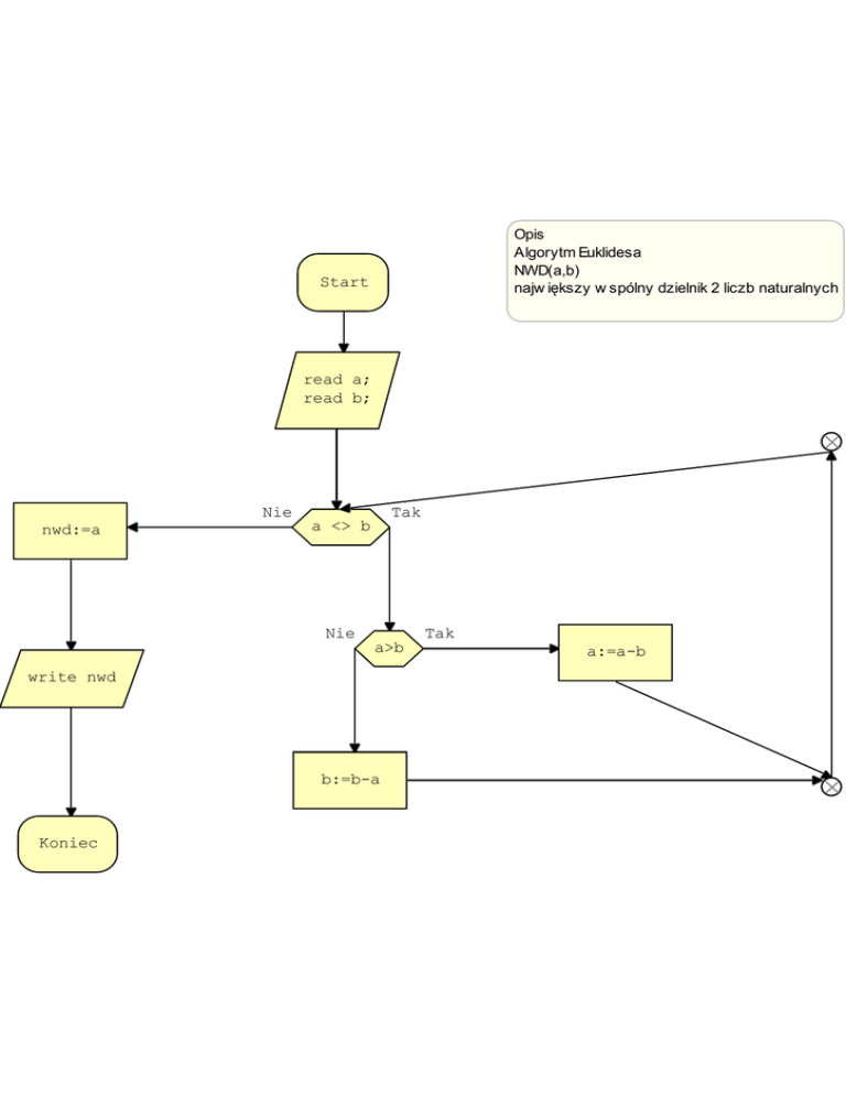 Opis Algorytm Euklidesa NWD(a,b) najw iększy w spólny dzielnik 2 liczb naturalnych Start read a; read b; Nie nwd:=a Tak a <> b Nie Tak a>b write nwd b:=b-a Koniec a:=a-b