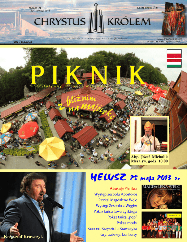 2 16 (604) 19 maja 2013 charytatywny Polsko - Węgierski Abp Józef Michalik Msza św. godz. 10.00 HELUSZ 25 maja 2013 r. Krzysztof Krawczyk Atrakcje Pikniku: Występ zespołu Apostolos Recital Magdaleny Welc Występ Zespołu z Węgier Pokaz tańca towarzyskiego Pokaz tańca „pop” Pokaz mody Koncert Krzysztofa Krawczyka Gry, zabawy, konkursy APOSTOLOS 2 Ogromny sukces dla Jarosławia! Chrystus Królem Puchar i brązowy medal dla Parafialnego Klubu Sportowego za zajęcie 3 miejsca Drużynowych Mistrzostw Polski Seniorów w tenisie stołowym w sezonie 2012/2013 Kamil Dziukiewicz Wang Zeng Yi Vitali Nekhviadovich Marek Klasek fot. Marcin Masalski Młodsi też mają sukcesy Wyniki zawodników PKS Kolping na Mistrzostwach Województwa Podkarpackiego w roku 2013 Juniorzy Hubert Żołyniak - złoty medal w mikście (06.04. Dukla); brązowy medal w deblu (z P. Oziębło) (06.04. Dukla); brązowy medal drużynowo (21.04. Nowa Sarzyna); Paweł Oziębło - brązowy medal w deblu (z H. Żołyniakiem) (06.04. Dukla); brązowy medal drużynowo (21.04. Nowa Sarzyna); Mikołaj Rejterowski - brązowy medal drużynowo (z H. Żołyniakiem i P. Oziębło) (21.04. Nowa Sarzyna); Kadeci Maksymilian Mroczka - złoty medal w mikście (14.04. Krościenko); srebrny medal drużynowo (z A. Kowalem) (20.04. Nowa Sarzyna); brązowy medal w deblu (z A. Kowalem) (14.04. Krościenko); brązowy medal indywidualnie (14.04. Krościenko); Adrian Kowal - srebrny medal drużynowo (z M. Mroczką) (21.04. Nowa Sarzyna); brązowy medal w deblu (z M. Mroczką) (14.04. Krościenko); Gabriel Woźny - srebrny medal drużynowo (z M. Mroczką i A. Kowalem) (21.04. Nowa Sarzyna); Młodzicy Antoni Rejterowski - złoty medal drużynowo (z A. Suchym) (21.04. Nowa Sarzyna); złoty medal w deblu (z A. Suchym ) (13.04. Żyraków); brązowy medal indywidualnie (13.04. Żyraków); Jakub Kondrat - złoty medal drużynowo (z A. Suchym i A. Rejterowskim) (21.04. Nowa Sarzyna); Arkadiusz Suchy - złoty medal drużynowo (z A. Rejterowskim) (21.04. Nowa Sarzyna); złoty medal w deblu (z A. Rejterowskim) (13.04. Żyraków); srebrny medal indywidualnie (13.04. Żyraków); Chrystus Królem Zapraszamy na P I K N I K 3 Organizatorzy Parafia Chrystusa Króla w Jarosławiu, Urząd Marszałkowski Województwa Podkarpackiego, Urząd Miasta Jarosławia, Starostwo W imieniu organizatorów pragniemy zaprosić na majowy piknik Powiatowe w Jarosławiu, Stowarzyszenie Rodzina Kolpinga - piękną imprezę charytatywną organizowaną przez parafię Chry- w Jarosławiu stusa Króla w Jarosławiu, Urząd Marszałkowski w Rzeszowie, Urząd Miasta Jarosławia, Starostwo Powiatowe w Jarosławiu oraz Stowarzyszenie Rodzina Kolpinga w Jarosławiu. Piknik ma charakter imprezy wojewódzkiej i jednocześnie międzynarodowej. Piknik integracyjny „Z bliźnim na majówkę” ma już kilkuletnią tradycję, która dobrze wpisała się w historię Ziemi Jarosławskiej. Spotkamy się w Ośrodku Rekreacyjno-Szkoleniowym w Heluszu, oddalonym od Jarosławia o 30 km w kierunku na Pruchnik, który jest własnością Stowarzyszenia Rodzina Kolpinga w Jarosławiu. Helusz to piękne miejsce w lasach z bardzo przyjaznym mikroklimatem, kompleksem boisk, amfiteatrem, kilkoma scenami i dużą powierzchnią zadaszoną, wyzwalające wspaniałą atmosferę podczas różnorodnych spotkań tam organizowanych. Szczególnie serdeczną atmosferę chcemy stworzyć podczas tegorocznego pikniku majowego, na którym osoby niepełnosprawne, pensjonariusze Domów Pomocy Społecznej z całego województwa, wychowankowie Domów Dziecka i dzieci ze świetlic charytatywnych będą jak zwykle Gośćmi Honorowymi. Oczywiście będzie też obecnych wiele innych osób z Jarosławia oraz z okolicznych miejscowości. Zwykle uczestników jest od 6 do 8 tysięcy, w tym około 2 tysięcy osób niepełnosprawnych i pensjonariuszy DPS. W tym roku gośćmi specjalnymi będą: Abp Józef Michalik Metropolita Przemyski i Krzysztof Krawczyk. Gośćmi specjalnymi są także dyplomaci, reprezentanci z zaproszonych krajów, parlamentarzyści, władze samorządowe. Jest to kontynuacja formuły kilku poprzednich Pikników, w których dla uszanowania gości honorowych zapraszaliśmy kolejno ambasadorów Japonii, Stanów zjednoczonych, Niemiec, Słowacji i Serbii. Tegoroczne spotkanie „Z bliźnim na majówkę” odbędzie się w sobotę 25 maja br. Każdy piknik „Z bliźnim na Majówkę” ma część poważną z oficjalnymi powitaniami, Mszą św., a później część rozrywkową z koncertami, pokazami i piknikowym jedzeniem. Głównym koncertem będzie występ Krzysztof Krawczyka. Tegoroczny program obejmuje następujące punkty: – Msza św. – przewodniczy Abp Józef Michalik – Przemówienia VIP – Zespół wokalny Apostolos – Magdalena Welc – solistka „Mam Talent” – Węgrzy – zespół wokalno-taneczny – Ognisko Baletowe – pokaz tańca – Mini UFO z MOK – pokaz tańca – Szkoła Tańca TAKT – pokaz tańca – Występ Zespołu z Węgier – taniec – Pokaz mody – Koncert Krzysztofa Krawczyka Całość programu zamyka się w godzinach 9.45 - 16.00. Wstęp dla wszystkich jest wolny. Zapraszamy! I N F O R M A T O R 1.Organizatorzy i wszyscy funkcyjni wyjeżdżają na Helusz o godz. 6.30 (własnym samochodem lub autobusem z parkingu przy FRAC-u). Na miejscu w Heluszu wszyscy powinni być do godz. 7.15. 2. Osoby posiadające bilety z kiosku, niepełnosprawni i dzieci z naszej świetlicy wyjeżdżają o godz. 7.45 - też z parkingu przy FRAC-u. 3. Organizatorzy i funkcyjni zaraz po przyjeździe zgłaszają się do Recepcji i urządzają swoje stanowiska. Pobierają również własne oznakowanie z identyfikatorem. Obsługa Pikniku przez cały czas trwania imprezy chodzi w czapeczkach. 4. Na drodze dojazdowej i na parkingach ruchem będą kierowali strażacy i trzeba się im bezwzględnie podporządkować. Parkingi dla samochodów osobowych będą na łąkach przed tablicą miejscowości „Helusz
