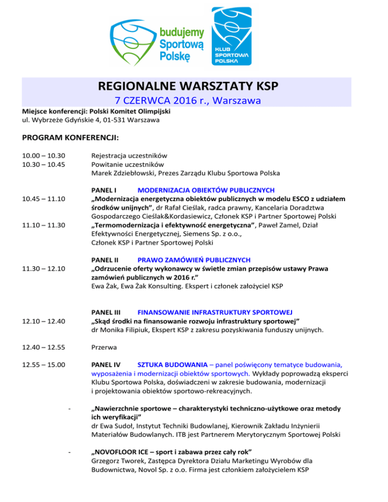 REGIONALNE WARSZTATY KSP 7 CZERWCA 2016 r., Warszawa Miejsce konferencji: Polski Komitet Olimpijski ul. Wybrzeże Gdyńskie 4, 01-531 Warszawa PROGRAM KONFERENCJI: 10.00 – 10.30 10.30 – 10.45 Rejestracja uczestników Powitanie uczestników Marek Zdziebłowski, Prezes Zarządu Klubu Sportowa Polska PANEL I MODERNIZACJA OBIEKTÓW PUBLICZNYCH „Modernizacja energetyczna obiektów publicznych w modelu ESCO z udziałem środków unijnych”, dr Rafał Cieślak, radca prawny, Kancelaria Doradztwa Gospodarczego Cieślak&Kordasiewicz, Członek KSP i Partner Sportowej Polski „Termomodernizacja i efektywność energetyczna”, Paweł Zamel, Dział Efektywności Energetycznej, Siemens Sp. z o.o., Członek KSP i Partner Sportowej Polski 10.45 – 11.10 11.10 – 11.30 PANEL II PRAWO ZAMÓWIEŃ PUBLICZNYCH „Odrzucenie oferty wykonawcy w świetle zmian przepisów ustawy Prawa zamówień publicznych w 2016 r.” Ewa Żak, Ewa Żak Konsulting. Ekspert i członek założyciel KSP 11.30 – 12.10 12.10 – 12.40 PANEL III FINANSOWANIE INFRASTRUKTURY SPORTOWEJ „Skąd środki na finansowanie rozwoju infrastruktury sportowej” dr Monika Filipiuk, Ekspert KSP z zakresu pozyskiwania funduszy unijnych. 12.40 – 12.55 Przerwa 12.55 – 15.00 PANEL IV SZTUKA BUDOWANIA – panel poświęcony tematyce budowania, wyposażenia i modernizacji obiektów sportowych. Wykłady poprowadzą eksperci Klubu Sportowa Polska, doświadczeni w zakresie budowania, modernizacji i projektowania obiektów sportowo-rekreacyjnych. - „Nawierzchnie sportowe – charakterystyki techniczno-użytkowe oraz metody ich weryfikacji” dr Ewa Sudoł, Instytut Techniki Budowlanej, Kierownik Zakładu Inżynierii Materiałów Budowlanych. ITB jest Partnerem Merytorycznym Sportowej Polski - „NOVOFLOOR ICE – sport i zabawa przez cały rok” Grzegorz Tworek, Zastępca Dyrektora Działu Marketingu Wyrobów dla Budownictwa, Novol Sp. z o.o. Firma jest członkiem założycielem KSP - - i Ambasadorem Sportowej Polski. „Aktywna Woda z Elplast + - zagospodarowanie akwenów wodnych poprzez budowę nowoczesnych kąpielisk na akwenach oraz przystani cumowniczych na bazie modułowych pomostów pływających – Elplast + Sp. z o.o.” Marzena Kern-Michalczuk, Projekt Menadżer, Elplast + Sp. z o.o. Firma jest Członkiem KSP i Partnerem Sportowej Polski „DAISY I ULTRAFILTRACJA – oszczędność wody, ścieków, prądu i ciepła” Zbigniew Wojciul, Właściciel P.P.H.U ANCHEM, Członek KSP i Ambasador Sportowej Polski „Modernizacja krytych pływalni i kąpielisk” Marek Wrzal, Prezes Zarządu, Berndorf Baderbau Sp. z o.o. Firma jest członkiem założycielem KSP i Ambasadorem Sportowej Polski „BODYS – urządzenia do ćwiczeń na świeżym powietrzu” Anna Polaniecka, Prezes Zarządu, Bodys Sp. z o.o. Firma jest członkiem KSP i Partnerem Sportowej Polski „Creator Partner – modelowa koncepcja tworzenia ośrodków rewitalizacji sprawności sportowej w oparciu o posiadaną infrastrukturę” Piotr Stelmaszewski, Product Manager, Creator Sp. z o.o. Firma jest Członkiem KSP - 15.00 – 16.00 „Tarkett - wewnętrzne systemy sportowe”, Arkadiusz Apolinarski, Commercial Segments Sales Manager, Tarkett Polska Sp. z o.o. Firma jest Członkiem KSP „Czy wybudowano już wszystko? Fakty i mity o infrastrukturze sportowej w Polsce”, Adam Horodecki, Menedżer Sprzedaży Forum Seating, Nowy Styl Group. Firma jest Członkiem KSP Obiad i rozmowy indywidualne KONSULTACJE KLUBU SPORTOWA POLSKA (zakres konsultacji podczas Regionalnych Warsztatów KSP, Warszawa 7 czerwca 2016) Termomodernizacja i efektywność energetyczna Paweł Zamel, Dział Efektywności Energetycznej, Siemens Sp. z o.o. Modernizacja energetyczna obiektów publicznych w modelu ESCO z udziałem środków unijnych dr Rafał Cieślak, radca prawny, Kancelaria Doradztwa Gospodarczego Cieślak & Kordasiewicz Źródła finansowania infrastruktury sportowej dr Monika Filipiuk, Ekspert KSP z zakresu pozyskiwania funduszy unijnych Prawo Zamówień Publicznych Ewa Żak, Właściciel Ewa Żak Konsulting, Ekspert i Członek Założyciel KSP Modernizacja krytych pływalni i kąpielisk Marek Wrzal, Prezes Zarządu, Berndorf Baderbau Sp. z o.o. DAISY I ULTRAFILTRACJA – oszczędność wody, ścieków, prądu i ciepła Zbigniew Wojciul, Właściciel P.P.H.U ANCHEM Nowoczesne systemy nawierzchni sportowych oraz posadzek przemysłowych Novofloor Grzegorz Tworek, Zastępca Dyrektora Działu Marketingu Wyrobów dla Budownictwa, Novol Sp. z o.o. Budowa lodowisk i ich właściwa pielęgnacja Zbigniew Danielczyk, Prezes Zarządu, n-ICE Group Sp. z o.o. Pozabilansowe formy finansowania inwestycji JST Adrian Kozłowski, Dyrektor ds. finansowania Jednostek Samorządu Terytorialnego, Magellan S.A. Urządzenia do ćwiczeń na świeżym powietrzu Anna Polaniecka, Prezes Zarządu, Bodys Sp. z o.o. Pielęgnacja i remonty nawierzchni sportowych w halach Wiesław Borkowicz, Dyrektor ds. Handlowych, Hemet Sp. z o.o. Nawierzchnie sportowe – charakterystyki techniczno-użytkowe oraz metody ich weryfikacji dr Ewa Sudoł, pracownik Instytutu Techniki Budowlanej Budowa infrastruktury sportowej w ramach partnerstwa publiczno-prywatnego dr Rafał Cieślak, radca prawny, Kancelaria Doradztwa Gospodarczego Cieślak & Kordasiewicz Zagospodarowanie akwenów wodnych – pomosty i baseny pływające Marzena Kern-Michalczuk, Projekt Menadżer, Elplast + Sp. z o.o. Komory kriogeniczne, komory hiperbaryczne oraz urządzenia do rehabilitacji schorzeń narządów ruchu DBC Piotr Stelmaszewski, Product Manager, Creator Sp. z o.o. Wewnętrzne nawierzchnie sportowe Arkadiusz Apolinarski, Commercial Segments Sales Manager, Tarkett Polska Sp. z o. o. Rowerowe place zabaw – PUMPTRACK Aleks Bartkowiak, Prezes Zarządu BTProject Projektowanie i budowa placów zabaw Jos Muller, Wiceprezes Zarządu, Educarium Sp. z o.o. Doradztwo, sprzedaż, serwis urządzeń czyszczących (szorowarki, zamiatarki, urządzenia myjące wysokoci