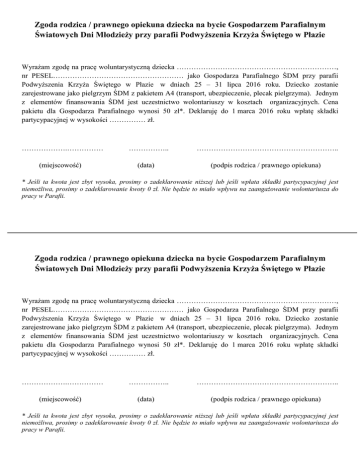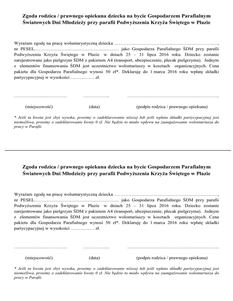 Zgoda rodzica / prawnego opiekuna dziecka na bycie Gospodarzem Parafialnym Światowych Dni Młodzieży przy parafii Podwyższenia Krzyża Świętego w Płazie Wyrażam zgodę na pracę woluntarystyczną dziecka …………………………………………………………, nr PESEL……………………………………………… jako Gospodarza Parafialnego ŚDM przy parafii Podwyższenia Krzyża Świętego w Płazie w dniach 25 – 31 lipca 2016 roku. Dziecko zostanie zarejestrowane jako pielgrzym ŚDM z pakietem A4 (transport, ubezpieczenie, plecak pielgrzyma). Jednym z elementów finansowania ŚDM jest uczestnictwo wolontariuszy w kosztach organizacyjnych. Cena pakietu dla Gospodarza Parafialnego wynosi 50 zł*. Deklaruję do 1 marca 2016 roku wpłatę składki partycypacyjnej w wysokości …………… zł. ……………….…………… (miejscowość) …………….. (data) ………………………………………………….. (podpis rodzica / prawnego opiekuna) * Jeśli ta kwota jest zbyt wysoka, prosimy o zadeklarowanie niższej lub jeśli wpłata składki partycypacyjnej jest niemożliwa, prosimy o zadeklarowanie kwoty 0 zł. Nie będzie to miało wpływu na zaangażowanie wolontariusza do pracy w Parafii. Zgoda rodzica / prawnego opiekuna dziecka na bycie Gospodarzem Parafialnym Światowych Dni Młodzieży przy parafii Podwyższenia Krzyża Świętego w Płazie Wyrażam zgodę na pracę woluntarystyczną dziecka …………………………………………………………, nr PESEL……………………………………………… jako Gospodarza Parafialnego ŚDM przy parafii Podwyższenia Krzyża Świętego w Płazie w dniach 25 – 31 lipca 2016 roku. Dziecko zostanie zarejestrowane jako pielgrzym ŚDM z pakietem A4 (transport, ubezpieczenie, plecak pielgrzyma). Jednym z elementów finansowania ŚDM jest uczestnictwo wolontariuszy w kosztach organizacyjnych. Cena pakietu dla Gospodarza Parafialnego wynosi 50 zł*. Deklaruję do 1 marca 2016 roku wpłatę składki partycypacyjnej w wysokości …………… zł. ……………….…………… (miejscowość) …………….. (data) ………………………………………………….. (podpis rodzica / prawnego opiekuna) * Jeśli ta kwota jest zbyt wysoka, prosimy o zadeklarowanie niższej lub jeśli wpłata składki partycypacyjnej jest niemożliwa, prosimy o zadeklarowanie kwoty 0 zł. Nie będzie to miało wpływu na zaangażowanie wolontariusza do pracy w Parafii.