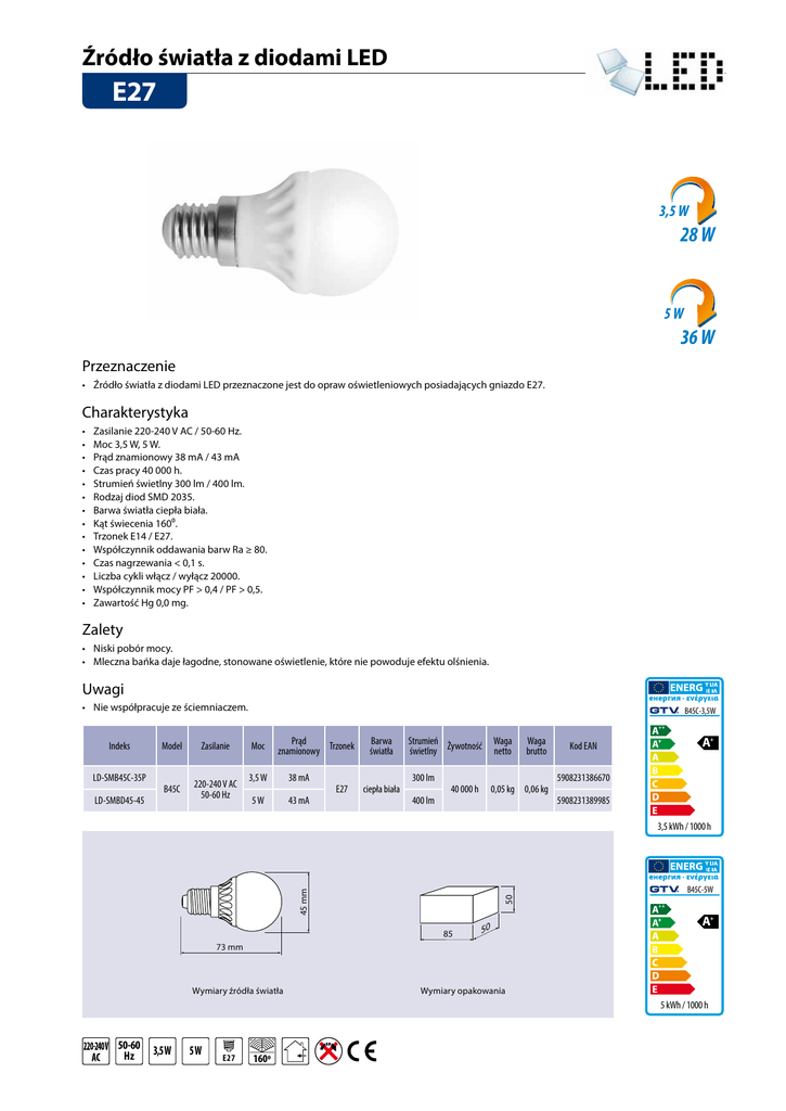 Źródło światła z diodami LED E27 3,5 W 28 W 5W 36 W Przeznaczenie • Źródło światła z diodami LED przeznaczone jest do opraw oświetleniowych posiadających gniazdo E27. Charakterystyka • • • • • • • • • • • • • • Zasilanie 220-240 V AC / 50-60 Hz. Moc 3,5 W, 5 W. Prąd znamionowy 38 mA / 43 mA Czas pracy 40 000 h. Strumień świetlny 300 lm / 400 lm. Rodzaj diod SMD 2035. Barwa światła ciepła biała. Kąt świecenia 160⁰. Trzonek E14 / E27. Współczynnik oddawania barw Ra ≥ 80. Czas nagrzewania < 0,1 s. Liczba cykli włącz / wyłącz 20000. Współczynnik mocy PF > 0,4 / PF > 0,5. Zawartość Hg 0,0 mg. Zalety • Niski pobór mocy. • Mleczna bańka daje łagodne, stonowane oświetlenie, które nie powoduje efektu olśnienia. Uwagi • Nie współpracuje ze ściemniaczem. Indeks LD-SMB45C-35P LD-SMBD45-45 Model Zasilanie B45C 220-240 V AC 50-60 Hz B45C-3,5W Moc Prąd znamionowy Trzonek 3,5 W 38 mA 5W 43 mA E27 Barwa światła ciepła biała Strumień Żywotność świetlny 300 lm 400 lm 40 000 h Waga netto Waga brutto 0,05 kg 0,06 kg Kod EAN 5908231386670 5908231389985 3,5 kWh / 1000 h 50 45 mm B45C-5W 85 50 73 mm Wymiary źródła światła Wymiary opakowania 5 kWh / 1000 h 50-60 Hz 3,5 W 5W E27 160o