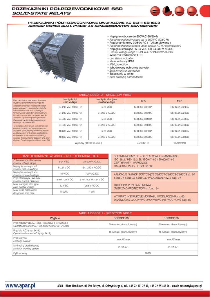 PRZEKA½NIKI PÓPRZEWODNIKOWE SSR SOLID-STATE RELAYS PRZEKA½NIKI PÓPRZEWODNIKOWE DWUFAZOWE AC SERII SSRSC2 SSRSC2 SERIES DUAL PHASE AC SEMICONDUCTOR CONTACTORS • NapiÚcie robocze do 600VAC-50/60Hz • Rated operational voltage up to 600VAC-50/60 Hz • PrÈd znamionowy 30/50A-AC1 ( Akumulowany ) • Rated operational current up to 30/50A-AC1( Accumulated ) • NapiÚcie sterujÈce : 5-24 VDC lub 24-230 V AC/DC • Control voltage range : 5-24 VDC or 24-230 V AC/DC • Wskaěnik zadziaïania LED • Led status indication • Klasa ochrony IP20 • IP20 protection • Wbudowany ochronny warystor • Built-in varistor protection • ZaïÈczanie w zerze • Zero crossing commutation TABELA DOBORU - SELECTION TABLE Dwa niezaleĝne sterowania 1-fazowe stycznika póïprzewodnikowego do zaïÈczania róĝnego rodzaju obciÈĝeñ przemysïowych – grzejników, silników i lamp w ukïadach 1- i 3-fazowych. Unikalny pod wzglÚdem elektrycznym i termicznym projekt zapewnia wysokÈ zdolnoĂÊ ïÈczeniowÈ i duĝÈ trwaïoĂÊ. ZaïÈczenie w stanie beznapiÚciowym redukuje zakïócenia RFI. Two independent single semiconductor contactors designed to switch various industrial loads,heating elements,motors and lamps in 1 or 3 phase applications. Unique electronic and thermal design ensures high switching capacity and long lifetime. Zero Voltage turn-On reduces RFI. NapiÚcie lini Line voltage NapiÚcie sterujÈce Control voltage 30 A 50 A 24-240 VAC 50/60 Hz 5-24 VDC SSRSC2-30240A SSRSC2-50240A 24-240 VAC 50/60 Hz 24-230 V AC/DC SSRSC2-30240C SSRSC2-50240C 24-480 VAC 50/60 Hz 5-24 VDC SSRSC2-30480A SSRSC2-50480A 24-480 VAC 50/60 Hz 24-230 V AC/DC SSRSC2-30480C SSRSC2-50480C 48-600 VAC 50/60 Hz 5-24 VDC SSRSC2-30600A SSRSC2-50600A 48-600 VAC 50/60 Hz 24-230 V AC/DC SSRSC2-30600C SSRSC2-50600C 45/128/110 90/128/110 Wymiary ( B x H x L mm ) DANE TECHNICZNE WEJ¥CIA - INPUT TECHNICAL DATA Zakres napiÚÊ sterowania Control voltage range NapiÚcie sterujÈce zaï. Control pick-up voltage NapiÚcie sterujÈce wyï. Control drop-out voltage PrÈd stereujÈcy / VA max. Control current / VA max Max. napiÚcie sterujÈce Max. control voltage Max. czas odpowiedzi Response time max. 5-24 V DC 24-230 V AC/DC 5...24 V DC 24...240 V AC/DC 1,5 V DC 7,2 V AC/DC 15 mA - 24 V DC 6 mA /1,5 VA - 24 V DC 32 V DC 253 V AC/DC ½ cyklu 1 cykl SPENIA NORMY EC - EC REFERENCE STANDARDS: IEC158-2 / HD419.2-SI / IEC947-4-3 / EN60947-4-3 CERTYFIKATY - APPROVALS CAN/CSA-C22.2 / UL Sdt No.508 APLIKACJE I UWAGI DOTYCZkCE SSRSC1-SSRSC2-SSRSC3 str. 34 SSRSC1-SSRSC2-SSRSC3 APPLICATION HINTS pag. 34 OCHRONA PRZECIk¿ENIOWA OVERLOAD PROTECTION str./pag. 34 WYMIARY, INSTRUKCJE MONTA¿U I PODkCZENIA str. 60 DIMENSIONS, MOUNTING AND WIRING INSTRUCTIONS pag. 60 TABELA DOBORU - SELECTION TABLE WyjĂcie SSRSC2-30…. SSRSC2-50…. PrÈd roboczy dla AC1 (np. 1x30/1x50 o 2x15/2x25 ) Operational current AC1(eg.1x30/1x50 or 2x15/2x50 ) 30 A max.( akumulowany ) 50 A max.( akumulowany ) PrÈd dla AC3 ( np. 2x15 ) Operational current AC3 ( eg. 2x15 ) 15 A max.( akumulowany ) 15 A max.( akumulowany ) 1 mA AC max. 1 mA AC max. 10 mA AC 10 mA AC PrÈd upïywu Leakage current Minimalny prÈd roboczy Minimun working current Cykl roboczy 100% PRZEKA½NIKI PÓPRZEWODNIKOWE SSR SOLID-STATE RELAYS Spadek prÈdu w funkcji wzrostu temperatury. Przy pracy w temperaturze otoczenia powyĝej 40°C i prÈdzie obciÈĝenia AC-1, maksymalny prÈd obniĝa siÚ tak jak to wskazuje tabela. Current derating in high temperature applications. For operation in ambient temperatures exceeding 40°C at the AC 1 Load the current must be derated as shown in the table. Spadek prÈdu obciÈĝenia - Current derating SSRSC2-30…. SSRSC2-50…. TA =40° C 30 A 50 A TA =50° C 25 A 40 A TA =60° C 20 A 30 A DANE TECHNICZNE WEJ¥CIE/WYJ¥CIE DANE TERMICZNE - THERMAL DATA Temperatura robocza Operating temperature Temperatura skïadowania Storage temperature Metoda chïodzenia Cooling method Montaĝ Mounting INPUT / OUTPUT TECHNICAL DATA -5 ÷ 60°C NapiÚcie izlolacji Rated insulation voltage Uimp. 4 kV -20 ÷ 80°C Znamionowe impuls. nap. izol. Rated impulse withstand voltage Ui 660 V Naturalna Natural convection Pionowy +/-30% Vertical +/-30% SCHEMAT PODkCZENIA - WIRING DIAGRAM Konektory gïówne 1/L1-2/T1 & 3/L2-4/T2 Konektory sterowania A1-A2-A3-A4 Konektory 11 i 12 nie sÈ poïÈczone z wewnÚtrznym obwodem; sÈ przeznaczone do podïÈczenia opcjonalnej ochrony termicznej. Main terminals 1/L1-2/T1 & 3/L2-4/T2. Control terminals A1 A4. Terminal 11 and 12 have no connection with the internal cir uit but are intended for connection to the optional thermal over load protection. OCHRONA PRZED PRZECIk¿ENIEM TERMICZNYM - THERMAL OVERLOAD PROTECTION Opcjonalna ochronÚ termicznÈ zapewnia poddïÈczenie termostatu w slocie po prawej stronie stycznika. Do stycznika pasujÈ 2 typy termostatów: UP62- 90( UCHIYA ) i P62-90 ( LIMITATOR ) Optional thermal overload protection is achieved by inserting a thermostat in the slot on the right hand side of the contactor. The contactor accepts 2 types of thermostatats : UP-62-90 from Uchiya or P62-90 from Limitator. APAR, 02-699 Warszawa, ul. Kłobucka 8, paw. 119, tel. 022 853 49 30, 022 853 48 56, fax 022 607 99 50, e-mail [email protected], www.apar.pl