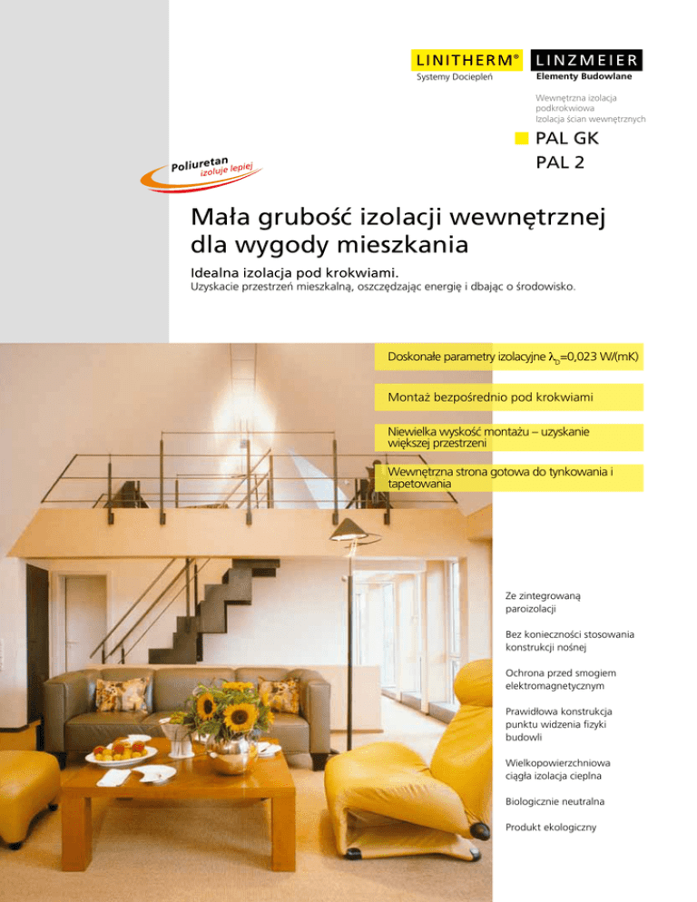 LINITHERM ® LINZMEIER Systemy Dociepleń Elementy Budowlane Wewnętrzna izolacja podkrokwiowa Izolacja ścian wewnętrznych PAL GK PAL 2 Mała grubość izolacji wewnętrznej dla wygody mieszkania Idealna izolacja pod krokwiami. Uzyskacie przestrzeń mieszkalną, oszczędzając energię i dbając o środowisko. Doskonałe parametry izolacyjne λD=0,023 W/(mK) Montaż bezpośrednio pod krokwiami Niewielka wyskość montażu – uzyskanie większej przestrzeni Wewnętrzna strona gotowa do tynkowania i tapetowania Ze zintegrowaną paroizolacji Bez konieczności stosowania konstrukcji nośnej Ochrona przed smogiem elektromagnetycznym Prawidłowa konstrukcja punktu widzenia fizyki budowli Wielkopowierzchniowa ciągła izolacja cieplna Biologicznie neutralna Produkt ekologiczny L I N Z M E I E R LINITHERM ® Elementy Budowlane Systemy Dociepleń Budowanie bez placu budowy Komfort mieszkania pod dachem Przestrzeń mieszkalna jest ważna i kosztowna. Wnętrza poddaszy oferują dodatkową przestrzeń. Już przy nachyleniu dachu dobudówki wynoszącym 25° - przy wystarczającej ściance kolankowej nawet od 12°, przy nachyleniu dachu 50° macie Państwo pod dachem przestrzeń wystarczjącą na dwa piętra. Jeśli robicie Państwo nowy dach, to polecamy izolację na krokwiach. Tam, gdzie to niemożliwe, elementy izolacyjne systemu LINITHERM łatwo, szybko i z oszczędnością miejsca, stworzą pod krokwiami dodatkową szczelną izolację bez mostków cieplnych. Zalety dla budujących nowy i remontujących stary dom: • oszczędność czasu i redukcja kosztów dzięki mniejszej ilości procesów roboczych • proste wykonanie i obróbka • możliwość wykończeniowego tynkowania i tapetowania • zysk przestrzeni mieszkalnej dzieki cienkiej konstrukcji • aluminiowa warstwa stanowi ochronę przed smogiem elektrycznym • Doskonała, bezpieczna konstrukcja z punktu widzenia fizyki budowli • Również jako konstrukcja F 30 B • nowe budownictwo: niższe koszty materiału dzięki małym przekrojom krokwi • stare budownictwo: nie trzeba montować dodatkowych krokwi, „stara izolacja“ pomiędzy krokwiami i stare okładziny zostają i nie trzeba ich usuwać ani utylizować LINITHERM PAL GK, izolacja pod krokwiami to coś wyjątkowego! Zapomnijcie o wszystkim, o czym trzeba było pamiętać przy standardowych izolacjach ponieważ w systemach izolacyjnych LINITHERM zostało zawarte wszystko na raz: Doskonałe parametry izolacyjne przy minimalnych grubościach twardej pianki PUR/PIR λD = 0,023 W/(mK) Efektywna ochrona przed upałem i stratami ciepła. Ochrona paroszczelna, żeby wilgoć nie miała żadnych szans. Przemyślany system krawędzi, żeby osiągnąć doskonałą szczelność. Systemy izolacyjne LINITHERM można obrabiać i mocować tak szybko jak drewno. Z izolacją międzykrokwiową klasy materiałowej A1 uzyskacie Państwo konstrukcję F30B (patrz atest) Bez dodatkowego rusztu z łat. Stabilność płyty umożliwia pracę na krokwiach do 87 cm! Płyty z kartonogipsu (GK) są gotowe do tynkowania i tapetowania. Przede wszystkim macie Państwo naszą 100% gwarancję: Używamy wyłącznie twardej pianki PUR/PIR własnej produkcji z kontrolowaną jakością, nie zawierającej formaldehydów ani włókien według PN-EN . twarda pianka PUR/PIR jest odporna na gnicie, wytrzymała na nacisk, obojętna i neutralna pod względam zapachu. LINITHERM PAL 2L ze zintegrowanym łaceniem również z drewnianym obiciem Całkowita budowa przy standardowej izolacji cieplnej Łączna budowa z LINITHERM PAL GK Łączna budowa z LINITHERM PAL GK Grubość krokwi 260 mm Izolacja między krokwiami 260 mm wełna mineralna [λD=0,035 W/(mK)] dodatkowa paroizolacja, ruszt z łat oraz płyty z kartonogipsu: wartość U = 0,18 W/(m2K) Grubość krokwi 180 mm Izolacja między krokwiami 180 mm wełna mineralna [λD=0,035 W/(mK)] LINITHERM L+D folia LINITHERM PAL GK 39,5 mm z paroizolacją pod krokwiami: wartość U=0,18 W/(m2K) Grubość krokwi 140 mm Izolacja między krokwiami 100 mm wełna mineralna [λD=0,035 W/(mK)] ewentualna istniejąca paroizolacja, ruszt żerdziowy oraz płyta z kartonogipsu (ilustracja powyżej) lub deskowanie drewniane z połączeniem piórowpust (ilustracja poniżej) LINITHERM PAL GK 49,5 mm: wartość U = 0,24 W/(m2K) 299,5 mm 219,5 mm 189,5 mm LINITHERM ® L I N Z M E I E R Systemy Dociepleń Nowe budownictwo Kombinowana izolacja cieplna między i pod krokwiami lub belkowaniem dachowym Straty ciepła przez krokwie Uzyskanie przestrzni, oszczędność ciepła LINITHERM PAL GK ze zintegrowanym łaceniem Wada: Jeżeli izolujemy wyłącznie pomiędzy krokwiami, w wyniku wyższego przewodnictwa cieplnego drewna, powstaną mostki cieplne. Z izolacją pomiędzy krokwiami LINITHERM PAL GK pod krokwiami wasze poddasze jest optymalnie chronione przd upałem i zimnem. Żeby wystarczająco izolować potrzebujemy większych przekrojów krokwi. To powoduje podwyższenie kosztów materiału oraz utratę przestrzeni. Ze względu na konieczność dodatkowej konstrukcji rusztu i płyty gipsowo-kartonowej tracimy jeszcze więcej przestrzeni. Dzięki wysoce skutecznej twardej piance PUR/PIR uzyskacie Państwo ogromny wzrost parametrów izolacyjnych już przy najmniejszych grubościach. Przekroje krokwi mogę być o wiele mniejsze. Jeśli krokwie nie są w jednej linii, system LINITHERM PAL GK ze zintegrowanym łaceniem zadba o ich wyrównanie. Potrzebny w innych przypadkach ruszt z łat tutaj nie jest konieczny. Śruby regulacyjne pozwalają wyrównać krzywizny. LINITHERM PAL GK można łatwo przykręcić pod krokwiami. Przez połączenie zaciskowe piórowpust powstaje wolna od mostków cieplnych warstwa izolacji. Płyta z kartonogipsu tworzy czyste wykończenie powierzchni. Stare Budownictwo Polepszenie istniejącej izolacji międzykrokwiowej przy pomocy LINITHERM PAL GK pod krokwiami lub belkowaniem dachowym Prawidłowa izolacja zagwarantuje odpowiedni komfort mieszkania Często w domach istnieje ju