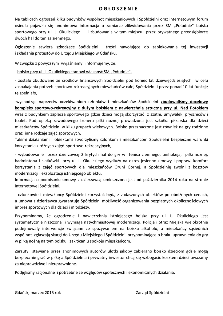 OGŁOSZENIE Na tablicach ogłoszeń kilku budynków wspólnot mieszkaniowych i Spółdzielni oraz internetowym forum osiedla pojawiła się anonimowa informacja o zamiarze zlikwidowania przez SM „Południe” boiska sportowego przy ul. L. Okulickiego i zbudowania w tym miejscu przez prywatnego przedsiębiorcę dwóch hal do tenisa ziemnego. Ogłoszenie zawiera szkodzące Spółdzielni treści nawołujące do zablokowania tej inwestycji i składania protestów do Urzędu Miejskiego w Gdańsku. W związku z powyższym wyjaśniamy i informujemy, że: - boisko przy ul. L. Okulickiego stanowi własność SM „Południe”, - zostało zbudowane ze środków finansowych Spółdzielni pod koniec lat dziewięćdziesiątych w celu zaspakajania potrzeb sportowo-rekreacyjnych mieszkańców całej Spółdzielni i przez ponad 10 lat funkcję tę spełniało, -wychodząc naprzeciw oczekiwaniom członków i mieszkańców Spółdzielni zbudowaliśmy docelowy kompleks sportowo-rekreacyjny z dużym boiskiem z nawierzchnią sztuczną przy ul. Nad Potokiem wraz z budynkiem zaplecza sportowego gdzie dzieci mogą skorzystać z szatni, umywalek, pryszniców i toalet. Pod opieką zawodowego trenera piłki nożnej prowadzona jest szkółka piłkarska dla dzieci mieszkańców Spółdzielni w kilku grupach wiekowych. Boisko przeznaczone jest również na gry rodzinne oraz inne rodzaje zajęć sportowych. Takimi działaniami i obiektami stworzyliśmy członkom i mieszkańcom Spółdzielni bezpieczne warunki korzystania z różnych zajęć sportowo-rekreacyjnych, - wybudowanie przez dzierżawcę 2 krytych hal do gry w tenisa ziemnego, unihokeja, piłki nożnej, badmintona i siatkówki przy ul. L. Okulickiego wydłuży na okres jesienno-zimowy i poprawi komfort korzystania z zajęć sportowych dla mieszkańców Oruni Górnej, a Spółdzielnię zwolni z kosztów modernizacji i eksploatacji istniejącego obiektu. Informacja o podpisaniu umowy z dzierżawcą umieszczona jest od października 2014 roku na stronie internetowej Spółdzielni, - członkowie i mieszkańcy Spółdzielni korzystać będą z zadaszonych obiektów po obniżonych cenach, a umowa z dzierżawca gwarantuje Spółdzielni możliwość organizowania bezpłatnych okolicznościowych imprez sportowych dla dzieci i młodzieży. Przypominamy, że ogrodzenie i nawierzchnia istniejącego boiska przy ul. L. Okulickiego jest systematycznie niszczona i wymaga natychmiastowej modernizacji. Policja i Straż Miejska wielokrotnie podejmowały interwencje związane ze spożywaniem na boisku alkoholu, a mieszkańcy sąsiednich wspólnot zgłaszają skargi do Urzędu Miejskiego i Spółdzielni przypominające o braku uprawnienia do gry w piłkę nożną na tym boisku i zakłócaniu spokoju mieszkańcom. Zarzuty stawiane przez anonimowych autorów ulotki jakoby zabierano boisko dzieciom gdzie mogą bezpiecznie grać w piłkę a Spółdzielnia i prywatny inwestor chcą się wzbogacić kosztem dzieci uważamy za nieprawdziwe i nieuprawnione. Podjęliśmy racjonalne i potrzebne ze względów społecznych i ekonomicznych działania. Gdańsk, marzec 2015 rok Zarząd Spółdzielni