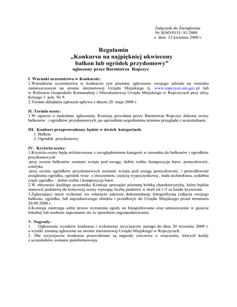 Załącznik do Zarządzenia Nr SOiO/0151/ 81/2008 z dnia 23 kwietnia 2008 r. Regulamin ,,Konkursu na najpiękniej ukwiecony balkon lub ogródek przydomowy” ogłoszony przez Burmistrza Ropczyc I Warunki uczestnictwa w Konkursie: 1.Warunkiem uczestnictwa w konkursie jest pisemne zgłoszenie swojego udziału na wniosku zamieszczonym na stronie internetowej Urzędu Miejskiego tj. www.ropczyce.um.gov.pl lub w Referacie Gospodarki Komunalnej i Mieszkaniowej Urzędu Miejskiego w Ropczycach przy ulicy Krisego 1 pok. Nr 9. 2.Termin składania zgłoszeń upływa z dniem 20 maja 2008 r. II. Termin oceny: 1.W oparciu o nadesłane zgłoszenia, Komisja powołana przez Burmistrza Ropczyc dokona oceny balkonów i ogródków przydomowych, po uprzednim uzgodnieniu terminu przeglądu z uczestnikami. III. Konkurs przeprowadzony będzie w dwóch kategoriach: 1. Balkon 2. Ogródek przydomowy IV. Kryteria oceny: 1.Kryteria oceny będą zróŜnicowane z uwzględnieniem kategorii w stosunku do balkonów i ogródków przydomowych -przy ocenie balkonów zostanie wzięte pod uwagę: dobór roślin, kompozycja barw, pomysłowość, estetyka, -przy ocenie ogródków przydomowych zostanie wzięta pod uwagę pomysłowość, i prawidłowość urządzenia ogródka, ogródek wraz z otoczeniem, częścią wypoczynkową , mała architektura, ozdobna część ogródka – dobór roślin i kompozycja barw. 2.W obecności kaŜdego uczestnika Komisja sporządzi pisemną krótką charakterystykę, która będzie stanowić podstawę do końcowej oceny wpisując liczbę punktów w skali od 1-5 za kaŜde kryterium. 3.Zgłaszający moŜe wykonać we własnym zakresie dokumentację fotograficzną (zdjęcia swojego balkonu, ogródka, lub najciekawszego obiektu i przedłoŜyć do Urzędu Miejskiego przed terminem 20.09.2008 r. 4.Komisja zastrzega sobie prawo wyraŜenia zgody na fotografowanie oraz umieszczenie w gazecie lokalnej lub osobiste zapoznanie sie ze sposobem zagospodarowania. V. Nagrody: 1. Ogłoszenie wyników konkursu i wyłonienie zwycięzców nastąpi do dnia 20 września 2008 r. a wyniki zostaną ogłoszone na stronie internetowej Urzędu Miejskiego w Ropczycach. 2. Dla zwycięzców konkursu przewidziane są nagrody rzeczowe o wręczeniu, których kaŜdy z uczestników zostanie poinformowany.