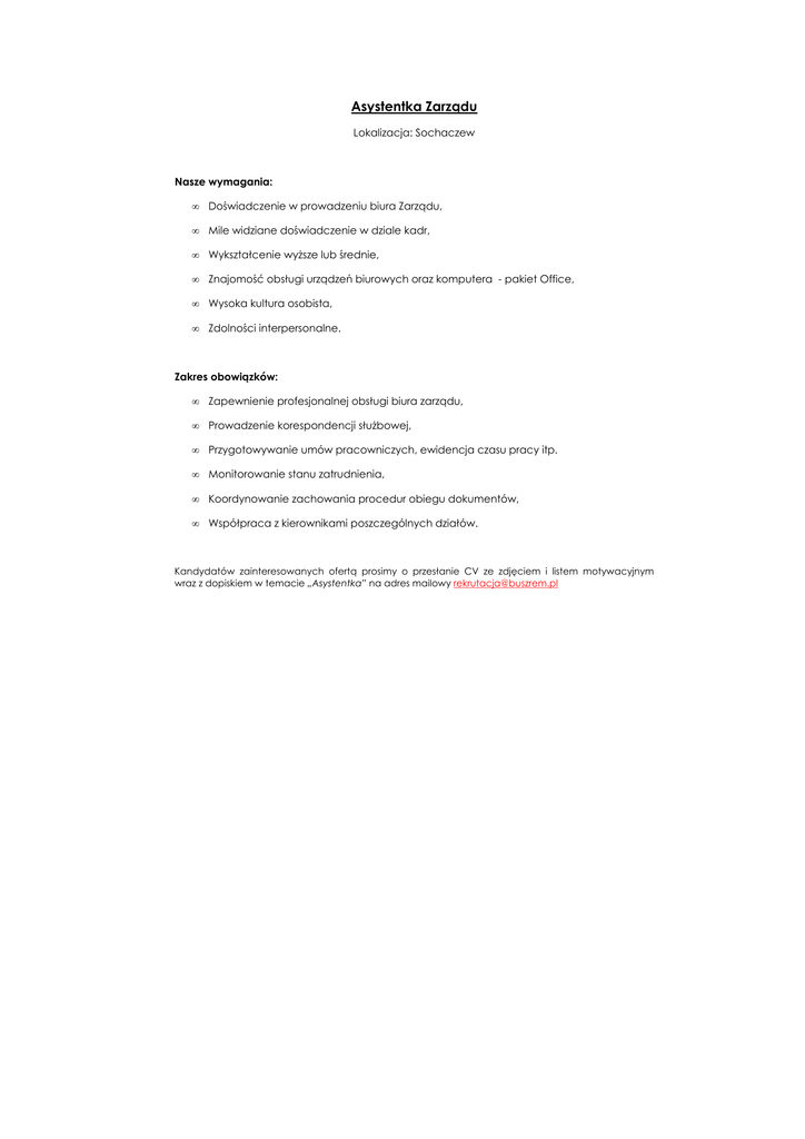 Asystentka Zarządu Lokalizacja: Sochaczew Nasze wymagania: • Doświadczenie w prowadzeniu biura Zarządu, • Mile widziane doświadczenie w dziale kadr, • Wykształcenie wyższe lub średnie, • Znajomość obsługi urządzeń biurowych oraz komputera - pakiet Office, • Wysoka kultura osobista, • Zdolności interpersonalne. Zakres obowiązków: • Zapewnienie profesjonalnej obsługi biura zarządu, • Prowadzenie korespondencji służbowej, • Przygotowywanie umów pracowniczych, ewidencja czasu pracy itp. • Monitorowanie stanu zatrudnienia, • Koordynowanie zachowania procedur obiegu dokumentów, • Współpraca z kierownikami poszczególnych działów. Kandydatów zainteresowanych ofertą prosimy o przesłanie CV ze zdjęciem i listem motywacyjnym wraz z dopiskiem w temacie „Asystentka” na adres mailowy [email protected]