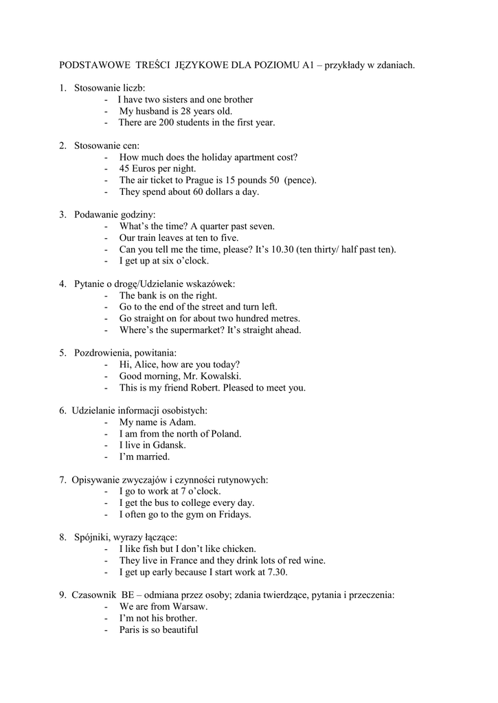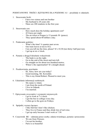 PODSTAWOWE TREŚCI JĘZYKOWE DLA POZIOMU A1 – przykłady w zdaniach. 1. Stosowanie liczb: - I have two sisters and one brother - My husband is 28 years old. - There are 200 students in the first year. 2. Stosowanie cen: - How much does the holiday apartment cost? - 45 Euros per night. - The air ticket to Prague is 15 pounds 50 (pence). - They spend about 60 dollars a day. 3. Podawanie godziny: - What’s the time? A quarter past seven. - Our train leaves at ten to five. - Can you tell me the time, please? It’s 10.30 (ten thirty/ half past ten). - I get up at six o’clock. 4. Pytanie o drogę/Udzielanie wskazówek: - The bank is on the right. - Go to the end of the street and turn left. - Go straight on for about two hundred metres. - Where’s the supermarket? It’s straight ahead. 5. Pozdrowienia, powitania: - Hi, Alice, how are you today? - Good morning, Mr. Kowalski. - This is my friend Robert. Pleased to meet you. 6. Udzielanie informacji osobistych: - My name is Adam. - I am from the north of Poland. - I live in Gdansk. - I’m married. 7. Opisywanie zwyczajów i czynności rutynowych: - I go to work at 7 o’clock. - I get the bus to college every day. - I often go to the gym on Fridays. 8. Spójniki, wyrazy łączące: - I like fish but I don’t like chicken. - They live in France and they drink lots of red wine. - I get up early because I start work at 7.30. 9. Czasownik - BE – odmiana przez osoby; zdania twierdzące, pytania i przeczenia: We are from Warsaw. I’m not his brother. Paris is so beautiful - Are you a student? Yes, I am. It was very interesting. Where were you born? I wasn’t late for the meeting. 10. Tryb rozkazujący – prośby, polecenia: - Come in, please. - Take care! - Don’t smoke in here. - Please don’t wait for me. 11. Pytania ogólne (Yes/No): - Is she your friend? - Do you like cooking? - Can you help me? - Did you sleep well? - Are you waiting for me? - Were you born in Warsaw? 12. Pytania szczegółowe (WH-questions): - What time is it? - Where does he live? - When did you come? - How much did it cost? - How old were they? - What are you doing here? 13. Czas present simple: - We eat fruit every day. - She lives in a family house. - I don’t speak German. - Do you work on Saturdays? 14. Czas present continuous: - Tom is studying psychology at Warsaw university. - Look! It’s raining again. - Are you watching the match? 15. Czas past simple: - After lunch we went for a walk. - She fell and broke her arm. - I worked with Anna for three years. - Did you like the concert? - We didn’t take a taxi. 16. Forma BE GOING TO: - My son is going to study medicine. - I’m going to stop smoking. - Are you going to take a credit? - It’s going to rain. 17. WOULD - LIKE: I’d like a cup of coffee. Would you like to go home? We’d like to stay here. 18. FORMA - -ING z czasownikami like/love/hate/go/do: I love dancing. She hates getting up early. Do you go skiing every year? I did some cooking last night. 19. Czasownik modalny CAN: - I can’t play snooker. (umiejętność). - Can/Could I use your computer? (pozwolenie). - Can I have a double espresso, please. (prośba) - We can’t open it. We don’t have the key. (możliwość) 20. Rzeczowniki policzalne i niepoliczalne z oznacznikami ilości i przedimkami: - He is a nice boy. - Boys wear trousers. - How many boys played the game? - There are some boys in the classroom. - How much money do you need? - Money makes the world go around. - We bought a water melon and some cheese. 21. There is/There are/ There was/There were: - There’s a cash machine near the supermarket. - Is there a flower shop near here? - There aren’t any passengers on the train. - There was a storm last night. - Were there any problems with your visas? 22. Zaimki osobowe: - We bought a new computer. - Help them, please. - Sorry, I broke it yesterday. - She gives us some magazines to read. 23. Przymiotniki dzierżawcze: - This is my seat. - Where is your umbrella? - Our house is quite old. 24. Zaimki dzierżawcze: - Is this bag yours? - No, it isn’t mine. - Leave your books but take theirs. 25. Dopełniacz “s”: - It is Mary’s turn to wash up. - My sister’s son is ten years old. - This is the teachers’ room. 26. Przyimki czasu: - See you on Monday. - I was born in December. - The lecture starts at 8 o’clock. - We lived in Krakow for five years. - I’m going to work at the weekend. 27. Przyimki miejsca i ruchu: - He is sitting at the table. - There are no pictures on the walls. - My friends live in Chicago. - Alice found the key under the table. - I’m going to the cinema now. - Tom came from London yesterday. 28. Przedimek nieokreślony/określony/ brak przedimka: - I need a pencil. - Books are quite expensive. - Is there a computer in the room? - I don’t drink beer. Can I have a coffee? - Your jacket is on the chair. - I feel tired. I’m going to bed. - We can have lunch at 13.00. 29. Określanie ilości: - Children need a lot of sleep. - Do you have any cheese? - We’d like some ice-cream. - How much is it? - I don’t have many friends in Warsaw. 30. Zaimki wskazujące bliższe i dalsze: - This cake is really tasty. - What did that man want? - These people are waiting for you. - Those houses are very modern. 31. Stopień wyższy i najwyższy przymiotnika: - Mary is shorter than her sister. - I’m better at speaking. - Tom is the youngest in the class. - Skiing is more difficult that snowboarding. 32. Przysłówki częstotliwości: - We always have breakfast. - Sue sometimes goes fishing with her brother. - They never ask for help. 33. Zaimki pytajne: - Who are you? - How old are you? - Where are you from? - What’s your name? - Why are you late? 34. Przysłówki stopnia/intensywności: - It’s a very good book. - I’m really sorry. - He is quite nice. 35. Kraje, narodowości: - Allan is English but he lives in Ireland. - Lots of Polish people work in Great Britain, Germany and the USA. 36. Informacje os