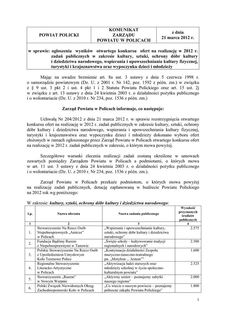 POWIAT POLICKI KOMUNIKAT ZARZĄDU POWIATU W POLICACH z dnia 21 marca 2012 r. w sprawie: ogłoszenia wyników otwartego konkursu ofert na realizację w 2012 r. zadań publicznych w zakresie kultury, sztuki, ochrony dóbr kultury i dziedzictwa narodowego, wspierania i upowszechniania kultury fizycznej, turystyki i krajoznawstwa oraz wypoczynku dzieci i młodzieży Mając na uwadze brzmienie art. 8a ust. 3 ustawy z dnia 5 czerwca 1998 r. o samorządzie powiatowym (Dz. U. z 2001 r. Nr 142, poz. 1592 z późn. zm.) w związku z § 9 ust. 3 pkt 2 i ust. 4 pkt 1 i 2 Statutu Powiatu Polickiego oraz art. 15 ust. 2j w związku z art. 13 ustawy z dnia 24 kwietnia 2003 r. o działalności pożytku publicznego i o wolontariacie (Dz. U. z 2010 r. Nr 234, poz. 1536 z późn. zm.) Zarząd Powiatu w Policach informuje, co następuje: Uchwałą Nr 204/2012 z dnia 21 marca 2012 r. w sprawie rozstrzygnięcia otwartego konkursu ofert na realizację w 2012 r. zadań publicznych w zakresie kultury, sztuki, ochrony dóbr kultury i dziedzictwa narodowego, wspierania i upowszechniania kultury fizycznej, turystyki i krajoznawstwa oraz wypoczynku dzieci i młodzieży dokonano wyboru ofert złożonych w ramach ogłoszonego przez Zarząd Powiatu w Policach otwartego konkursu ofert na realizację w 2012 r. zadań publicznych w zakresie, o którym mowa powyżej. Szczegółowe warunki zlecenia realizacji zadań zostaną określone w umowach zawartych pomiędzy Zarządem Powiatu w Policach a podmiotami, o których mowa w art. 11 ust. 3 ustawy z dnia 24 kwietnia 2003 r. o działalności pożytku publicznego i o wolontariacie (Dz. U. z 2010 r. Nr 234, poz. 1536 z późn. zm.). Zarząd Powiatu w Policach przekaże podmiotom, o których mowa powyżej na realizację zadań publicznych, dotację zaplanowaną w budżecie Powiatu Polickiego na 2012 rok wg poniższego: W zakresie: kultury, sztuki, ochrony dóbr kultury i dziedzictwa narodowego: Lp. 1 1. 2. 3. 4. 5. 6. Nazwa oferenta 2 Stowarzyszenie Na Rzecz Osób Niepełnosprawnych „Amicus” w Policach Fundacja Bądźmy Razem z Niepełnosprawnymi w Tanowie Polskie Stowarzyszenie Na Rzecz Osób z Upośledzeniem Umysłowym Koło Terenowe Police Regionalne Stowarzyszenie Literacko-Artystyczne w Policach Stowarzyszenie „Razem” w Nowym Warpnie Polski Związek Niewidomych Okręg Zachodniopomorski Koło w Policach Nazwa zadania publicznego 3 „Wspieranie i upowszechnianie kultury, sztuki, ochrony dóbr kultury i dziedzictwa narodowego” „Święto szkoły – kultywowanie tradycji regionalnych i narodowych” „Kontynuacja działalności Zespołu muzyczno-taneczno-teatralnego pn. „Motylem ... Jestem”” „Aktywizacja ludzi starszych oraz młodzieży szkolnej w życiu społecznokulturalnym powiatu” „Aktywny senior – poznajemy zabytki naszego regionu” „Co wiecie o naszym powiecie – poznajemy północne zakątki Powiatu Polickiego” Wysokość przyznanych środków publicznych 4 2.575 2.500 1.600 2.525 2.000 1.800 1 1 7. 8. 9. 2 Policki Uniwersytet Trzeciego Wieku w Policach Stowarzyszenie Przyjaciół Ziemi Polickiej „Skarb” w Policach Stowarzyszenie Na Rzecz Osób Niepełnosprawnych „Amicus” w Policach 3 4 „ Ochrona dziedzictwa regionalnego oraz kultury ludowej Powiatu Polickiego” „Konserwacja zabytków, uzupełnienie wystawy w muzeum historycznym „Skarb”” 2.000 0 „IV Integracyjne Warsztaty Taneczne” Razem: 0 15.000 W zakresie: wspierania i upowszechniania kultury fizycznej: Lp. 1 1. 2. 3. 4. 5. 6. 7. 8. 9. 10. Nazwa oferenta 2 Ognisko Towarzystwa Krzewienia Kultury Fizycznej „Tytan” Police w Policach Stowarzyszenie Inicjatywa Europa w Szczecinie Atletyczny Klub Sportowy „Promień” Police w Policach Stowarzyszenie Pomocy Dzieciom ze Specjalnymi Potrzebami Edukacyjnymi „Kornel”w Policach Oddział Rejonowy Polskiego Związku Emerytów, Rencistów i Inwalidów w Policach Integracyjny Uczniowski Klub Pływacki „Wodnik” w Policach Uczniowski Klub Lekkoatletyczny „Ósemka” Police w Policach Fundacja Bądźmy Razem z Niepełnosprawnymi w Tanowie Polskie Stowarzyszenie Na Rzecz Osób z Upośledzeniem Umysłowym Koło Terenowe Police Powiatowe Zrzeszenie Ludowe Zespoły Sportowe w Policach Policki Uniwersytet Trzeciego Wieku w Policach 11. 12. 13. 14. Fundacja Bądźmy Razem z Niepełnosprawnymi w Tanowie Polski Związek Niewidomych Okręg Zachodniopomorski Koło Police Ludowy Klub Turystyczno-Sportowy „Podróżnicy” w Mierzynie Nazwa zadania publicznego Wysokość przyznanych środków publicznych 3 4 „Organizacja imprez sportowych” 2.500 „Zawody Międzyszkolnej Ligi Jeździeckiej” 2.000 „Organizacja i przeprowadzenie XXII Memoriału Tadeusza Iwańca w podnoszeniu ciężarów” „Organizacja imprez sportowych o charakterze wojewódzkim w SOSW Nr 2 w Policach” 2.484 „Aktywy i sprawny – niepełnosprawny – taki sam jak inni” 2.300 „Zawody Pływackie Wiosna 2012, Wojewódzkie Mistrzostwa szkół dla dzieci i młodzieży z terenu Powiatu Polickiego” „Eliminacje i Finał Czwartków LA, Organizacja i udział w obozach sportowych” 2.200 „Leśne Podchody pełne przygody – VIII edycja” „Integracyjny Turniej Piłki Nożnej pn. „Euro 2012”” 2.100 „Organizacja imprez sportowych o charakterze ponadgminnym adresowanych do mieszkańców Powiatu Polickiego” „Upowszechnianie i rozwijanie rekreacji fizycznej oraz innych form aktywnego wypoczynku na terenie Powiatu Polickiego ze szczególnym uwzględnieniem środowiska osób niepełnosprawnych i starszych” „Jesienny Turniej Piłki Nożnej – IV edycja” 1.300 „Sport dla seniora to droga do zdrowia – cykl zajęć sportowo-rekreacyjnych dla osób starszych i niepełnosprawnych” „Organizacja imprez sportowych o charakterze ponadgminnym adresowanych do mieszkańców Powiatu Polickiego” 2.500 2.500 1.750 1.440 1.926 0 0 2 1 15. 16. 17. 18. 2 Stowarzyszenie Na Rzecz Osób Niepełnosprawnych „Amicus” w Policach Fundacja Pasje 