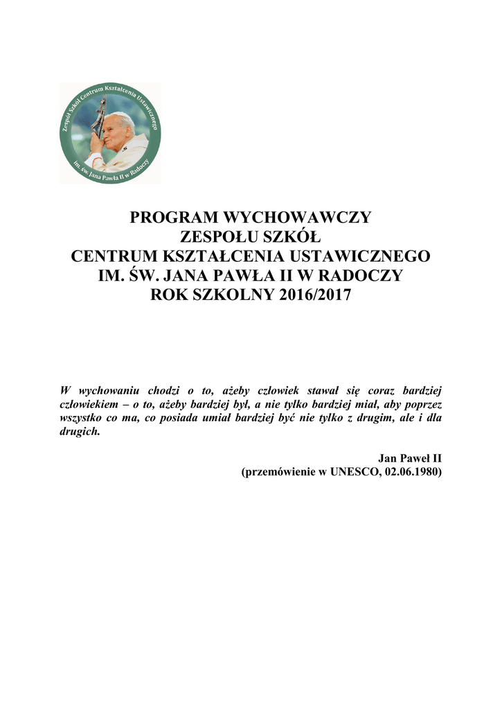 PROGRAM WYCHOWAWCZY ZESPOŁU SZKÓŁ CENTRUM KSZTAŁCENIA USTAWICZNEGO IM. ŚW. JANA PAWŁA II W RADOCZY ROK SZKOLNY 2016/2017 W wychowaniu chodzi o to, ażeby człowiek stawał się coraz bardziej człowiekiem – o to, ażeby bardziej był, a nie tylko bardziej miał, aby poprzez wszystko co ma, co posiada umiał bardziej być nie tylko z drugim, ale i dla drugich. Jan Paweł II (przemówienie w UNESCO, 02.06.1980) MISJA SZKOŁY Wychowanie dobrego, wykształconego i odpowiedzialnego człowieka, który osiągnie sukces w życiu rodzinnym i zawodowym. Nabędzie umiejętności niezbędnych do funkcjonowania w nowoczesnym świecie, wykształci zdolność samodzielnego myślenia, otwartego na kształcenie się przez całe życie, aktywnego, zaradnego i przedsiębiorczego, zachowującego przy tym prawo do przekonań religijnych, światopoglądowych oraz wolności sumienia. WIZJA SZKOŁY Wizją naszej szkoły jest harmonijne współdziałanie wszystkich organów szkoły i środowiska, zmierzające do zapewnienia uczniom warunków umożliwiających prawidłowe funkcjonowanie w dynamicznie rozwijającym się świecie. W zakresie dydaktyki: Przekazujemy uczniom rzetelną wiedzę i praktyczne umiejętności. Przygotowujemy do dalszego kształcenia i wykonywania zawodu. Inspirujemy do rozwoju intelektualnego, duchowego i fizycznego. Rozwijamy w uczniach umiejętność korzystania z najnowszych zdobyczy techniki i nowoczesnych źródeł informacji. W zakresie wychowania: Kształtujemy właściwe postawy wobec siebie i innych. Pomagamy w ustalaniu hierarchii wartości i dokonywaniu wyborów. Rozwijamy w uczniach przywiązanie do tradycji i tożsamości narodowej. Przestrzegamy zasad prawa, demokracji i tolerancji. Promujemy zdrowy styl życia i świadomość ekologiczną. Reagujemy na przejawy agresji i patologie w zachowaniu młodzieży. Przygotowujemy do dojrzałego uczestniczenia w życiu kulturalnym i społecznym. Integrujemy uczniów z różnych środowisk. Współpracujemy z rodzicami i instytucjami środowiska lokalnego. W zakresie opieki: Stwarzamy warunki do bezpiecznego pobytu i nauki w szkole. Pomagamy w sytuacjach trudnych. Współpracujemy z instytucjami wspomagającymi proces wychowania i nauczania. Uczymy szacunku, odpowiedzialności i sumiennego wypełniania obowiązków. 2 WYCHOWANIE jest, obok nauczania i kształcenia, integralnym elementem szkolnej edukacji. W procesie wychowania należy kierować się uniwersalnymi zasadami etyki oraz respektować chrześcijański system wartości. Zadaniem ZSRCKU w Radoczy jest wykształcenie człowieka świadomego swych możliwości zawodowych, dążącego do podwyższenia swoich kwalifikacji, posiadającego właściwą postawę moralną, społeczną i patriotyczną. Zadaniem nauczycieli, wychowawców i pedagoga w pracy wychowawczej jest wskazanie swoim wychowankom ideału, zgodnie z którym uczeń dojrzały, dobrze przygotowany do życia w społeczeństwie, to człowiek uczciwy, umiejący żyć z innymi, ale i dla innych. I. Podstawy prawne II. Konstytucja Rzeczpospolitej Polskiej Ustawa o Systemie Oświaty Karta Nauczyciela Podstawa Programowa Statut Szkoły Główne cele pracy wychowawczej Kształtowanie postaw osobowych w oparciu o realizację zadań ogólnych szkoły zawartych w podstawach programowych Zapewnienie wychowankom możliwości indywidualnego rozwoju w oparciu o własne predyspozycje oraz pełne przygotowanie do dalszego etapu kształcenia lub podjęcia pracy Uczenie szacunku dla dobra wspólnego jako podstawy życia społecznego oraz przygotowanie do życia w rodzinie, w społeczności lokalnej i w państwie, w duchu dziedzictwa kulturowego i postaw patriotycznych Wzbudzanie szacunku dla pracy i zachęcanie do dalszego doskonalenia zawodowego poprzez planowanie swojego rozwoju i zainteresowań Ukazanie uczniom alternatywnego sposobu spędzania wolnego czasu Rozwijanie możliwości twórczych ucznia oraz nauczanie go rzetelnej samooceny swoich umiejętności i postępowania Wdrożenie do nabywania umiejętności rozwiązywania problemów w twórczy sposób Przygotowanie do pełnienia roli uczestników gospodarki rynkowej 3 Przygotowanie do współodpowiedzialności za jakość życia szkoły, a w przyszłości za kształt samorządności w państwie Wykształcenia u uczniów poszanowania dla wartości uniwersalnych III. Kierunki oddziaływań wychowawczych Rozwijanie poczucia przynależności do grupy rodzinnej, społeczności szkolnej i lokalnej. Kształtowanie postaw obywatelskich i patriotycznych. Wychowanie do pracy, czyli kształtowanie właściwych postaw wobec przyszłych obowiązków zawodowych, szacunek dla pracy i kult pracy jako wartości. Wychowanie tolerancyjne – światopoglądowe i religijne. Kształtowanie postawy służby wobec drugiego człowieka – szacunek dla innych, uczestnictwo w działalności charytatywnej na rzecz innych, wolontariat. Wychowanie zdrowotne, czyli promocja zdrowego stylu życia, walka z przejawami patologii społecznej wśród młodzieży z uwzględnieniem problemów toksykomanii i alkoholizmu oraz przemocy w szkole. Kształtowanie postaw asertywnych do pełnego, otwartego, uczciwego i stanowczego komunikowania swoich poglądów, uczuć i postaw w taki sposób, aby nie lekceważyć uczuć czy przekonań rozmówcy. Wdrożenie i rozwijanie zasad dobrego zachowania się w szkole i poza nią, uwzględniając zasady savoir-vivre’u jak: a) używanie zwrotów grzecznościowych, b) stosowanie odpowiednich form pozdrowień wobec nauczycieli, pracowników szkoły i innych osób dorosłych, c) przestrzeganie właściwych zasad zachowania się w salach podczas lekcji, d) dbanie o czystość sali, sprzątanie śmieci, e) przestrzeganie zakazów: korzystania z telefonów komórkowych w czasie lekcji, żucia gumy i przyklejania jej do ławek, spożywania posiłków na lekcji, palenia papierosów, wnoszenia i spożywania na terenie szkoły alkoholu i innych używek, używania zwrotów wulgarnych, f) 