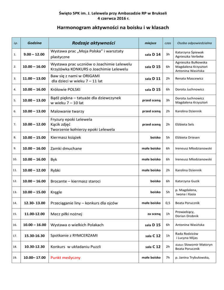 Święto SPK im. J. Lelewela przy Ambasadzie RP w Brukseli 4 czerwca 2016 r. Harmonogram aktywności na boisku i w klasach Rodzaje aktywności Lp. Godzina 1. 9.00 – 12.00 Wystawa prac „Moja Polska” i warsztaty plastyczne sala D 14 3h Katarzyna Śpiewak Agnieszka Verbeke 2. 10.00 – 16.00 Wystawa prac uczniów o Joachimie Lelewelu Krzyżówka KONKURS o Joachimie Lelewelu sala D 15 6h Agnieszka Bułkowska Magdalena Krzysztoń Antonina Wasińska 3. 11.00 – 13.00 Baw się z nami w ORIGAMI dla dzieci w wieku 7 – 11 lat sala D 11 2h Renata Mascewicz 4. 10.00 – 16.00 Królowie POLSKI sala D 15 6h Dorota Juchnowicz 5. 10.00 – 13.00 Bądź piękna – tatuaże dla dziewczynek w wieku 7 – 10 lat przed sceną 3h Dorota Juchnowicz Magdalena Krzysztoń 6. 10.00 – 13.00 Malowanie twarzy przed sceną 2h Karolina Dziennik 7. 10.00 – 12.00 Fryzury epoki Lelewela Kącik zdjęć Tworzenie kołnierzy epoki Lelewela przed sceną 2h Elżbieta Sels 8. 10.00 – 15.00 Kiermasz książek boisko 5h Elżbieta Driesen 9. 10.00 – 16.00 Zamki dmuchane małe boisko 6h Ireneusz Młodzianowski 10. 10.00 – 16.00 Byk małe boisko 6h Ireneusz Młodzianowski 11. 10.00 – 12.00 Rybki małe boisko 2h Karolina Dziennik 12. 10.00 – 16.00 Brocante – kiermasz staroci boisko 6h Katarzyna Guzik 13. 10.00 – 15.00 Kręgle boisko 5h p. Magdalena, Iwona i Kasia 14. 12.30- 13.00 Przeciąganie liny – konkurs dla ojców małe boisko 0,5 Beata Porucznik 15. 11.00-12.00 Mecz piłki nożnej za sceną 1h Prowadzący, Dorian Drobnik 16. 10.00 – 16.00 I o wielkich Polakach Wystawa sala D 15 6h Antonina Wasińska 17. 15.30-16.30 Spotkanie z RYMCERZAMI sala C 12 1h Rada Rodziców i Lucyna Mijas 18. 10.30-12.30 Konkurs w układaniu Puzzli sala C 12 2h 19. 10.00– 17.00 Punkt medyczny małe boisko 7h miejsce czas Osoba odpowiedzialna diakon Sławomir Matoryn Beata Porucznik p. Janina Trybułowska,