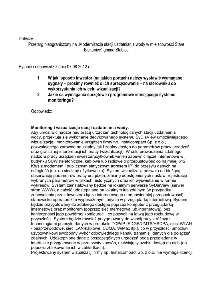 Dotyczy: Przetarg nieograniczony na „Modernizacja stacji uzdatniania wody w miejscowości Stare Biskupice” gmina Słubice Pytanie i odpowiedz z dnia 07.08.2012 r. 1. 2. W jaki sposób inwestor (na jakich portach) należy wystawić wymagane sygnały – prosimy również o ich sprecyzowanie – na sterowniku do wykorzystania ich w celu wizualizacji? Jakie są wymagania sprzętowe i programowe istniejącego systemu monitoringu? Odpowiedź: Monitoring i wizualizacja stacji uzdatniania wody. Aby umożliwić nadzór nad pracą urządzeń technologicznych stacji uzdatniania wody, projektuje się wykonanie dedykowanego systemu SyDiaView umożliwiającego wizualizację i monitorowanie urządzeń firmy np. Instalcompact Sp. z o.o., pozwalającego zarówno na lokalny jak i zdalny dostęp do parametrów pracy urządzeń oraz graficznej interpretacji ich pracy (wizualizacji). W celu prowadzenia zdalnego nadzoru pracy urządzeń inwestor/użytkownik winien zapewnić łącze internetowe w budynku SUW (telefoniczne, kablowe lub radiowe o przepustowość co najmniej 512 Kb/s z modemem i publicznym statycznym adresem IP) do przesyłu danych na odległość (np. do siedziby użytkownika). System wizualizacji pozwala na bieżącą obserwację parametrów pracy urządzeń, zmianę udostępnionych nastaw, rejestrację wybranych parametrów w plikach historycznych oraz ich wyświetlanie w formie wykresów. System zainstalowany będzie na lokalnym serwerze SyDiaView (serwer stron WWW), a całość udostępniana na lokalnym lub zdalnym (w przypadku zapewnienia przez Inwestora łącza internetowego o odpowiedniej przepustowości) stanowisku operatorskim wyposażonym jedynie w przeglądarkę internetową. System będzie przygotowany do zdalnego dostępu poprzez komputer z przeglądarką internetową oraz monitorem (poprzez sieć eternetową lub internetową), bez konieczności jego powtórnej konfiguracji, co pozwoli na łatwą jego rozbudowę w przyszłości. System będzie również przygotowany do współpracy z różnymi technologiami przesyłu danych w protokole TCP/IP (EDGE/UMTS/HSDPA, sieci WLAN - bezprzewodowe, sieci LAN-kablowe, CDMA, WiMax itp.), co w przyszłości umożliwi użytkownikowi swobodny wybór odpowiedniego kanału transmisji danych dla połączeń zdalnych. Udostępnione dane z poszczególnych urządzeń będą przeglądane w interfejsie przygotowane w przejrzysty sposób, ułatwiający szybki dostęp do nich (np. poprzez zblokowanie ich w zakładkach). Projektowany system wizualizacji firmy np. Instalcompact Sp. z o.o. nie wymaga licencji, co jest istotne dla użytkownika w przypadku rozbudowy w przyszłości systemu związanej np. z przyłączeniem do niego następnych urządzeń lub wpięcia dodatkowych sygnałów. Zakłada się, że w systemie wizualizowane będą następujące zmienne procesowe: - poziom i objętość wody w zbiorniku retencyjnych (sonda poziomu w zbiorniku), - poziom wód popłucznych w odstojniku (sonda poziomu w odstojniku), - ciśnienie powietrza za rozdzielnią pneumatyczną (czujnik ciśnienia), - stan wysterowania przepustnic sterowanych automatycznie (stany wyjść sterownika), - przepływ wody przez wodomierz główny (za zestawem hydroforowm), z rejestracją miesięcznych wartości minimalnych, maksymalnych i średnich), - przepływ wody na wodomierzu wody surowej (wydajność chwilowa) oraz objętość wody, która przepłynęła przez wodomierz od początku, - stan pracy filtra (praca/ płukanie), - praca zestawu hydroforowego, - praca pomp na ujęciu wody, - awaria pompy głębinowej (sygnał z szafy technologicznej), - awaria dmuchawy, - awaria pompy płucznej, - awaria niskie ciśnienie powietrza, - stop stacji uzdatniania wody, - awaria stacji uzdatniania wody, - awaria zasilania, - awaria przetworników, - dla zestawu hydroforowego również: o stan pracy pomp (0-praca-ręka) oraz stany alarmowe (suchobieg, zadziałanie zabezpieczeń), o ciśnienie za zestawem hydroforowym, o częstotliwość na wyjściu przetwornicy, o awaria zestawu hydroforowego, - włamanie do studni ujęcia wody, - włamanie do budynku stacji uzdatniania wody. Schemat wizualizacyjny stacji będzie zawierał graficzne odwzorowanie następujących obiektów: pomp głębinowych (z graficznym identyfikowaniem stanu pracy pompy oraz stanów alarmowych), - zestawu aeracji – identyfikacja przepływu wody, - zestawów filtracyjnych – identyfikacja stanów wysterowania przepustnic (z wyjść sterownika), stanu pracy filtra oraz przepływów w rurociągach technologicznych, - odstojnika – graficzna identyfikacja poziomu wód popłucznych (z sondy poziomu), - zestawu płucznego (graficzna identyfikacja stanów pracy pompy oraz stanów awaryjnych), - zestawu dmuchawy – stan pracy, - wodomierzy – (wyświetlanie zmierzonych przepływów, zliczanie objętości wody przepływającej), - zestawu chloratora – praca, - zestawu dozowania wodorotlenku sodu – praca, - zbiornika retencyjnego - graficzne przedstawienie poziomu i objętości wody, - zestawu hydroforowego – praca pomp, stany awaryjne pomp, ciśnienie za zestawem, częstotliwość przetwornicy, awaria zbiorcza zestawu hydroforowego, - wszystkich rurociągów technologicznych, z identyfikacją przepływów poprzez animację wskazującą na kierunek przepływu. Rurociągi wody surowej, uzdatnionej, popłuczyn, powietrza powinny być przy tym oznaczone różnymi kolorami. Dodatkowo system powinien umożliwić: - archiwizację oraz odczyt dobowych objętości rejestrowanych przez wodomierz wody surowej (produkcja wody), - archiwizację oraz odczyt dobowych objętości rejestrowanych przez wodomierz wody czystej (dostawa wody czystej do sieci), wraz z wartościami maksymalnymi (maksymalny godzinowy oraz maksymalny dobowy przepływ). Dane techniczne systemu wizualizacji i nadzoru: system powinien być zainstalowany na serwerze znajdującym się w obrębie budynku SUW w miejscu, które nie jest narażone na działanie wilgoci (