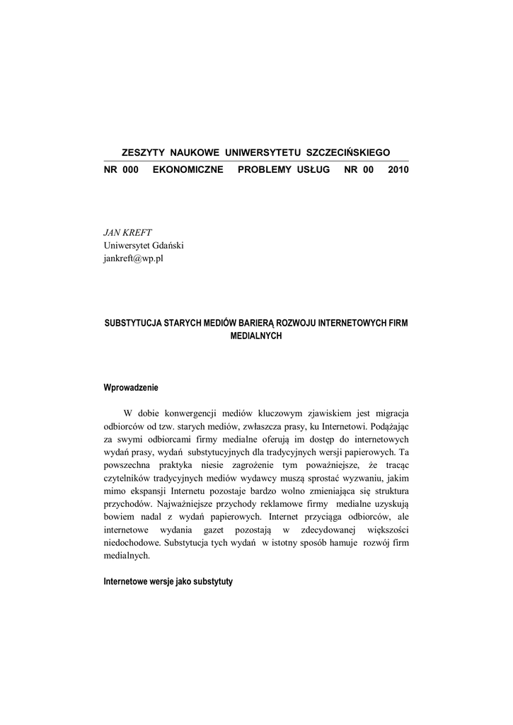 ZESZYTY NAUKOWE UNIWERSYTETU SZCZECIŃSKIEGO NR 000 EKONOMICZNE PROBLEMY USŁUG NR 00 2010 JAN KREFT Uniwersytet Gdański [email protected] SUBSTYTUCJA STARYCH MEDIÓW BARIERĄ ROZWOJU INTERNETOWYCH FIRM MEDIALNYCH Wprowadzenie W dobie konwergencji mediów kluczowym zjawiskiem jest migracja odbiorców od tzw. starych mediów, zwłaszcza prasy, ku Internetowi. Podążając za swymi odbiorcami firmy medialne oferują im dostęp do internetowych wydań prasy, wydań substytucyjnych dla tradycyjnych wersji papierowych. Ta powszechna praktyka niesie zagrożenie tym poważniejsze, że tracąc czytelników tradycyjnych mediów wydawcy muszą sprostać wyzwaniu, jakim mimo ekspansji Internetu pozostaje bardzo wolno zmieniająca się struktura przychodów. Najważniejsze przychody reklamowe firmy medialne uzyskują bowiem nadal z wydań papierowych. Internet przyciąga odbiorców, ale internetowe wydania gazet pozostają w zdecydowanej większości niedochodowe. Substytucja tych wydań w istotny sposób hamuje rozwój firm medialnych. Internetowe wersje jako substytuty Powstawanie gazet on – line wpisuje się w konwergencję prasy i Internetu, które umożliwiły postępy cyfryzacji. Technologicznie Internet pozwala im dotrzeć w najbardziej odległe zakątki świata, wszędzie tam gdzie możliwy jest do niego dostęp. W praktyce większość gazet on-line należy do firm wydawniczych wydających ich drukowane odpowiedniki. 1 Firmy te funkcjonują na rynku, który przeżywa szczególnie intensywne przeobrażenia. Pomiędzy 1950 a 1999 r. reklamowe przychody gazet rosły na najbardziej rozwiniętym, amerykańskim rynku o 7 % rocznie, ale ekspansja Internetu zahamowała tempo tego wzrostu do 0,5 % w latach 2000 – 2006 (przychody reklamowe w Internecie wzrastały rocznie o 30%).2 Te niezwykle dynamiczne zmiany traktować można nie tylko jako szanse związane z możliwościami nowej technologii i sposobności dotarcia do nowego audytorium, ale także jako zagrożenia. Nawet bowiem jeśli wydawnictwa prasowe były przez ostatnie dekady dochodowe, to - jak alarmuje Pew Research Center - ich rzeczywista siła konkurencyjna była wątpliwa, albowiem ich przewaga konkurencyjna nie była stabilna, nawet jeśli wykazywały one ponadprzeciętne wyniki 3. W takiej sytuacji dalszemu wydawaniu gazet towarzyszy daleko posunięty sceptycyzm. 4 Jest on tym bardziej uzasadniony, że nadal większość wydawniczych firm medialnych jest skoncentrowana na tradycyjnym wydawaniu gazet 5, tymczasem powinny być zainteresowane nowymi kanałami wydawniczymi dla kilku ważkich powodów:6 Spadku sprzedaży i rosnącymi kosztami utrzymania czytelnictwa na najbardziej rozwiniętych rynkach Europy i Ameryki Płn. Rosnącej konkurencji w sektorze mediów Zainteresowania odbiorców mediami elektronicznymi i nowymi rozwiązaniami technicznymi 1 H.I. Chyi, G. Sylvie, The Medium is Global, the Content is Not: The Role of Geography in Online Newspaper Markets, “Journal of Media Economic” 2001, vol. 14, no. 4, s.. 231-248. 2 Pew Research Center, Can the “Dead Tree” Newspaper Survive?, Dostepne na: http://pewresearch.org/pubs/43/can-the-dead-tree-newspaper-survive 3 Tamże, s. 3. 4 R. Fidler, Creating Digital Newsbooks Newspapers Use them to Bring Enterprise Reporting to a New Audience on the Web’, Nieman Report 2005, s. 39-40. 5 S. Leckner, E. Appelgren, E-paper News Publishing. Strategies for Product and Production, “Nordicom Review” 2997, vol. 28, no. 2, s. 26. 6 R. Picard, J.H. Brody, The Newspaper Publishing Industry, Allyn and Bacon, Needham Heights, 1997. Brakiem zależności mediów elektronicznych od rosnących kosztów druku, papieru, czasu i wysokich kosztów dystrybucji. Paradoks barierą rozwoju Spadek nakładu i zmiany wpływów reklamowych stanowią zagrożenie dla całego sektora wydawniczego przemysłu medialnego. W nadziei na zaradzenie tym problemom i dążąc do odzyskania utraconych wpływów finansowych z wydawania prasy, wydawcy decydują się na zmianę modelu biznesu i pozyskanie jak największego audytorium wydań on-line, które mogłoby skłonić reklamodawców do uwzględnienia nowej medialnej platformy w ich dążeniu do dotarcia do konsumentów towarów i usług. Analizy tego zjawiska koncentrują się na poszukiwaniu stabilnego modelu biznesu Według J.F. Rayporta kluczowe staje się w tej sytuacji „magiczne słowo monetyzacja” towarzyszące założeniu, że najpierw należy pozyskać jak największe audytorium użytkowników i konsumentów, a następnie „monetyzować” te audytoria poprzez opłaty subskrypcyjne, reklamę i e-handel. 7 Problem jest tym bardziej istotny, że w praktyce sukcesy wydawców angażujących się w wydania internetowe są bardzo rzadkie. 8 Zdecydowana większość spółek wydawniczych nie prezentuje swoich wyników finansowych w podziale na segment internetowy. Do nielicznych przypadków transparentnych pod tym względem spółek należy notowana na giełdzie papierów wartościowych Agora SA, wydawca Gazety Wyborczej. Mimo zgromadzonego doświadczenia, kompetencji i przekraczającego 10 mln użytkowników audytorium Grupa Gazeta.pl okazuje się w mijającej dekadzie przedsięwzięciem deficytowym i obciążającym wynik finansowych całego 7 J.F. Rayport, The truth about Internet business models – In the end, an e-business is just another business. “Strategy & Business” 1999, vol. 16. 8 R.G. Picard, Shifts in newspaper advertising expenditures and their implications for the future of newspapers. “Journalism Studies” 2008, vol. 9, no. 5, s. 704-716; J.M. Hallaugher, A. Auger, A. Barnir, Revenue streams and digital content providers: an empirical investigation,“Information & Management” 2001, vol. 38, no, s. 473 – 485; C. Ihlström, J. Palmer, Revenues for online newspapers: owner and user perceptions. Electronic Markets: the International Journal of Electronic Commerce & Business Media, 12, 4 (2002), 228–236; J.W. Palmer, L.B. Eriksen