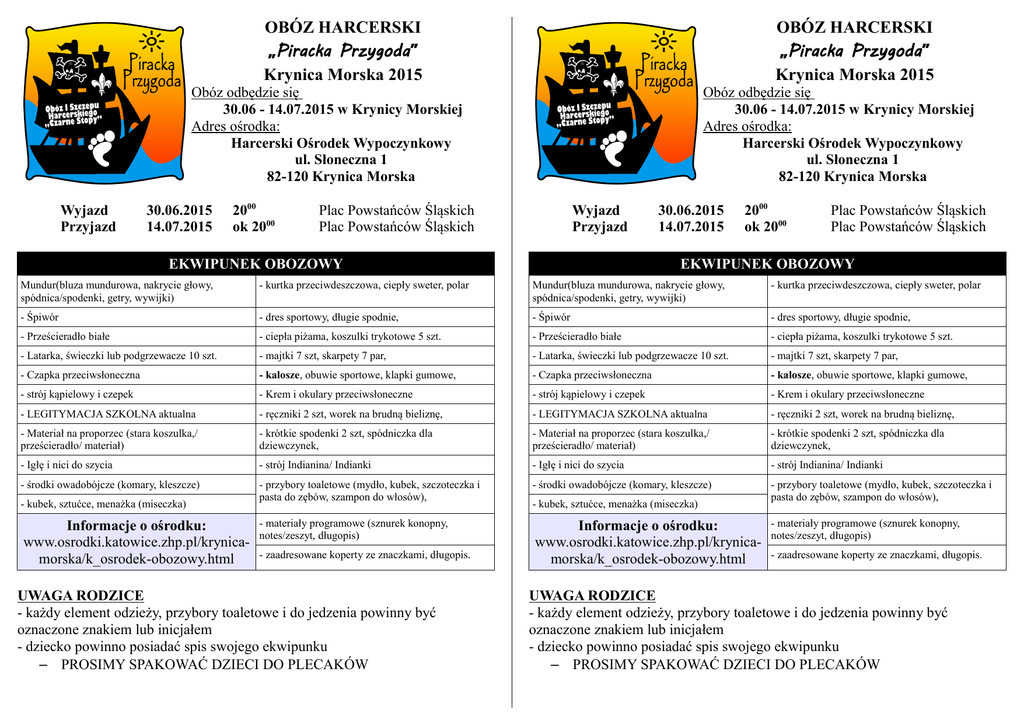 OBÓZ HARCERSKI „Piracka Przygoda” Krynica Morska 2015 OBÓZ HARCERSKI „Piracka Przygoda” Krynica Morska 2015 Obóz odbędzie się 30.06 - 14.07.2015 w Krynicy Morskiej Adres ośrodka: Harcerski Ośrodek Wypoczynkowy ul. Słoneczna 1 82-120 Krynica Morska Wyjazd Przyjazd 30.06.2015 14.07.2015 2000 ok 2000 Obóz odbędzie się 30.06 - 14.07.2015 w Krynicy Morskiej Adres ośrodka: Harcerski Ośrodek Wypoczynkowy ul. Słoneczna 1 82-120 Krynica Morska Plac Powstańców Śląskich Plac Powstańców Śląskich Wyjazd Przyjazd EKWIPUNEK OBOZOWY 30.06.2015 14.07.2015 2000 ok 2000 Plac Powstańców Śląskich Plac Powstańców Śląskich EKWIPUNEK OBOZOWY Mundur(bluza mundurowa, nakrycie głowy, spódnica/spodenki, getry, wywijki) - kurtka przeciwdeszczowa, ciepły sweter, polar Mundur(bluza mundurowa, nakrycie głowy, spódnica/spodenki, getry, wywijki) - kurtka przeciwdeszczowa, ciepły sweter, polar - Śpiwór - dres sportowy, długie spodnie, - Śpiwór - dres sportowy, długie spodnie, - Prześcieradło białe - ciepła piżama, koszulki trykotowe 5 szt. - Prześcieradło białe - ciepła piżama, koszulki trykotowe 5 szt. - Latarka, świeczki lub podgrzewacze 10 szt. - majtki 7 szt, skarpety 7 par, - Latarka, świeczki lub podgrzewacze 10 szt. - majtki 7 szt, skarpety 7 par, - Czapka przeciwsłoneczna - kalosze, obuwie sportowe, klapki gumowe, - Czapka przeciwsłoneczna - kalosze, obuwie sportowe, klapki gumowe, - strój kąpielowy i czepek - Krem i okulary przeciwsłoneczne - strój kąpielowy i czepek - Krem i okulary przeciwsłoneczne - LEGITYMACJA SZKOLNA aktualna - ręczniki 2 szt, worek na brudną bieliznę, - LEGITYMACJA SZKOLNA aktualna - ręczniki 2 szt, worek na brudną bieliznę, - Materiał na proporzec (stara koszulka,/ prześcieradło/ materiał) - krótkie spodenki 2 szt, spódniczka dla dziewczynek, - Materiał na proporzec (stara koszulka,/ prześcieradło/ materiał) - krótkie spodenki 2 szt, spódniczka dla dziewczynek, - Igłę i nici do szycia - strój Indianina/ Indianki - Igłę i nici do szycia - strój Indianina/ Indianki - środki owadobójcze (komary, kleszcze) - przybory toaletowe (mydło, kubek, szczoteczka i pasta do zębów, szampon do włosów), - środki owadobójcze (komary, kleszcze) - przybory toaletowe (mydło, kubek, szczoteczka i pasta do zębów, szampon do włosów), - materiały programowe (sznurek konopny, notes/zeszyt, długopis) Informacje o ośrodku: www.osrodki.katowice.zhp.pl/krynicamorska/k_osrodek-obozowy.html - kubek, sztućce, menażka (miseczka) Informacje o ośrodku: www.osrodki.katowice.zhp.pl/krynicamorska/k_osrodek-obozowy.html - zaadresowane koperty ze znaczkami, długopis. UWAGA RODZICE - każdy element odzieży, przybory toaletowe i do jedzenia powinny być oznaczone znakiem lub inicjałem - dziecko powinno posiadać spis swojego ekwipunku – PROSIMY SPAKOWAĆ DZIECI DO PLECAKÓW - kubek, sztućce, menażka (miseczka) - materiały programowe (sznurek konopny, notes/zeszyt, długopis) - zaadresowane koperty ze znaczkami, długopis. UWAGA RODZICE - każdy element odzieży, przybory toaletowe i do jedzenia powinny być oznaczone znakiem lub inicjałem - dziecko powinno posiadać spis swojego ekwipunku – PROSIMY SPAKOWAĆ DZIECI DO PLECAKÓW