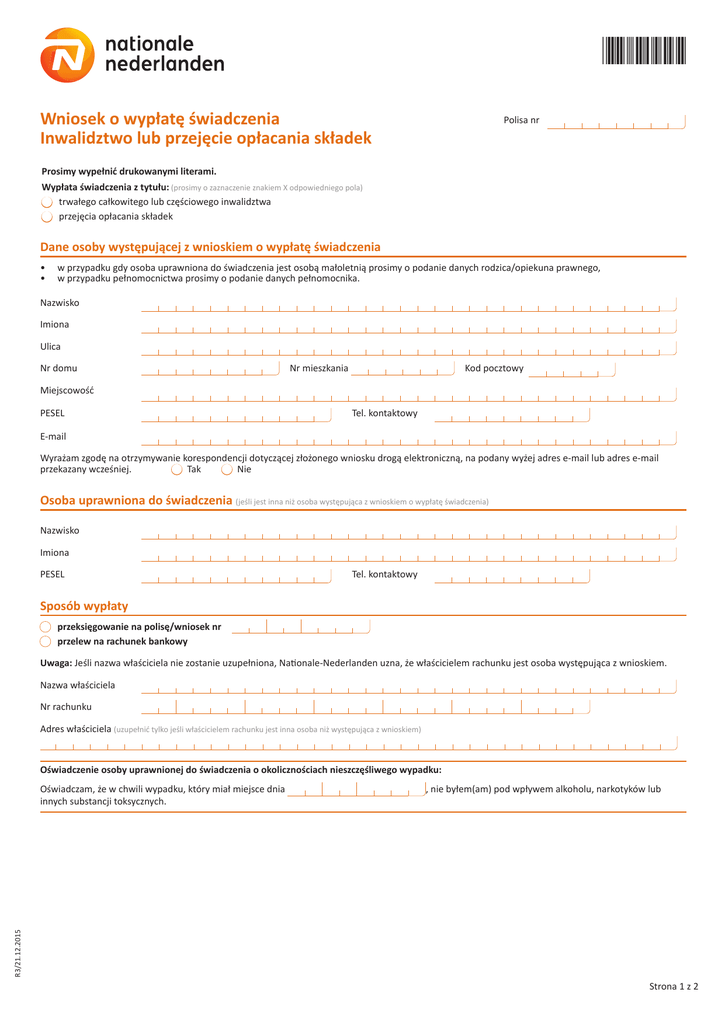 *C024* Wniosek o wypłatę świadczenia Inwalidztwo lub przejęcie opłacania składek Polisa nr Prosimy wypełnić drukowanymi literami. Wypłata świadczenia z tytułu: (prosimy o zaznaczenie znakiem X odpowiedniego pola) n trwałego całkowitego lub częściowego inwalidztwa n przejęcia opłacania składek Dane osoby występującej z wnioskiem o wypłatę świadczenia • w przypadku gdy osoba uprawniona do świadczenia jest osobą małoletnią prosimy o podanie danych rodzica/opiekuna prawnego, • w przypadku pełnomocnictwa prosimy o podanie danych pełnomocnika. Nazwisko Imiona Ulica Nr domu Nr mieszkania Kod pocztowy Miejscowość PESEL Tel. kontaktowy E-mail Wyrażam zgodę na otrzymywanie korespondencji dotyczącej złożonego wniosku drogą elektroniczną, na podany wyżej adres e-mail lub adres e-mail przekazany wcześniej. n Tak n Nie Osoba uprawniona do świadczenia (jeśli jest inna niż osoba występująca z wnioskiem o wypłatę świadczenia) Nazwisko Imiona PESEL Tel. kontaktowy Sposób wypłaty n przeksięgowanie na polisę/wniosek nr n przelew na rachunek bankowy Uwaga: Jeśli nazwa właściciela nie zostanie uzupełniona, Nationale‑Nederlanden uzna, że właścicielem rachunku jest osoba występująca z wnioskiem. Nazwa właściciela Nr rachunku Adres właściciela (uzupełnić tylko jeśli właścicielem rachunku jest inna osoba niż występująca z wnioskiem) Oświadczenie osoby uprawnionej do świadczenia o okolicznościach nieszczęśliwego wypadku: , nie byłem(am) pod wpływem alkoholu, narkotyków lub R3/21.12.2015 Oświadczam, że w chwili wypadku, który miał miejsce dnia innych substancji toksycznych. Strona 1 z 2 Wymagane dokumenty1 n urzędowy dokument potwierdzający tożsamość osoby występującej z wnioskiem; n dokumentacja medyczna dotycząca przebiegu leczenia potwierdzająca zajście zdarzenia ubezpieczeniowego (tj. karty informacyjne leczenia szpitalnego, posiadane zaświadczenia lekarskie, dokumentacja leczenia ambulatoryjnego i wyniki badań); n orzeczenie komisji lekarskiej ZUS, KRUS lub w przypadku braku jednego z ww. orzeczeń – orzeczenie komisji lekarskiej przy Urzędzie Pracy potwierdzające całkowitą niezdolność do wykonywania jakiejkolwiek pracy zarobkowej; orzeczenie o niezdolności do samodzielnej egzystencji; n w przypadku nieszczęśliwego wypadku (NW) notatka urzędowa z policji opisująca okoliczności NW lub w przypadku, gdy nie była wzywana policja oświadczenie opisujące okoliczności nieszczęśliwego wypadku. Jeżeli osoba uprawniona do świadczenia nie posiada notatki urzędowej z policji – prosimy podać informacje umożliwiające jej uzyskanie, tj. nazwę i adres podmiotu, który ją posiada; n zwolnienia lekarskie potwierdzające ciągłość niezdolności do pracy za okres 180 dni (wymagane w przypadku przejęcia opłacania składek); oraz: • w przypadku, gdy z wnioskiem o wypłatę świadczenia występuje inna osoba niż osoba uprawniona do świadczenia, wymagane jest przedstawienie dokumentu pełnomocnictwa do reprezentowania tej osoby; • rodzic/opiekun prawny składający wniosek o wypłatę świadczenia w imieniu osoby małoletniej jest zobowiązany do wykazania swojego uprawnienia do występowania w imieniu tej osoby (rodzic: skrócony odpis aktu urodzenia dziecka; opiekun prawny: zaświadczenie sądu opiekuńczego o ustanowieniu opiekunem). Dodatkowe informacje: Upoważniam (dotyczy osoby uprawnionej do świadczenia)2 Upoważniam lekarzy, podmioty wykonujące działalność leczniczą oraz zakłady ubezpieczeń i instytucje ubezpieczeniowe do udzielania pełnej informacji o moim stanie zdrowia oraz stanie zdrowia mojego Dziecka. Upoważniam lekarzy upoważnionych przez Ubezpieczyciela do zasięgania informacji medycznych w tym również do występowania o kserokopię dokumentacji medycznej, dotyczących mojego fizycznego i psychicznego stanu zdrowia u lekarzy, u których zasięgałem porad lub przez których byłem badany albo leczony (upoważnienie dotyczy również podmiotów wykonujących działalność leczniczą). Powyższe upoważnienie dotyczy także zasięgania informacji na temat zdrowia mojego Dziecka. Uzyskane w ten sposób dane będą wykorzystywane przez Ubezpieczyciela wyłącznie w celu ustalenia zakresu odpowiedzialności w przypadku wypłaty świadczenia. Osoba występująca z wnioskiem Imię i nazwisko (czytelny podpis) Podpis Osoba uprawniona do świadczenia (jeśli jest inna niż osoba występująca z wnioskiem) Imię i nazwisko (czytelny podpis) Przedstawiciel (w przypadku wypełnienia wniosku w obecności Przedstawiciela) Podpis Podpis Data Data Data dołączyć oryginał lub kopię potwierdzoną za zgodność z oryginałem przez notariusza, organ wydający dany dokument lub osobę reprezentującą Nationale‑Nederlanden, 2 w przypadku osoby małoletniej, która nie ukończyła 18. r. ż. – oświadczenie składa rodzic lub opiekun prawny R3/21.12.2015 1 Nationale-Nederlanden Towarzystwo Ubezpieczeń na Życie S.A.; ul. Topiel 12, 00-342 Warszawa; tel. +48 (22) 522 00 00, fax +48 (22) 522 11 11, www.nn.pl Sąd Rejonowy dla m.st. Warszawy; XII Wydział Gospodarczy Krajowego Rejestru Sądowego KRS 25443; NIP: 527-10-02-574, Kapitał zakładowy – 41 000 000 zł, wpłacony w całości Strona 2 z 2