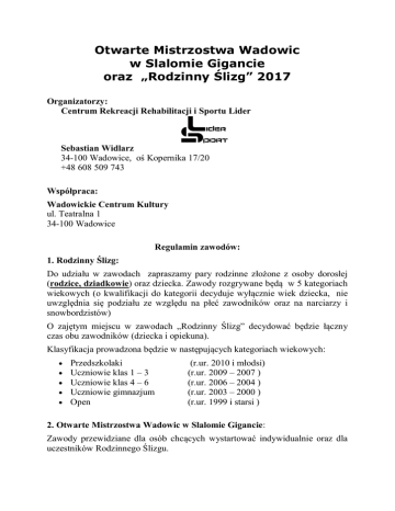 Otwarte Mistrzostwa Wadowic w Slalomie Gigancie oraz „Rodzinny Ślizg” 2017 Organizatorzy: Centrum Rekreacji Rehabilitacji i Sportu Lider Sebastian Widlarz 34-100 Wadowice, oś Kopernika 17/20 +48 608 509 743 Współpraca: Wadowickie Centrum Kultury ul. Teatralna 1 34-100 Wadowice Regulamin zawodów: 1. Rodzinny Ślizg: Do udziału w zawodach zapraszamy pary rodzinne złożone z osoby dorosłej (rodzice, dziadkowie) oraz dziecka. Zawody rozgrywane będą w 5 kategoriach wiekowych (o kwalifikacji do kategorii decyduje wyłącznie wiek dziecka, nie uwzględnia się podziału ze względu na płeć zawodników oraz na narciarzy i snowbordzistów) O zajętym miejscu w zawodach „Rodzinny Ślizg” decydować będzie łączny czas obu zawodników (dziecka i opiekuna). Klasyfikacja prowadzona będzie w następujących kategoriach wiekowych: • • • • • Przedszkolaki Uczniowie klas 1 – 3 Uczniowie klas 4 – 6 Uczniowie gimnazjum Open (r.ur. 2010 i młodsi) (r.ur. 2009 – 2007 ) (r.ur. 2006 – 2004 ) (r.ur. 2003 – 2000 ) (r.ur. 1999 i starsi ) 2. Otwarte Mistrzostwa Wadowic w Slalomie Gigancie: Zawody przewidziane dla osób chcących wystartować indywidualnie oraz dla uczestników Rodzinnego Ślizgu. W Otwartych Mistrzostwach Wadowic w Slalomie Gigancie obowiązuje formuła dwóch przejazdów ( suma czasów dwóch czasów przejazdów ). W przypadku zawodników biorących udział w „Rodzinnym Ślizgu” jako pierwszy czas zaliczony będzie czas uzyskany podczas przejazdu w ramach tych zawodów. Klasyfikacja prowadzona będzie w kategoriach wiekowych , z dodatkowym podziałem ze względu na wiek oraz na narciarzy i snowboardzistów: • • • • • Przedszkolaki Uczniowie klas 1 – 3 Uczniowie klas 4 – 6 Uczniowie gimnazjum Open (r.ur. 2010 i młodsi) (r.ur. 2009 – 2007 ) (r.ur. 2006 – 2004 ) (r.ur. 2003 – 2000 ) (r.ur. 1999 i starsi ) Zawody „Rodzinnego Ślizgu” oraz mistrzostwa w slalomie gigancie rozgrywane będą na wyłączonej części stoku głównego. Zwycięzcy poszczególnych kategorii obu zawodów otrzymają dyplomy i medale. Ponadto organizatorzy przyznają nagrody: -dla najliczniej reprezentowanej rodziny, -dla najmłodszego i najstarszego zawodnika oraz -nagrody ufundowane przez sponsorów które zostaną rozlosowane pomiędzy zawodników. Program zawodów: • • • • godz. 9.00 - rozdanie pakietów startowych godz. 10.00 - rozpoczęcie zawodów godz. 12.00 - rozpoczęcie drugiego przejazdu godz. 14.00 - dekoracja zwycięzców Opłata startowa wynosi: • Do 13.01. 2017 r. – 70 zł • Od 14.01. do 18.01. 2017 r – 80 zł • Od 19.01 do 22 stycznia do godziny 9.30 – 100 zł W dniu zawodów opłaty będą przyjmowane w biurze zwodów tj.: w restauracji budynku Beskid Spytkowice. W ramach opłaty startowej uczestnicy otrzymują: • 4 godzinny skipass, • gorący posiłek, Uwaga: opłata nie obejmuje ubezpieczenia NNW. Zapisy przyjmowane są mailowo na adres: [email protected] (należy podać dane: imiona i nazwiska zawodników, daty urodzenia, stopień pokrewieństwa, adres zamieszkania, potwierdzenie zapłaty, tel. kontaktowy) Opłatę startową należy wpłacić na konto: • 94 1020 1433 0000 1502 0023 7503 z adnotacją: Rodzinny Ślizg 2017 Uwaga: Organizator zastrzega sobie prawo do odwołania zawodów z przyczyn niezależnych tj.: nieczynna stacja narciarska lub pogoda uniemożliwiająca przeprowadzenie zawodów. W przypadku odwołania zawodów opłata startowa zostanie zwrócona w pełnej kwocie. Z narciarskim pozdrowieniem lidersport.pl