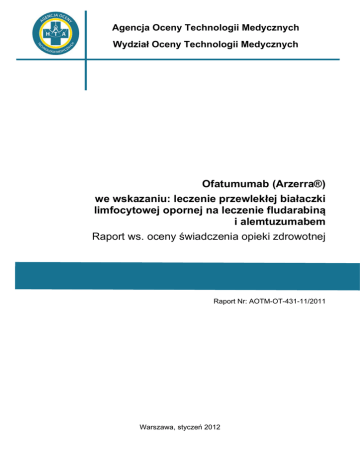 Agencja Oceny Technologii Medycznych Wydział Oceny Technologii Medycznych Ofatumumab (Arzerra®) we wskazaniu: leczenie przewlekłej białaczki limfocytowej opornej na leczenie fludarabiną i alemtuzumabem Raport ws. oceny świadczenia opieki zdrowotnej Raport Nr: AOTM-OT-431-11/2011 Warszawa, styczeń 2012 podanie ofatumumabu we wskazaniu leczenie przewlekłej białaczki limfocytowej (PBL) AOTM-OT-431-11/2011 opornej na leczenie fludarabiną i alemtuzumabem W przygotowaniu oceny raportu ws. oceny świadczenia opieki zdrowotnej udział wzięli pracownicy Działu Raportów i Oceny Raportów Wydziału Oceny Technologii Medycznych AOTM Osoby uczestniczące w pracach nad oceną świadczenia opieki zdrowotnej zadeklarowały brak konfliktu interesów. W toku prac występowano o opinię do następujących ekspertów klinicznych: Otrzymano opinie od ekspertów, których nazwiska są pogrubione. Wszyscy eksperci zadeklarowali brak konfliktu interesów. Zastosowane skróty: AE- działania niepożądane (z ang. adverse events) SAE- ciężkie działania niepożądane (z ang. serious adverse events) NCI – WG- National Cancer Institute- Working Group NCI–CTCAE- National Cancer Institute- Common Terminology Criteria of Adverse Events Chl+P- chlorambucyl + prednizon CHOP- winkrystyna, cyklofosfamid, prednizon, adriamecyna R+CHOP- rytuksymab, winkrystyna, cyklofosfamid, prednizon, adriamecyna Populacja FA-ref- Subpopulacja pacjentów z przewlekłą białaczką limfocytową opornych na wcześniejsze leczenie fludarabiną i alemtuzumabem Ustawa – Ustawa o zmianie ustawy o świadczeniach opieki zdrowotnej finansowanych ze środków publicznych oraz ustawy o cenach (Dz.U. z 2009 r. nr 118 poz. 989) Rozporządzenie – Rozporządzenie Ministra Zdrowia z dnia 22 grudnia 2009 r. w sprawie przygotowania raportu w sprawie oceny świadczenia opieki zdrowotnej i oceny raportu w sprawie oceny leku lub wyrobu medycznego (DZ.U. z 2009 r. nr 222 poz. 1773) Wytyczne – „Wytyczne oceny technologii medycznych” wprowadzone Zarządzeniem Prezesa AOTM nr 1/2010 z 4.01.2010 r., stanowiące podsumowanie uznawanych przez społeczność międzynarodową wymagań dotyczących przeprowadzania oceny świadczeń opieki zdrowotnej Raport w sprawie oceny świadczenia opieki zdrowotnej 2/69 podanie ofatumumabu we wskazaniu leczenie przewlekłej białaczki limfocytowej (PBL) AOTM-OT-431-11/2011 opornej na leczenie fludarabiną i alemtuzumabem Spis treści 1. Podstawowe informacje o wniosku ............................................................................................................ 5 2. Problem decyzyjny ..................................................................................................................................... 8 2.1. Problem zdrowotny............................................................................................................................. 8 2.1.1. Skutki następstw choroby lub stanu zdrowia ...................................................................... 11 2.2. Opis świadczenia opieki zdrowotnej ................................................................................................ 12 2.2.1. Wpływ świadczenia na stan zdrowia obywateli ................................................................... 12 2.2.2. Opis świadczeń alternatywnych .......................................................................................... 12 2.2.3. Liczebność populacji wnioskowanej .................................................................................... 13 2.3. Interwencje wnioskowane i komparatory ......................................................................................... 14 2.3.1. Interwencje .......................................................................................................................... 14 2.3.1.1. Zagadnienia rejestracyjne ............................................................................................... 14 2.3.1.2. Wskazania zarejestrowane ............................................................................................. 16 2.3.1.3. Wskazania, których dotyczy wniosek ............................................................................. 16 2.3.1.4. Wskazania, w których stosowanie technologii jest akceptowalne klinicznie .................. 16 2.3.1.5. Dotychczasowe postępowanie administracyjne w Polsce z technologią wnioskowaną. 17 2.3.2. Komparatory ........................................................................................................................ 17 2.3.2.1. Interwencje stosowane obecnie w Polsce w danej chorobie, stanie zdrowia lub wskazaniu ............................................................................................................................ 17 2.3.2.2. Interwencje, które zgodnie z aktualną wiedzą medyczną mogą zastąpić wnioskowaną interwencję .......................................................................................................................... 17 2.3.2.3. Najtańsza interwencja stosowana w danej chorobie, stanie zdrowia lub wskazaniu w Polsce .................................................................................................................................. 18 2.3.2.4. Najskuteczniejsza interwencja stosowana w danej chorobie, stanie zdrowia lub wskazaniu w Polsce ............................................................................................................ 18 2.3.2.5. Interwencja rekomendowana w wytycznych postępowania klinicznego w danej chorobie, stanie zdrowia lub wskazaniu w Polsce .............................................................................. 18 2.3.2.6. Interwencje podlegające wcześniej ocenie w Agencji, które wiążą się merytorycznie z dokonywaną oceną ............................................................................................................. 19 3. Opinie ekspertów ............................................