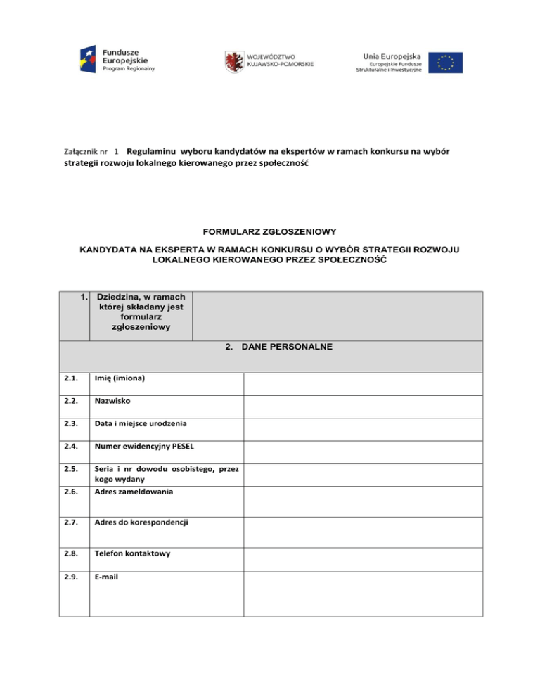 Załącznik nr 1 Regulaminu wyboru kandydatów na ekspertów w ramach konkursu na wybór strategii rozwoju lokalnego kierowanego przez społeczność FORMULARZ ZGŁOSZENIOWY KANDYDATA NA EKSPERTA W RAMACH KONKURSU O WYBÓR STRATEGII ROZWOJU LOKALNEGO KIEROWANEGO PRZEZ SPOŁECZNOŚĆ 1. Dziedzina, w ramach której składany jest formularz zgłoszeniowy 2. DANE PERSONALNE 2.1. Imię (imiona) 2.2. Nazwisko 2.3. Data i miejsce urodzenia 2.4. Numer ewidencyjny PESEL 2.5. Seria i nr dowodu osobistego, przez kogo wydany 2.6. Adres zameldowania 2.7. Adres do korespondencji 2.8. Telefon kontaktowy 2.9. E-mail 3. WYKSZTAŁCENIE WYŻSZE 3.1 Nazwa ukończonej uczelni Nazwa wydziału szkoły/uczelni, kierunek/specjalność, Rok ukończenia studiów Uzyskany stopień naukowy/tytuł/nazwa kwalifikacji Zdobyte uprawnienia i/lub nabyte kompetencje 4. WYKSZTAŁCENIE UZUPEŁNIAJĄCE 4.1. Wykształcenie uzupełniające 5. DOŚWIADCZENIE ZAWODOWE (proszę wskazać minimum 3 lata doświadczenia, tj. 36 miesięcy. Jeżeli zakres doświadczenia wskazany w różnych ppkt, dotyczy tych samych miesięcy danego roku, to okres ten liczony jest jednokrotnie). Miejsce pracy Okres zatrudnienia Stanowisko i zakres obowiązków 6. DOŚWIADCZENIE W REALIZACJI LUB TWORZENIU PROJEKTÓW LUB PROGRAMÓW FINANSOWANYCH Z FUNDUSZY STRUKTURALNYCH I INWESTYCYJNYCH EFRR, EFS, FS, EFRROW I EFMR 6.1. 6.2. 7. 7.1. DOŚWIADCZENIE KANDYDATA POTWIERDZAJĄCE SPEŁNIENIE POZOSTAŁYCH WARUNKÓW WSKAZANYCH W OGŁOSZENIU O NABORZE NA KANDYDATÓW NA EKSPERTÓW POTWIERDZAJACE DOŚWIADCZENIE LUB PRAKTYKĘ KANDYDATA (np. uprawnienia, kursy, szkolenia, dorobek naukowy, publikacje itp.) * studia podyplomowe (data ukończenia lub rozpoczęcia nauki w przypadku jej trwania, nazwa uczelni/uzyskany dyplom) studia doktoranckie(uzyskany tytuł doktora) 1 Zaleca się wypełnić w wersji elektronicznej bądź pisemnie drukowanymi literami. Wyrażam zgodę na przetwarzanie moich danych osobowych dla potrzeb niezbędnych do realizacji procesu rekrutacji, zgodnie z przepisami ustawy z dn. 29 sierpnia 1997 r. o ochronie danych osobowych (Dz. U. z 2014 r. poz. 1182 z późn. zm.). …………………, dnia ............................................. r. ........................................................................................................ podpis kandydata Prawdziwość danych zawartych w formularzu stwierdzam własnoręcznym podpisem. Jestem świadomy odpowiedzialności karnej wynikającej z art. 271 kodeksu karnego, dotyczącej oświadczania nieprawdy co do okoliczności mającej znaczenie prawne. …………………, dnia ............................................. r. ........................................................................................................ podpis kandydata Do kwestionariusza załączam oświadczenia oraz kopie dokumentów potwierdzających informacje zawarte w pkt 2-10 formularza zgłoszeniowego*: l.p. Spis dokumentów 1. Oświadczenie kandydata na eksperta o niekaralności, o korzystaniu z praw publicznych, zdolności do czynności prawnych oraz niepozostawaniu w stosunku pracy z UMWK-P, samorządowymi jednostkami organizacyjnymi Województwa Kujawsko-Pomorskiego oraz niepozostawaniu członkiem organów statutowych Lokalnej Grupy Działania mających swoją siedzibę na terenie województwa kujawsko-pomorskiego 2. Oświadczenie o wyrażeniu zgody na zamieszczenie danych osobowych w wykazie kandydatów na ekspertów oraz na przetwarzanie danych osobowych ujawnionych przez kandydata na eksperta w procesie tworzenia i prowadzenia wykazu na potrzeby udziału w ocenie LSR Oświadczenie o znajomości aktów prawnych i innych dokumentów związanych z funkcjonowaniem instrumentu finansowego Rozwój Lokalny Kierowany przez Społeczność (RLKS) 3. 4. *Dokumentami poświadczającymi informację zawarte w pkt.2-10 mogą być w szczególności: dyplomy, świadectwa pracy, referencje, umowy o dzieło/zlecenie, zaświadczenia, certyfikaty, rekomendacje, wykazy projektów związanych z dziedziną przy realizacji/przygotowaniu, których kandydat brał udział ze wskazaniem pełnionej funkcji w danym projekcie. …………………, dnia ............................................. r. ........................................................................................................ podpis kandydata 2.Należy również wpisać inne formy aktywności zawodowej związane z dziedziną w ramach, której składany jest wniosek (np. umowa o dzieło, umowa zlecenie). Ja niżej podpisany/a: 1. Potwierdzam, że zapoznałem/am się z dokumentem pn. „Regulamin wyboru kandydatów na ekspertów w ramach konkursu na wybór strategii rozwoju lokalnego kierowanego przez społeczność”, akceptuję jego zapisy i będę się do niego stosował/a. 2. Przyjmuję do wiadomości, iż wpis do Wykazu kandydatów na ekspertów w ramach konkursu na wybór strategii rozwoju lokalnego kierowanego przez społeczność, nie przesądza o uczestnictwie w ocenie LSR nie może stanowić dla mnie podstawy do zgłaszania jakichkolwiek roszczeń z tego tytułu. 3. Przyjmuję do wiadomości , iż zgodnie z art. 44 ust. 5 ww. Ustawy z dnia 11 lipca 2014 r. o zasadach realizacji programów w zakresie polityki spójności finansowanych w perspektywie finansowej 2014–2020 (Dz. U. poz. 1146 z późn. zm.), po zakończeniu procedury wyboru LSR, czyli po zatwierdzeniu listy LSR przez Komisję oceniającą, instytucja organizująca konkurs zamieści na swojej stronie internetowej informacje o składzie komisji oceny LSR, w skład której mogę zostać powołany/a. …………………, dnia .............................................r. ........................................................................................................ podpis kandydata