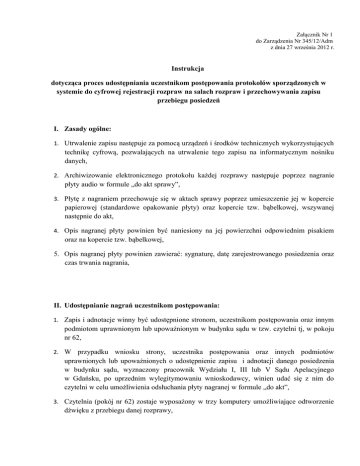 Załącznik Nr 1 do Zarządzenia Nr 345/12/Adm z dnia 27 września 2012 r. Instrukcja dotycząca proces udostępniania uczestnikom postępowania protokołów sporządzonych w systemie do cyfrowej rejestracji rozpraw na salach rozpraw i przechowywania zapisu przebiegu posiedzeń I. Zasady ogólne: 1. Utrwalenie zapisu następuje za pomocą urządzeń i środków technicznych wykorzystujących technikę cyfrową, pozwalających na utrwalenie tego zapisu na informatycznym nośniku danych, 2. Archiwizowanie elektronicznego protokołu każdej rozprawy następuje poprzez nagranie płyty audio w formule „do akt sprawy”, 3. Płytę z nagraniem przechowuje się w aktach sprawy poprzez umieszczenie jej w kopercie papierowej (standardowe opakowanie płyty) oraz kopercie tzw. bąbelkowej, wszywanej następnie do akt, 4. Opis nagranej płyty powinien być naniesiony na jej powierzchni odpowiednim pisakiem oraz na kopercie tzw. bąbelkowej, 5. Opis nagranej płyty powinien zawierać: sygnaturę, datę zarejestrowanego posiedzenia oraz czas trwania nagrania, II. Udostępnianie nagrań uczestnikom postępowania: 1. Zapis i adnotacje winny być udostępnione stronom, uczestnikom postępowania oraz innym podmiotom uprawnionym lub upoważnionym w budynku sądu w tzw. czytelni tj, w pokoju nr 62, 2. W przypadku wniosku strony, uczestnika postępowania oraz innych podmiotów uprawnionych lub upoważnionych o udostępnienie zapisu i adnotacji danego posiedzenia w budynku sądu, wyznaczony pracownik Wydziału I, III lub V Sądu Apelacyjnego w Gdańsku, po uprzednim wylegitymowaniu wnioskodawcy, winien udać się z nim do czytelni w celu umożliwienia odsłuchania płyty nagranej w formule „do akt”, 3. Czytelnia (pokój nr 62) zostaje wyposażony w trzy komputery umożliwiające odtworzenie dźwięku z przebiegu danej rozprawy, 4. Nadzór nad sprzętem komputerowym w czytelni podczas zapoznawania się z treścią e-protokołu przez podmiot upoważniony lub uprawniony będzie sprawował wyznaczony pracownik z Wydziałów I, III, V Sądu Apelacyjnego w Gdańsku. 5. Uprawniony pracownik z Wydziałów I, III i V Sądu Apelacyjnego w Gdańsku odpowiada za usunięcie nagrania z pamięci komputera, po opuszczeniu stanowiska przez interesanta, III. Udostępnianie odpisu protokołu sporządzonego w formie elektronicznej: 1. Zapis dźwięku z przebiegu danego posiedzenia może być wydany z akt sprawy stronom, uczestnikom postępowania oraz innym podmiotom uprawnionym lub upoważnionym na płycie nagranej w formule „dla strony”, 2. Uprawniony pracownik sądu nagrywa na informatyczny nośnik danych (płyta CD) zapis dźwięku w celu udostępnienia podmiotom uprawnionym lub upoważnionym.