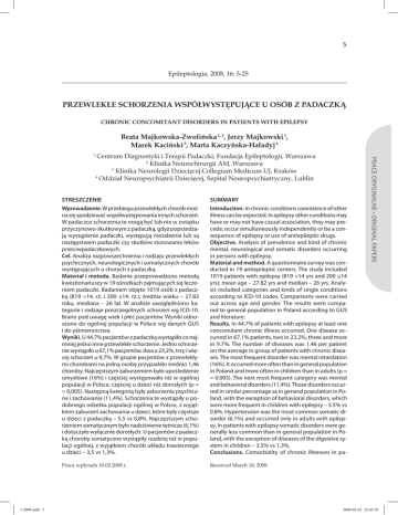 5 Epileptologia, 2008, 16: 5-25 Przewlekłe schorzenia współwystępujące u osób z padaczką Chronic concomitant disorders in patients with epilepsy Beata Majkowska-Zwolińska 1, 2, Jerzy Majkowski 1, Marek Kaciński 3, Marta Kaczyńska-Haładyj 4 1-2008.indd 5 Centrum Diagnostyki i Terapii Padaczki, Fundacja Epileptologii, Warszawa 2 Klinika Neurochirurgii AM, Warszawa 3 Klinika Neurologii Dziecięcej Collegium Medicum UJ, Kraków 4 Oddział Neuropsychiatrii Dziecięcej, Szpital Neuropsychiatryczny, Lublin Streszczenie Wprowadzenie. W przebiegu przewlekłych chorób można się spodziewać współwystępowania innych schorzeń. W padaczce schorzenia te mogą być lub nie w związku przyczynowo-skutkowym z padaczką, gdyż poprzedzają wystąpienie padaczki, występują niezależnie lub są następstwem padaczki czy skutków stosowania leków przeciwpadaczkowych. Cel. Analiza rozpowszechnienia i rodzaju przewlekłych psychicznych, neurologicznych i somatycznych chorób występujących u chorych z padaczką. Materiał i metoda. Badanie przeprowadzono metodą kwestionariuszy w 19 ośrodkach zajmujących się leczeniem padaczki. Badaniem objęto 1019 osób z padaczką (819 >14. rż. i 200 ≤14. rż.); średnia wieku – 27,82 roku, mediana – 26 lat. W analizie uwzględniono kategorie i rodzaje poszczególnych schorzeń wg ICD-10. Brano pod uwagę wiek i płeć pacjentów. Wyniki odnoszono do ogólnej populacji w Polsce wg danych GUS i do piśmiennictwa. Wyniki. U 44,7% pacjentów z padaczką wystąpiło co najmniej jedno inne przewlekłe schorzenie. Jedno schorzenie wystąpiło u 67,1% pacjentów, dwa u 23,2%, trzy i więcej schorzeń u 9,7%. W grupie pacjentów z przewlekłymi chorobami na jedną osobę przypadało średnio 1,46 choroby. Najczęstszym zaburzeniem było upośledzenie umysłowe (16%) i częściej występowało niż w ogólnej populacji w Polsce; częściej u dzieci niż dorosłych (p = = 0,005). Następną kategorią były zaburzenia psychiczne i zachowania (11,4%). Schorzenia te wystąpiły u podobnego odsetka populacji ogólnej w Polsce, z wyjątkiem zaburzeń zachowania u dzieci, które były częstsze u dzieci z padaczką – 5,5 vs 0,8%. Najczęstszym schorzeniem somatycznym było nadciśnienie tętnicze (6,1%) i dotyczyło wyłącznie dorosłych. U pacjentów z padaczką choroby somatyczne wystąpiły rzadziej niż w populacji ogólnej, z wyjątkiem chorób układu trawiennego u dzieci – 3,5 vs 1,3%. Summary Introduction. In chronic conditions coexistence of other illness can be expected. In epilepsy other conditions may have or may not have causal association, they may precede, occur simultaneously independently or be a consequence of epilepsy or use of antiepileptic drugs. Objective. Analysis of prevalence and kind of chronic mental, neurological and somatic disorders occurring in persons with epilepsy. Material and method. A questionnaire survey was conducted in 19 antiepileptic centers. The study included 1019 patients with epilepsy (819 >14 yrs and 200 ≤14 yrs); mean age – 27.82 yrs and median – 26 yrs. Analysis included categories and kinds of single conditions according to ICD-10 codes. Comparisons were carried out across age and gender. The results were compared to general population in Poland according to GUS and literature. Results. In 44.7% of patients with epilepsy at least one concomitant chronic illness occurred. One disease occurred in 67.1% patients, two in 23.2%, three and more in 9.7%. The number of diseases was 1.46 per patient on the average in group of patients with chronic diseases. The most frequent disorder was mental retardation (16%). It occurred more often than in general population in Poland and more often in children than in adults (p = = 0.005). The next most frequent category was mental and behavioral disorders (11.4%). Those disorders occurred in similar percentage as in general population in Poland, with the exception of behavioral disorders, which were more frequent in children with epilepsy – 5.5% vs 0.8%. Hypertension was the most common somatic disorder (6.1%) and occurred only in adults with epilepsy. In patients with epilepsy somatic disorders were generally less common than in general population in Poland, with the exception of diseases of the digestive system in children – 3.5% vs 1.3%. Conclusions. Comorbidity of chronic illnesses in pa- Praca wpłynęła 10.03.2008 r. Received March 10, 2008. Prace oryginalne • Original papers 1 2008-03-24 22:45:10 6 Prace oryginalne • Original papers Beata Majkowska-Zwolińska i wsp. 1-2008.indd 6 Wnioski. Współwystępowanie przewlekłych chorób u osób z padaczką jest częste i dotyczyło blisko połowy wszystkich pacjentów. Najczęstszymi zaburzeniami u osób z padaczką było upośledzenie umysłowe, nadciśnienie tętnicze, zaburzenia psychiczne i zachowania. W porównaniu z populacją ogólną w Polsce w badanym materiale częściej występowało upośledzenie umysłowe u dorosłych i dzieci oraz zaburzenia zachowania i zaburzenia układu trawiennego u dzieci. Słowa kluczowe: Padaczka – Współwystępujące schorzenia – Choroby somatyczne – Upośledzenie umysłowe – Zaburzenia psychiczne i zachowania Wprowadzenie W spółwystępowanie chorób oznacza obecność więcej niż jednej choroby u tej samej osoby. Nieliczne badania populacyjne wskazują, że u osób z padaczką zarówno choroby psychiczne, jak i somatyczne mogą występować od dwóch do pięciu razy częściej niż w populacji ogólnej (Gaitatzis i wsp., 2004; Tellez-Zenteno i wsp., 2005). Schorzenia te są lub nie w związku przyczynowo-skutkowym z padaczką; mogą one poprzedzać wystąpienie padaczki, występować niezależnie lub być następstwem napadów padaczki czy stosowania leków przeciwpadaczkowych (LPP). U pacjentów z padaczką współwystępujące choroby mogą negatywnie wpływać na ogólny stan zdrowia, przebieg i koszty padaczki oraz wpływać na jakość życia. Wiedza o 