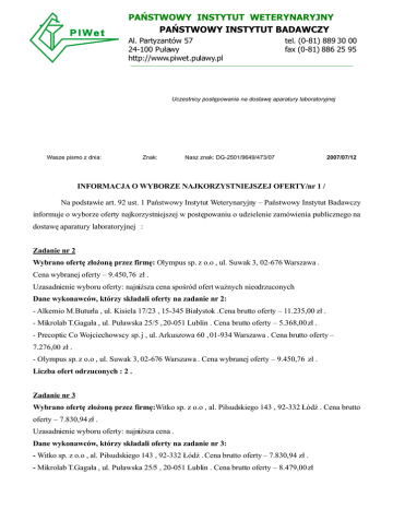 Informacja o wyborze oferty nr 2 - Państwowy Instytut Weterynaryjny