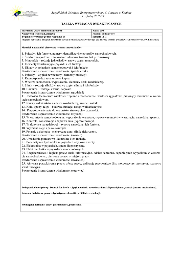Zespół Szkół Górniczo-Energetycznych im. S. Staszica w Koninie rok szkolny 2016/17 TABELA WYMAGAŃ DYDAKTYCZNYCH Przedmiot: Język niemiecki zawodowy Klasa: 3PS Nauczyciel: Wioletta Łusiaczyk Poziom: podstawowy Tygodniowy wymiar godzin wg planu: 1h Semestr I i II Program nauczania: Program nauczania języka niemieckiego zawodowego dla zawodu technik pojazdów samochodowych. (W.Łusiaczyk) Materiał nauczania i planowane terminy sprawdzianów: 1. Pojazdy i ich funkcje, numery identyfikacyjne pojazdów samochodowych. 2. Środki transportowe, zamawianie i dostawa towaru, list przewozowy. 3. Motocykle – rodzaje jednośladów, nazwy części motocykla. 4. Elementy konstrukcyjne pojazdu i ich funkcje. 5. Układy w pojazdach samochodowych i ich funkcje. Powtórzenie i sprawdzenie wiadomości (październik) 6. Pojazdy – wygląd zewnętrzny (elementy budowy). 7. Kupno/sprzedaż auta, umowa kupna. 8. Wnętrze samochodu, wyposażenie, elementy deski rozdzielczej. 9. Silnik – rodzaje silników, nazwy części silnika i ich funkcje. 10. Hamulce – rodzaje, awarie, naprawa. Powtórzenie i sprawdzenie wiadomości (grudzień) 11. Jednostki techniczne: wielkości fizyczne i mechaniczne, wartości sygnałowe, przyrządy miernicze w warsztacie samochodowym. 12. Nazwy wskaźników na desce rozdzielczej, awarie i usterki. 13. Koła, opony, felgi - budowa, funkcje, usługi wulkanizacyjne. 14. Przygotowanie auta do warunków zimowych – czynności. Powtórzenie i sprawdzenie wiadomości (styczeń) 15. W warsztacie samochodowym: wyposażenie warsztatu, typowe czynności w warsztacie, narzędzia i sprzęty. 16. Kontrola, konserwacja i naprawa auta (typowe zwroty). 17. W skrzynce narzędziowej – typowe narzędzia i ich funkcje. 18. Wymiana oleju i paska rozrządu. 19. Pojazdy a ekologia - elektryczne auto, silnik elektryczny. Powtórzenie i sprawdzenie wiadomości (marzec) 20. Urządzenia pomiarowe i kontrolne i ich funkcje. 21. Pneumatyka i hydraulika w pojazdach – typowe zwroty. 22. Elektronika w pojazdach, sprzęt diagnostyczny. 23. Elektrotechnika w pojazdach samochodowych. 24. Bezpieczeństwo i higiena pracy: znaki informacyjne, odzież ochronna, zapobieganie wypadkom w warsztacie samochodowym, pierwsza pomoc w miejscu pracy. Powtórzenie i sprawdzenie wiadomości (kwiecień) 25. Aktywne poszukiwanie pracy: oferty pracy, aplikacje pracownicze (list motywacyjny, życiorys), rozmowa kwalifikacyjna. Powtórzenie i sprawdzenie wiadomości (czerwiec) Podręcznik obowiązkowy: Deutsch für Profis – Język niemiecki zawodowy dla szkół ponadgimnazjalnych (branża mechaniczna). Zalecane dodatkowe pomoce dydaktyczne: słowniki (w bibliotece szkolnej). Wymagania formalne: zeszyt przedmiotowy, podręcznik.