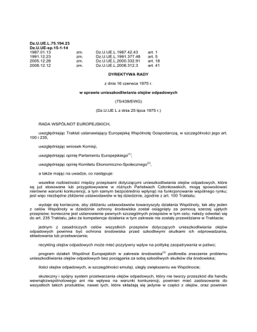 Dz.U.UE.L.75.194.23 Dz.U.UE-sp.15-1-14 1987.01.13 1991.12.23 2005.12.28 2008.12.12 zm. zm. zm. zm. Dz.U.UE.L.1987.42.43 Dz.U.UE.L.1991.377.48 Dz.U.UE.L.2000.332.91 Dz.U.UE.L.2008.312.3 art. 1 art. 5 art. 18 art. 41 DYREKTYWA RADY z dnia 16 czerwca 1975 r. w sprawie unieszkodliwiania olejów odpadowych (75/439/EWG) (Dz.U.UE L z dnia 25 lipca 1975 r.) RADA WSPÓLNOT EUROPEJSKICH, uwzględniając Traktat ustanawiający Europejską Wspólnotę Gospodarczą, w szczególności jego art. 100 i 235, uwzględniając wniosek Komisji, uwzględniając opinię Parlamentu Europejskiego(1), uwzględniając opinię Komitetu Ekonomiczno-Społecznego(2), a także mając na uwadze, co następuje: wszelkie rozbieżności między przepisami dotyczącymi unieszkodliwiania olejów odpadowych, które są już stosowane lub przygotowywane w różnych Państwach Członkowskich, mogą spowodować nierówne warunki konkurencji, a tym samym bezpośrednio wpłynąć na funkcjonowanie wspólnego rynku; jest więc niezbędne zbliżenie ustawodawstw w tej dziedzinie, zgodnie z art. 100 Traktatu; wydaje się konieczne, aby zbliżaniu ustawodawstw towarzyszyły działania Wspólnoty, tak aby jeden z celów Wspólnoty w dziedzinie ochrony środowiska został osiągnięty za pomocą szerzej ujętych przepisów; konieczne jest ustanowienie pewnych szczególnych przepisów w tym celu; należy odwołać się do art. 235 Traktatu, jako że kompetencje działania w tym zakresie nie zostały przewidziane w Traktacie; jednym z zasadniczych celów wszystkich przepisów dotyczących unieszkodliwiania olejów odpadowych powinna być ochrona środowiska przed szkodliwymi skutkami ich odprowadzania, składowania lub przetwarzania; recykling olejów odpadowych może mieć pozytywny wpływ na politykę zaopatrywania w paliwo; program działań Wspólnot Europejskich w zakresie środowiska(3) podkreśla znaczenie problemu unieszkodliwiania olejów odpadowych bez pociągania za sobą szkodliwych skutków dla środowiska; ilości olejów odpadowych, w szczególności emulsji, uległy zwiększeniu we Wspólnocie; skuteczny i spójny system przetwarzania olejów odpadowych, który nie tworzy przeszkód dla handlu wewnątrzwspólnotowego ani nie wpływa na warunki konkurencji, powinien mieć zastosowanie do wszystkich takich produktów, nawet tych, które składają się jedynie w części z olejów, oraz powinien przewidywać możliwość ich bezpiecznego przetworzenia w warunkach zadowalających pod względem ekonomicznym; taki system powinien regulować przetwarzanie, odprowadzanie, składowanie oraz zbieranie olejów odpadowych oraz przewidywać stworzenie systemu zezwoleń dla przedsiębiorstw, które unieszkodliwiają takie oleje, obowiązkowe zbieranie i/lub unieszkodliwianie takich olejów w niektórych przypadkach oraz odpowiednie procedury kontrolne; w przypadku gdy niektóre przedsiębiorstwa są zobowiązane do zbierania i/lub unieszkodliwiania olejów odpadowych, powinno się umożliwić rekompensatę części poniesionych przez nie kosztów w tym zakresie oraz nieobjętych przez ich dochody, a powyższe rekompensaty mogą być finansowane, między innymi poprzez opłaty nakładane na nowe lub regenerowane oleje, PRZYJMUJE NINIEJSZĄ DYREKTYWĘ: Artykuł 1 – – – – – – Dla celów niniejszej dyrektywy: »oleje odpadowe« oznaczają: wszelkie, oparte na składnikach mineralnych, oleje smarownicze lub przemysłowe, które są już niezdatne do wykorzystania zgodnie z pierwotnym przeznaczeniem, w szczególności oleje do silników spalinowych i skrzyni biegów, a także mineralne oleje smarownicze, oleje do turbin i oleje hydrauliczne; »unieszkodliwianie« oznacza: przetwarzanie lub niszczenie olejów odpadowych, a także ich składowanie na ziemi lub pod ziemią; »przetwarzanie« oznacza: działania prowadzące do zapewnienia możliwości ponownego wykorzystania olejów odpadowych, czyli regenerację lub spalanie; »regeneracja« oznacza: jakikolwiek proces, w którym oleje utlenione są produkowane w wyniku rafinacji olejów odpadowych, w szczególności przez usunięcie znajdujących się w nich zanieczyszczeń, produktów reakcji utleniania i domieszek; »spalanie« oznacza: wykorzystanie olejów odpadowych jako paliwa wytwarzającego ciepło, odpowiednio odzyskiwane; »gromadzenie« oznacza: jakiekolwiek działania, podczas których oleje odpadowe są zabierane od ich posiadaczy przez przedsiębiorstwa, które dokonują ich unieszkodliwienia. Artykuł 2 Bez uszczerbku dla przepisów dyrektywy 78/319/EWG(4) Państwa Członkowskie podejmują niezbędne kroki w celu zagwarantowania gromadzenia i unieszkodliwiania olejów odpadowych, nie powodując przy tym jakichkolwiek możliwych do uniknięcia szkód dla człowieka i środowiska naturalnego. Artykuł 3 1. Jeżeli techniczne, ekonomiczne i organizacyjne ograniczenia na to pozwalają, Państwa Członkowskie podejmują środki konieczne do nadania priorytetu przetwarzaniu olejów odpadowych przez ich regenerację. 2. Jeżeli oleje odpadowe nie podlegają regeneracji z uwagi na ograniczenia wymienione w ust. 1 powyżej, Państwa Członkowskie podejmują niezbędne środki w celu zagwarantowania spalania olejów odpadowych w warunkach możliwych do zaakceptowania z punktu widzenia ochrony środowiska i zgodnie z przepisami niniejszej dyrektywy, pod warunkiem że spalanie jest technicznie, ekonomicznie i organizacyjnie wykonalne. 3. Jeżeli oleje odpadowe nie są regenerowane ani spalane ze względu na ograniczenia wspomniane w ust. 1 i 2 powyżej, Państwa Członkowskie podejmują niezbędne środki w celu zagwarantowania ich bezpiecznego zniszczenia lub składowania. Artykuł 4 a) b) c) Państwa Członkowskie podejmują niezbędne środki w celu wprowadzenia zakazu: wylewania olejów odpadowych do powierzchniowych wód śródlądowych, morskich wód terytorialnych i sieci kanalizacyjnych; przechowywania lub wylewania olejów odpadowych w sposób zagrażający zanieczyszcz