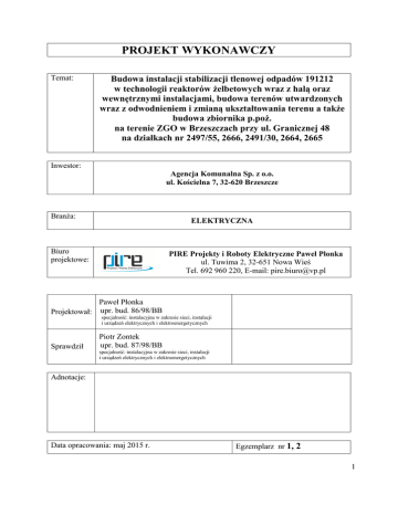PROJEKT WYKONAWCZY Temat: Budowa instalacji stabilizacji tlenowej odpadów 191212 w technologii reaktorów żelbetowych wraz z halą oraz wewnętrznymi instalacjami, budowa terenów utwardzonych wraz z odwodnieniem i zmianą ukształtowania terenu a także budowa zbiornika p.poż. na terenie ZGO w Brzeszczach przy ul. Granicznej 48 na działkach nr 2497/55, 2666, 2491/30, 2664, 2665 Inwestor: Agencja Komunalna Sp. z o.o. ul. Kościelna 7, 32-620 Brzeszcze Branża: ELEKTRYCZNA Biuro projektowe: PIRE Projekty i Roboty Elektryczne Paweł Płonka ul. Tuwima 2, 32-651 Nowa Wieś Tel. 692 960 220, E-mail: [email protected] Paweł Płonka Projektował: upr. bud. 86/98/BB specjalność: instalacyjna w zakresie sieci, instalacji i urządzeń elektrycznych i elektroenergetycznych Sprawdził Piotr Zontek upr. bud. 87/98/BB specjalność: instalacyjna w zakresie sieci, instalacji i urządzeń elektrycznych i elektroenergetycznych Adnotacje: Data opracowania: maj 2015 r. Egzemplarz nr 1, 2 1 Zawartość 1. Podstawa opracowania 2. Zakres projektu. 3. Opis techniczny. 3.1. Układ zasilania w energię elektryczną. 3.2. Główny wyłącznik zasilania (Wyłącznik P.POŻ.) 3.3. Rozdzielnia główna 0,4kV RGK. 3.4. Szafki sterownicze RBx. 3.5. Wewnętrzne linie zasilające. 3.6. Koryta kablowe. Sposób układania przewodów. 3.7. Instalacja gniazd wtykowych. 3.8. Instalacja oświetleniowa. 3.9. Instalacja zasilania urządzeń wentylacji. 3.10. Instalacja uziemiająca. 3.11. Instalacja połączeń wyrównawczych. 3.12. Ochrona przeciwporażeniowa. 3.13. Ochrona odgromowa. 3.14. Ochrona przepięciowa. 4. Kontener sterujący. 5. Opis techniczny instalacji AKPiA 6. Obliczenia techniczne. 6.1. Bilans mocy 6.2. Dobór zabezpieczeń i przewodów 6.3. Sprawdzenie skuteczności ochrony przeciwporażeniowej 6.4. Sprawdzenie spadków napięć Oświadczenie Projektanta i Sprawdzającego Rysunki: Rys. nr 1 - Plan Zagospodarowania terenu. Rys. nr 2 – Plan instalacji uziemienia. Rys. nr 3 – Plan instalacji gniazd i wypustów. Trasy kablowe. Rys. nr 4 – Plan instalacji oświetlenia. Rys. nr 5 – Schemat rozdzielni RGK. Rys. nr 6 – Schemat rozdzielni RB (1-7). Rys. nr 7 – Profil przepustów kablowych pod ścianami budynku. Rys. nr 8 – Schemat układu AKPiA Rys. nr 9 – Kontener sterujący. 1. a) b) c) d) Podstawa opracowania Zlecenie Inwestora na wykonanie dokumentacji projektowej. Projekt architektoniczny. Wytyczne Inwestora dot. funkcjonalności projektowanych instalacji. Norma międzynarodowa wieloarkuszowa PN-IEC 60364. Instalacje elektryczne w obiektach budowlanych. e) Rozporządzenie Ministra Infrastruktury w sprawie warunków technicznych jakim powinny odpowiadać budynki i ich usytuowanie. f) PN-EN 12464-1 Światło i oświetlenie. Oświetlenie miejsc pracy. Część 1. Miejsca pracy we wnętrzach, 2. Zakres projektu. Projekt obejmuje: a) wewnętrzną kablową linii zasilająca, b) rozdzielnię główną 0,4kV (RGK) - rozdzielnia główna projektowanej hali, c) instalacje gniazd wtykowych i zasilania odbiorników stałych 1- i 3-fazowych, d) instalacje oświetleniową – oświetlenie wewnętrzne i zewnętrzne, e) instalację uziemiającą i wyrównawczą. 3. Opis techniczny. 3.1. Układ zasilania w energię elektryczną. Zasilanie projektowanego obiektu będzie realizowane z istniejącego przyłącza kablowego 0,4kV poprzez istniejący układ pomiarowo-rozliczeniowy. Zapotrzebowanie na moc elektryczną projektowanej hali (40kW) jest ujęte w aktualnej mocy przyłączeniowej 80kW. Inwestor przygotowując się do realizacji inwestycji zwiększył moc przyłączeniową z 40kW – na potrzeby budynku biurowego do 80 kW – 40kW biurowiec i 40kW hala kompostowni. Istniejący przyłącze energetyczne o mocy przyłączeniowej 80 kW pokryje w całości zapotrzebowania na moc istniejącego budynku biurowego i projektowanej hali. Z szafki bezpiecznikowej zlokalizowanej obok zestawu złączowo-pomiarowego zlokalizowanego na działce 2664 zostanie poprowadzona wewnętrzna kablowa linia zasilająca (wlz) do rozdzielni głównej 0,4kV projektowanej hali. Podstawowe parametry układu zasilania: a) moc przyłączeniowa 80kW (40kW na potrzeby projektowanej hali), b) napięcia zasilania 0,4kV, c) układ sieci – TN-C, d) wymagany tgφ ≤0,4. 3.2. Główny wyłącznik zasilania (Wyłącznik P.POŻ.) W rozdzielni głównej RGK należy zabudować rozłącznik izolacyjny wyposażony w cewkę wzrostową pełniący funkcje głównego wyłącznika zasilania (WYŁ.P.POŻ.). Sterowanie rozłącznikiem odbywać się będzie poprzez przycisk ROP zlokalizowany przy wejściu do hali. Obwód sterowania wyłącznikiem p.poż. wykonać przewodem NTGs 2x1,5. 3.3. Rozdzielnia główna 0,4kV RGK. W celu uzyskania funkcjonalnego układu zasilania poszczególnych fragmentów instalacji elektrycznej w obiekcie należy wykonać w kontenerze sterującym rozdzielnię główna 0,4kV. Projektowaną rozdzielnie należy zabudować w szafce o stopniu ochrony od czynników zewnętrznych min. IP 30 i I klasie ochronności. Do budowy rozdzielnicy należy zastosować obudowy oraz urządzenia produkcji Legrand lub Eaton. W rozdzielni RGK należy pozostawić rezerwę miejsca pod zabudową zabezpieczeń do wykorzystania w przypadku rozbudowy instalacji np. o instalacje fotowoltaiczną. Szafę rozdzielni wyposażyć w wymagane znaki ostrzegawcze oraz jednoznaczne opisy. Przewody obwodowe podłączyć do szyn N i PE oraz do zacisków odpływowych zabezpieczeń. 3.4. Szafki sterownicze RBx. Układy zasilania i sterowania urządzeniami technologicznymi poszczególnych reaktorów umieścić w siedmiu szafkach sterowniczych od RB1 do RB7. Do wykonania szafek zastosować obudowy z tworzywa termoutwardzalnego wykonane w II klasie ochronności i ochronie od czynników zewnętrznych IP 44. Wszelkie przewody i kable do szafek należy wprowadzać poprzez dławiki uszczelniające. Każdą szafkę sterowniczą wyposażyć w: a) rozłącznik izolacyjny, b) wskaźnik