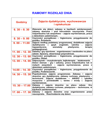 RAMOWY ROZKŁAD DNIA Godziny Zajęcia dydaktyczne, wychowawcze i opiekuńcze 6. 30 – 8. 30 Zbieranie się dzieci, zabawy w kącikach zainteresowań, zabawy dowolne i pod kierunkiem nauczyciela. Praca indywidualna lub zespołowa – zajęcia wyrównawcze, praca z dzieckiem uzdolnionym. Czynności porządkowo – higieniczne, przygotowanie do posiłku. Śniadanie. Zajęcia według podstawy programowej, dodatkowe zajęcia dydaktyczne ( język angielski, rytmika , zajęcia logopedyczne, warsztaty plastyczne, terapia pedagogiczna). Zabawy i gry sportowe , organizowane i swobodne na placu zabaw. Spacery, obserwacje przyrodnicze. Czynności porządkowo – higieniczne, przygotowanie do posiłku. Obiad. Odpoczynek – muzykoterapia, bajkoterapia , leżakowanie. Dzieci starsze – gry i zabawy, praca indywidualna lub w małych zespołach – zajęcia wyrównawcze, praca z dzieckiem uzdolnionym. Czynności porządkowo – higieniczne, przygotowanie do posiłku. Podwieczorek. Popołudniowe zajęcia programowe. Zabawy i zajęcia dowolne, gry dydaktyczne, zabawy ruchowe, plastyczno – techniczne. Zajęcia dodatkowe – AIKIDO i szkółka muzyczna / poniedziałki /, taniec / środy /. Zajęcia wyrównawcze. Zabawy i zajęcia dowolne na placu zabaw. Gry dydaktyczne, zabawy ruchowe, plastyczno – techniczne, w kącikach zainteresowań. Zabawy i zajęcia dowolne oraz organizowane przez nauczyciela. Rozchodzenie się dzieci. 8. 30 – 9. 00 9. 00 – 11.00 11. 00 – 12. 30 12. 30 – 13. 00 13. 00 – 14. 00 14.00 – 14. 30 14. 30 – 15. 30 15. 30 – 17.00 17. 00 – 17. 30