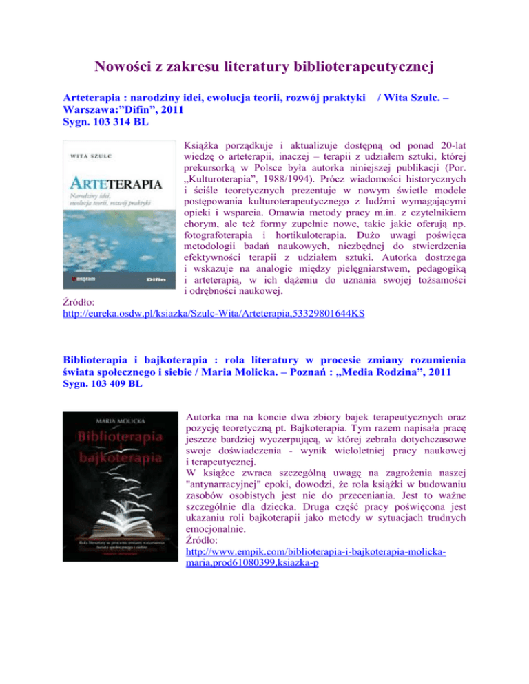 Nowości z zakresu literatury biblioterapeutycznej Arteterapia : narodziny idei, ewolucja teorii, rozwój praktyki Warszawa:”Difin”, 2011 Sygn. 103 314 BL / Wita Szulc. – KsiąŜka porządkuje i aktualizuje dostępną od ponad 20-lat wiedzę o arteterapii, inaczej – terapii z udziałem sztuki, której prekursorką w Polsce była autorka niniejszej publikacji (Por. „Kulturoterapia”, 1988/1994). Prócz wiadomości historycznych i ściśle teoretycznych prezentuje w nowym świetle modele postępowania kulturoterapeutycznego z ludźmi wymagającymi opieki i wsparcia. Omawia metody pracy m.in. z czytelnikiem chorym, ale teŜ formy zupełnie nowe, takie jakie oferują np. fotografoterapia i hortikuloterapia. DuŜo uwagi poświęca metodologii badań naukowych, niezbędnej do stwierdzenia efektywności terapii z udziałem sztuki. Autorka dostrzega i wskazuje na analogie między pielęgniarstwem, pedagogiką i arteterapią, w ich dąŜeniu do uznania swojej toŜsamości i odrębności naukowej. Źródło: http://eureka.osdw.pl/ksiazka/Szulc-Wita/Arteterapia,53329801644KS Biblioterapia i bajkoterapia : rola literatury w procesie zmiany rozumienia świata społecznego i siebie / Maria Molicka. – Poznań : „Media Rodzina”, 2011 Sygn. 103 409 BL Autorka ma na koncie dwa zbiory bajek terapeutycznych oraz pozycję teoretyczną pt. Bajkoterapia. Tym razem napisała pracę jeszcze bardziej wyczerpującą, w której zebrała dotychczasowe swoje doświadczenia - wynik wieloletniej pracy naukowej i terapeutycznej. W ksiąŜce zwraca szczególną uwagę na zagroŜenia naszej "antynarracyjnej" epoki, dowodzi, Ŝe rola ksiąŜki w budowaniu zasobów osobistych jest nie do przeceniania. Jest to waŜne szczególnie dla dziecka. Druga część pracy poświęcona jest ukazaniu roli bajkoterapii jako metody w sytuacjach trudnych emocjonalnie. Źródło: http://www.empik.com/biblioterapia-i-bajkoterapia-molickamaria,prod61080399,ksiazka-p Jesteśmy wyjątkowi : bajki, które pomagają dzieciom zrozumieć chorych rówieśników / Paola Viezzer. – Kraków : Wydaw. ESPe, 2011 Sygn. 103 461 BL Jest to zbiór mądrych, pełnych ciepła opowiadań, dzięki którym łatwiej wyjaśnić dziecku kwestie odmienności, niepełnosprawności i niektórych chorób – dlaczego jego brat, siostra czy przyjaciel ma szczególny wygląd, zachowuje się w sposób niezrozumiały czy czasem źle się czuje. KsiąŜka nie wyjaśnia dolegliwości od strony medycznej, lecz pomaga dorosłym w znalezieniu prostych słów, gdy rozmawiają z dzieckiem na przykład o epilepsji, zespole Downa, jąkaniu, zaburzeniu rozpoznawania emocji, nadpobudliwości, moczeniu nocnym, niepełnosprawności czy cukrzycy. Adresatami tych opowiadań są więc zarówno dzieci, jak i rodzice, wychowawcy i nauczyciele. Źródło: http://gloria24.pl/ksiazki/jestesmy,wyjatkowi-710-99339184.html Księga Julii / Dorota Bałuszyńska-Srebro. – Gdynia : Nvae Res &Dorota Bałuszyńska-Srebro, 2011 Sygn. 103 2710 BL Księga Julii to opowieść o poszukiwaniu niezwykłości w codziennym Ŝyciu. O tym, Ŝe otaczające nas rzeczy wcale nie są takie zwyczajne, jeśli tylko umie się spojrzeć na nie z innej perspektywy. To ksiąŜka opowiadająca o odkrywaniu piękna i radości w codziennych zmaganiach, a takŜe o samotności, potrzebie przyjaźni i marzeniach. „Księga Julii” to poruszająca historia dziecka samotnego pośród rodziny. Julia pozostawiona bez wsparcia, ciepła i miłości ucieka przed cierpieniem w świat wyobraźni, bajek, baśni i odkrywanych cudów natury. Ten magiczny świat jest zawsze tuŜ obok, w nim znajduje odpowiedzi na trudne pytania. Mądrość płynąca z ksiąŜek i obserwowanej wnikliwie przyrody staje się dla dziewczynki przewodnikiem po świecie wartości. Uczy, jak odróŜnić dobro od zła, prawdę od fałszu, uczciwość od nieprawości. To bardzo osobliwa ksiąŜka, przynosząca nadzieję na to, Ŝe nawet w najbardziej trudnych warunkach moŜna odnaleźć w sobie siłę, aby wzrastać. Violetta Bieszczad – psycholog, specjalista w zakresie terapii uzaleŜnień i przemocy w rodzinie. KsiąŜka została nominowana do nagrody "KsiąŜka roku 2010" Stowarzyszenia Ibby. Źródło: http://www.empik.com/ksiega-julii-baluszynska-srebro-dorota,prod59466074,ksiazka-p Magia ogrodów czyli o terapeutycznej funkcji ogrodów / Irena Borecka. – Kraków : Oficyna Wydawnicza „Impuls”, 2010 Sygn. 102 724 – 5 BL Niniejsze opracowanie prezentuje autorski program terapeutyczny, zatytułowany W tajemniczych ogrodach. Celem programu jest umoŜliwienie młodym, niepełnosprawnym ludziom kontaktu z literaturą młodzieŜową i wybranymi dziełami plastycznymi, których motywem przewodnich jest ogród. Inspiracją do zajęć terapeutycznych były: ogrody z utworu Marii Borowej Ogrody i ogród z utworu Frances Hodgson Burnett Tajemniczy ogród. Aby wzmocnić terapeutyczne oddziaływanie wybranych dzieł literackich i plastycznych, większość zajęć warto zrealizować w naturalnym środowisku ogrodu, parku, lasu? Program został oparty na załoŜeniu, Ŝe odpowiednio dobrany zestaw lektur i zastosowanie technik biblioterapeutycznych i arteterapeutycznych mogą być formą wspierania aktywności intelektualnej osób niepełnosprawnych, przyczyniającą się do kształtowania podmiotowego stylu ich funkcjonowania. ZałoŜono równieŜ, Ŝe archetypowa wartość ogrodu i jego symbolika oraz działania plastyczne i tworzenie własnych utworów literackich mają pozytywny wpływ na psychikę i pozwolą osiągnąć zamierzony efekt terapeutyczny. Efekt terapeutyczny zaproponowanego programu to takie oddziaływanie sztuki na tworzącego, które pomoŜe mu odzyskać wewnętrzną, psychiczną harmonię, przyczyni się do odnalezienia właściwego miejsca w Ŝyciu i do akceptacji siebie jako osoby nie w pełni sprawnej fizycznie. Opracowanie zawiera nie tylko rozwaŜania teoretyczne, lecz jest takŜe próbą podzielenia się z czytelnikie