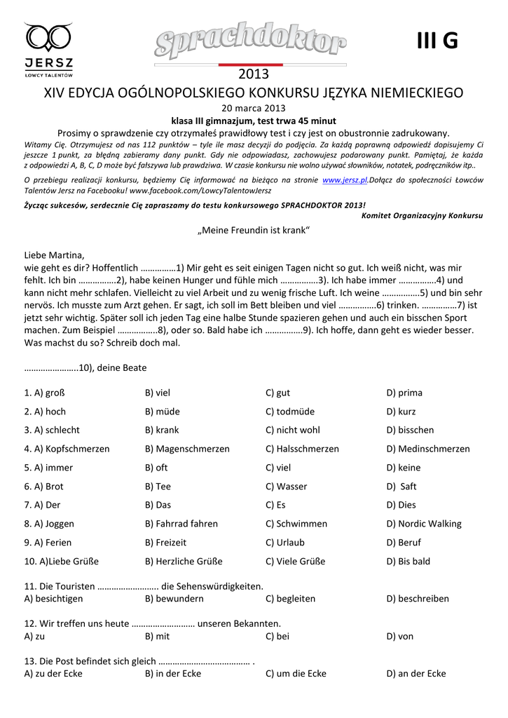 III G 2013 XIV EDYCJA OGÓLNOPOLSKIEGO KONKURSU JĘZYKA NIEMIECKIEGO 20 marca 2013 klasa III gimnazjum, test trwa 45 minut Prosimy o sprawdzenie czy otrzymałeś prawidłowy test i czy jest on obustronnie zadrukowany. Witamy Cię. Otrzymujesz od nas 112 punktów – tyle ile masz decyzji do podjęcia. Za każdą poprawną odpowiedź dopisujemy Ci jeszcze 1 punkt, za błędną zabieramy dany punkt. Gdy nie odpowiadasz, zachowujesz podarowany punkt. Pamiętaj, że każda z odpowiedzi A, B, C, D może być fałszywa lub prawdziwa. W czasie konkursu nie wolno używać słowników, notatek, podręczników itp.. O przebiegu realizacji konkursu, będziemy Cię informować na bieżąco na stronie www.jersz.pl.Dołącz do społeczności Łowców Talentów Jersz na Facebooku! www.facebook.com/LowcyTalentowJersz Życząc sukcesów, serdecznie Cię zapraszamy do testu konkursowego SPRACHDOKTOR 2013! Komitet Organizacyjny Konkursu „Meine Freundin ist krank“ Liebe Martina, wie geht es dir? Hoffentlich ……………1) Mir geht es seit einigen Tagen nicht so gut. Ich weiß nicht, was mir fehlt. Ich bin …………….2), habe keinen Hunger und fühle mich …………….3). Ich habe immer …………….4) und kann nicht mehr schlafen. Vielleicht zu viel Arbeit und zu wenig frische Luft. Ich weine …………….5) und bin sehr nervös. Ich musste zum Arzt gehen. Er sagt, ich soll im Bett bleiben und viel …………….6) trinken. ……………7) ist jetzt sehr wichtig. Später soll ich jeden Tag eine halbe Stunde spazieren gehen und auch ein bisschen Sport machen. Zum Beispiel ……………..8), oder so. Bald habe ich …………….9). Ich hoffe, dann geht es wieder besser. Was machst du so? Schreib doch mal. …………………..10), deine Beate 1. A) groß B) viel C) gut D) prima 2. A) hoch B) müde C) todmüde D) kurz 3. A) schlecht B) krank C) nicht wohl D) bisschen 4. A) Kopfschmerzen B) Magenschmerzen C) Halsschmerzen D) Medinschmerzen 5. A) immer B) oft C) viel D) keine 6. A) Brot B) Tee C) Wasser D) Saft 7. A) Der B) Das C) Es D) Dies 8. A) Joggen B) Fahrrad fahren C) Schwimmen D) Nordic Walking 9. A) Ferien B) Freizeit C) Urlaub D) Beruf 10. A)Liebe Grüße B) Herzliche Grüße C) Viele Grüße D) Bis bald 11. Die Touristen …………………….. die Sehenswürdigkeiten. A) besichtigen B) bewundern C) begleiten D) beschreiben 12. Wir treffen uns heute ……………………… unseren Bekannten. A) zu B) mit C) bei D) von 13. Die Post befindet sich gleich ………………………………… . A) zu der Ecke B) in der Ecke D) an der Ecke C) um die Ecke 14. „Können Sie Fußball spielen?“ Welche Antwort ist richtig? A) Nein, das kann ich leider nicht. B) Nein, ich kann das leider nicht. C) Nein, leider kann ich das nicht. D) Nein, nicht leider kann ich das. 15. Tante Erna …………………… Kartoffeln. A) schält B) schneidet C) kocht D) brät 16. Wir lernen Fremdsprachen, ………………….. wir ins Ausland fahren wollen. A) ob B) weil C) dass D) wenn 17. Das Brandenburger Tor befindet sich ……………………………… . A) in Wien B) In Österreich C) in Berlin D) in Deutschland 18. Mein Bein tut mir weh. Ich kann nicht ……………………………. . A) laufen B) springen C) gehen D) reden 19. Was ist kein Möbelstück? A) der Kleiderschrank B) der Fahrstuhl C) der Küchenschrank D) der Liegestuhl 20. Welche Fragen sind richtig? A) Wobei helfen sie uns? C) Wonach fragen sie uns? B) Worüber sprechen die Schüler? D) Womit fahren sie zur Schule? 21. Onkel Max ist ………………………….. geboren. A) im 1950 B) 1950 C) im Jahre 1950 D) im 1950 Jahr 22. Was ist richtig? A) gern – am liebsten C) dunkel – am dunkelsten D) alt – am altesten B) viel – am vielsten 23. Während ……………….. Sommerferien fahren wir ans Meer. A) den B) der C) dieser D) unserer 24. Meine Tante arbeitet ………………………… bei Siemens. A) vor fünf Jahren B) seit fünf Jahren C) mit fünf Jahre D) fünf Jahre 25. Olaf ist müde. Er will sich …………………………. . A) in den Stuhl sitzen C) auf dem Sofa liegen B) ins Bett legen D) in den Sessel setzen 26. Du hast den Satz schön ……………………………….. . A) geschreiben B) aussprechen C) gelesen 27. Ergänze richtig! „Meine Wohnung ………………………… .“ A) finde ich schön B) ist in einem Reihenhaus C) liegt auf dem Balkon 28. Wie sagt man das auf Deutsch? A) port – der Hafen C) pomnik – das Denkmal PARTNERZY B) wieża – das Tor D) ratusz – das Rathaus PATRONI © Copyright by ŁOWCY TALENTÓW – JERSZ, Wilczyn 2013, www.jersz.pl D) gesagt D) hat neue Möbel