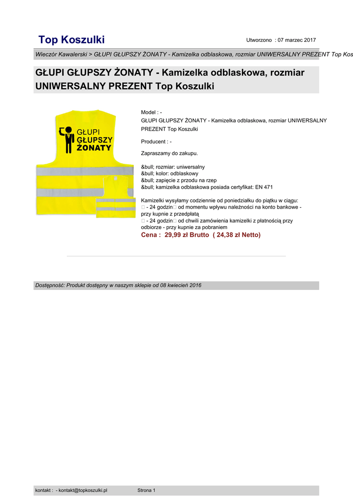 Top Koszulki Utworzono : 07 marzec 2017 Wieczór Kawalerski > GŁUPI GŁUPSZY ŻONATY - Kamizelka odblaskowa, rozmiar UNIWERSALNY PREZENT Top Kos GŁUPI GŁUPSZY ŻONATY - Kamizelka odblaskowa, rozmiar UNIWERSALNY PREZENT Top Koszulki Model : GŁUPI GŁUPSZY ŻONATY - Kamizelka odblaskowa, rozmiar UNIWERSALNY PREZENT Top Koszulki Producent : Zapraszamy do zakupu. • rozmiar: uniwersalny • kolor: odblaskowy • zapięcie z przodu na rzep • kamizelka odblaskowa posiada certyfikat: EN 471 Kamizelki wysyłamy codziennie od poniedziałku do piątku w ciągu: �- 24 godzin�od momentu wpływu należności na konto bankowe przy kupnie z przedpłatą �- 24 godzin�od chwili zamówienia kamizelki z płatnością przy odbiorze - przy kupnie za pobraniem Cena : 29,99 zł Brutto ( 24,38 zł Netto) Dostępność: Produkt dostępny w naszym sklepie od 08 kwiecień 2016 kontakt : - [email protected] Strona 1