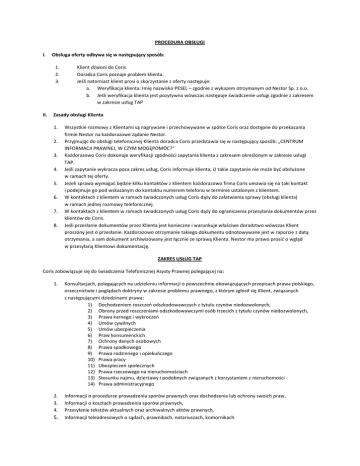 PROCEDURA OBSŁUGI I. Obsługa oferty odbywa się w następujący sposób: 1. 2. 3. II. Klient dzwoni do Coris. Doradca Coris poznaje problem klienta. Jeśli natomiast klient prosi o skorzystanie z oferty następuje: a. Weryfikacja klienta: Imię nazwisko PESEL – zgodnie z wykazem otrzymanym od Nestor Sp. z o.o. b. Jeśli weryfikacja klienta jest pozytywna wówczas następuje świadczenie usługi zgodnie z zakresem w zakresie usług TAP Zasady obsługi Klienta 1. 2. 3. 4. 5. 6. 7. 8. Wszystkie rozmowy z Klientami są nagrywane i przechowywane w spółce Coris oraz dostępne do przekazania firmie Nestor na każdorazowe żądanie Nestor. Przyjmując do obsługi telefonicznej Klienta doradca Coris przedstawia się w następujący sposób: „CENTRUM INFORMACJI PRAWNEJ, W CZYM MOGĘPOMÓC?” Każdorazowo Coris dokonuje weryfikacji zgodności zapytania klienta z zakresem określonym w zakresie usługi TAP. Jeśli zapytanie wykracza poza zakres usług, Coris informuje klienta, iż takie zapytanie nie może być obsłużone w ramach tej oferty. Jeżeli sprawa wymagać będzie kilku kontaktów z klientem każdorazowo firma Coris umawia się na taki kontakt i podejmuje go pod wskazanym do kontaktu numerem telefonu w terminie ustalonym z klientem. W kontaktach z klientem w ramach świadczonych usług Coris dąży do załatwienia sprawy (obsługi klienta) w ramach jednej rozmowy telefonicznej. W kontaktach z klientem w ramach świadczonych usług Coris dąży do ograniczenia przesyłania dokumentów przez klientów do Coris. Jeśli przesłanie dokumentów przez Klienta jest konieczne i warunkuje właściwe doradztwo wówczas Klient proszony jest o przesłanie. Każdorazowo otrzymanie takiego dokumentu odnotowywane jest w raporcie z datą otrzymania, a sam dokument archiwizowany jest łącznie ze sprawą Klienta. Nestor ma prawo prosić o wgląd w przesyłaną Klientowi dokumentację. ZAKRES USŁUG TAP Coris zobowiązuje się do świadczenia Telefonicznej Asysty Prawnej polegającej na: 1. Konsultacjach, polegających na udzieleniu informacji o powszechnie obowiązujących przepisach prawa polskiego, orzecznictwie i poglądach doktryny w zakresie problemu prawnego, z którym zgłosił się Klient, związanych z następującymi dziedzinami prawa: 1) Dochodzeniem roszczeń odszkodowawczych z tytułu czynów niedozwolonych, 2) Obrony przed roszczeniami odszkodowawczymi osób trzecich z tytułu czynów niedozwolonych, 3) Prawa karnego i wykroczeń 4) Umów cywilnych 5) Umów ubezpieczenia 6) Praw konsumenckich 7) Ochrony danych osobowych 8) Prawa spadkowego 9) Prawa rodzinnego i opiekuńczego 10) Prawa pracy 11) Ubezpieczeń społecznych 12) Prawa rzeczowego na nieruchomościach 13) Stosunku najmu, dzierżawy i podobnych związanych z korzystaniem z nieruchomości 14) Prawa administracyjnego 2. 3. 4. Informacji o procedurze prowadzenia sporów prawnych oraz dochodzenia lub ochrony swoich praw, Informacji o kosztach prowadzenia sporów prawnych, Przesyłanie tekstów aktualnych oraz archiwalnych aktów prawnych, 5. Informacji teleadresowych o sądach, prawnikach, notariuszach, komornikach.