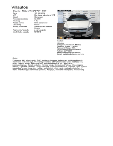 Villautos Chevrolet Malibu LT PAQ "B" AUT PKW Cena 123 000 MXN VAT Mo¿liwoæ odzyskania VAT Model Kleinwagen Pierwsza rejestracja 02.2009 Przebieg 1 KM Rodzaj paliwa Silnik benzynowy Lackierung blanco Rodzaj przek³adni Automatyczna skrzynia biegów Poprzedni w³aciciele z pierwszej rêki Identyfikator pojazdu F210648 Kontakt: Villautos Delegation: Gustavo A. Madero Siedlung: Aragon - La Villa Ferrocarril Hidalgo 982 07050 Mexico / Distrito Federal Telefon: 5577 5577 Email: [email protected] Email: [email protected] Cechy: Z pierwszej rêki, Klimatyzacja, Stoff, Instalacja alarmowa, Odtwarzacz p³yt kompaktowych, elektryczne podnoniki szyb, Poduszka powietrzna, ESP (elektroniczny uk³ad stabilizacji toru jazdy), blanco, Radio, Innenfarbe Gris, Aluminiowe obrêcze kó³, ABS (uk³ad przeciwpolizgowy), Zamek centralny, Kontrola trakcji, Komputer pok³adowy, Wspomaganie (serwo), Oszklenie kolorowe, Uchwyt na kubek, dzielona tylna kanapa, Zag³ówki z ty³u, System regulacji po³o¿enia kierownicy, rodkowy pod³okietnik, elektrycznie regulowane lusterka, 4 drzwi, Wielofunkcyjna kierownica sportowa, Ablage(n), Konwerter katalityczny, Finanzierung