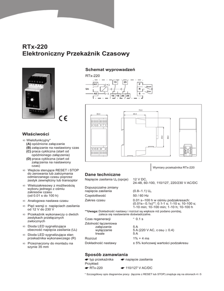 RTx-220 Elektroniczny PrzekaŸnik Czasowy Schemat wyprowadzeñ RTx-220 A1 15 (+) 25 P Un R A2 (-) S 16 18 26 28 Reset Stop 70.0 45.0 W³aœciwoœci • Wielofunkcyjny* (A) opóŸnione za³¹czanie (B) za³¹czanie na nastawiony czas (C) praca cykliczna (start od opóŸnionego za³¹czenia) (D) praca cykliczna (start od za³¹czenia na nastawiony czas) • Wejœcia steruj¹ce RESET i STOP do zerowania lub zatrzymania odmierzanego czasu poprzez zestyk zewnêtrzny lub transoptor • Wielozakresowy z mo¿liwoœci¹ wyboru jednego z oœmiu zakresów czasu (od 0.01 s do 100 h) • Analogowa nastawa czasu • Piêæ wersji o napiêciach zasilania od 12 V do 230 V 86.0 45.0 35.0 Wymiary przekaŸnika RTx-220 Dane techniczne Napiêcie zasilania Un (opcje) Dopuszczalne zmiany napiêcia zasilania Czêstotliwoœæ Zakres czasu 12 V DC, 24-48, 60-100, 110/127, 220/230 V AC/DC (0.8–1.1) Un 50 / 60 Hz 0.01 s–100 h w oœmiu podzakresach: (0.01s– 0.1s)**; 0.1-1 s; 1-10 s; 10-100 s; 1-10 min; 10-100 min; 1-10 h; 10-100 h • PrzekaŸnik wykonawczy o dwóch **Uwaga: Dok³adnoœæ nastawy i rozrzut s¹ wiêksze ni¿ podano poni¿ej, zaleca siê nastawianie doœwiadczalne. • Dioda LED sygnalizuj¹ca Czas regeneracji Zdolnoœæ ³¹czeniowa za³¹czanie wy³¹czanie trwale 5A 5 A (220 V AC, c osϕ ≥ 0.4) 5A Rozrzut Dok³adnoœæ nastawy 1% + 4 ms ± 5% koñcowej wartoœci podzakresu zestykach prze³¹cznych zw³ocznych obecnoœæ napiêcia zasilania (Un) • Dioda LED sygnalizuj¹ca stan przekaŸnika wykonawczego (R) • Przeznaczony do monta¿u na szynie 35 mm ≤ 0.1 s Sposób zamawiania * typ przekaŸnika Przyk³ad: * RTx-220 * napiêcie zasilania * 110/127 V AC/DC * Szczegó³owy opis diagramów pracy (³¹cznie z RESET lub STOP) znajduje siê na stronach 4 i 5