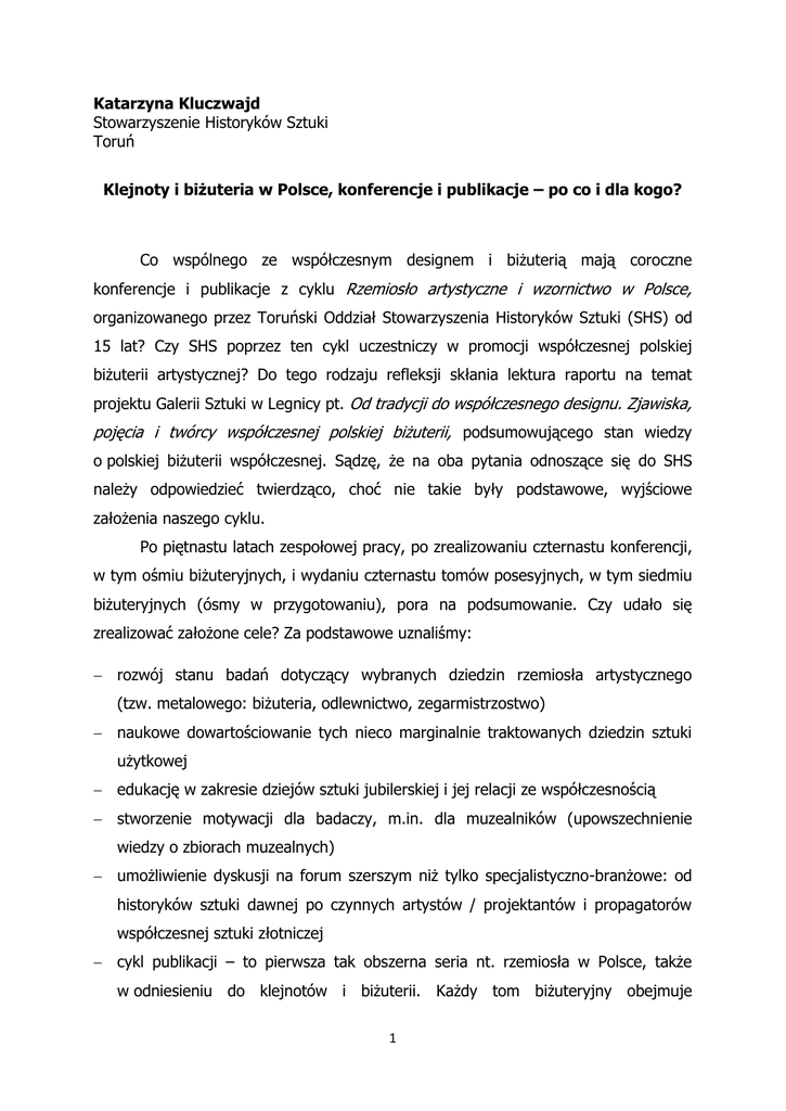 Katarzyna Kluczwajd Stowarzyszenie Historyków Sztuki Toruń Klejnoty i biżuteria w Polsce, konferencje i publikacje – po co i dla kogo? Co wspólnego ze współczesnym designem i biżuterią mają coroczne konferencje i publikacje z cyklu Rzemiosło artystyczne i wzornictwo w Polsce, organizowanego przez Toruński Oddział Stowarzyszenia Historyków Sztuki (SHS) od 15 lat? Czy SHS poprzez ten cykl uczestniczy w promocji współczesnej polskiej biżuterii artystycznej? Do tego rodzaju refleksji skłania lektura raportu na temat projektu Galerii Sztuki w Legnicy pt. Od tradycji do współczesnego designu. Zjawiska, pojęcia i twórcy współczesnej polskiej biżuterii, podsumowującego stan wiedzy o polskiej biżuterii współczesnej. Sądzę, że na oba pytania odnoszące się do SHS należy odpowiedzieć twierdząco, choć nie takie były podstawowe, wyjściowe założenia naszego cyklu. Po piętnastu latach zespołowej pracy, po zrealizowaniu czternastu konferencji, w tym ośmiu biżuteryjnych, i wydaniu czternastu tomów posesyjnych, w tym siedmiu biżuteryjnych (ósmy w przygotowaniu), pora na podsumowanie. Czy udało się zrealizować założone cele? Za podstawowe uznaliśmy: rozwój stanu badań dotyczący wybranych dziedzin rzemiosła artystycznego (tzw. metalowego: biżuteria, odlewnictwo, zegarmistrzostwo) naukowe dowartościowanie tych nieco marginalnie traktowanych dziedzin sztuki użytkowej edukację w zakresie dziejów sztuki jubilerskiej i jej relacji ze współczesnością stworzenie motywacji dla badaczy, m.in. dla muzealników (upowszechnienie wiedzy o zbiorach muzealnych) umożliwienie dyskusji na forum szerszym niż tylko specjalistyczno-branżowe: od historyków sztuki dawnej po czynnych artystów / projektantów i propagatorów współczesnej sztuki złotniczej cykl publikacji – to pierwsza tak obszerna seria nt. rzemiosła w Polsce, także w odniesieniu do klejnotów i biżuterii. Każdy tom biżuteryjny obejmuje 1 zróżnicowaną tematykę (od średniowiecza do dziś), zaopatrzony jest w streszczenia w języku angielskim. W odniesieniu do dziejów biżuterii – pierwsza sesja na ten temat (2001) pokazała, że dobrze wytypowaliśmy obszar badawczy: dziedzina różnorodna, wielopłaszczyznowa, wciąż mało rozpoznana i trochę na marginesie nie tylko historii sztuki, ale nawet historii rzemiosła artystycznego. Skala zainteresowania tą problematyką spowodowała, że spotkania biżuteryjne odbywają się dwa razy częściej niż te dotyczące zegarmistrzostwa i odlewnictwa (co 2 lata; pozostałe – co 4 lata). Z czasem wokół naszej rzemieślniczej / biżuteryjnej idei zgromadziło się całkiem spore grono badaczy i twórców, sympatyków, słuchaczy i czytelników, nieodmiennie zaangażowanych. Za osobisty sukces uznaję skupienie tak świetnych ludzi w tak wielkiej liczbie wokół wspólnej idei / pracy (tym bardziej, że pracujemy w trybie wolontariatu…). Czy udało się nam włączyć w promocję polskiej biżuterii artystycznej? Na pewno nie w tak spektakularny sposób, jak instytucjom / miastom, które podjęły – jakże cenne – działania systemowe (np. Gdańsk, Legnica, Sandomierz). Nie w sposób wizualny, dobrze odbierany przez tzw. przeciętnego odbiorcę, jak i aktywnego uczestnika kultury, jak czynią to muzea, galerie. Ale też żaden z tych (wielkich) podmiotów nie podjął trudu systematycznych BADAŃ HISTORII I TRADYCJI (jako podstawy współczesności) w łączności z nurtami najnowszymi. W tym tkwi siła działań SHS, niewielkiej organizacji pozarządowej z dużym intelektualnym potencjałem. Swego rodzaju fenomen naszych konferencji, o ile można użyć tego terminu, polega nie tylko na odpowiedzi na istotne zapotrzebowanie badawcze, ale w dużej mierze na budowaniu relacji i form komunikacji między badaczami sztuki użytkowej i wzornictwa oraz ich współczesnymi twórcami i dydaktykami (szczególnie w odniesieniu właśnie do biżuterii). W mojej ocenie to jeden z elementów naszego (skromnego) wkładu w promocję polskiej biżuterii współczesnej – dbałość o świadomość tradycji, ukazywanie historycznych i artystycznych kontekstów tego, co dziś i w przyszłości. Summa summarum każdy z nas – muzea i galerie, uczelnie, targi, władze miast – dołożył i wciąż dokładają swoją cegiełkę do wspólnej budowli pn. biżuteria 2 artystyczna w Polsce (http://www.bizuteriaartystycznawpolsce.pl/), na której przeszłość i teraźniejszość składają się: twórczość / kreacja / projektowanie, technika i technologie, badanie i opis, krytyka i wartościowanie, promocja, rynek. Każdy z nas zajmuje pole właściwe dla własnej specjalizacji, szukając kontaktów z „sąsiadami”. Tak jak to miało miejsce w przypadku mariażu sesji SHS z gdańskimi Międzynarodowymi Targami Bursztynu, Biżuterii i Kamieni Jubilerskich Amberif. Dzięki tej współpracy uczestnicy sesji, w większości muzealnicy i historycy sztuki, podczas Targów mogą poznać najnowsze prace w Galerii Projektantów, z kolei twórcy i goście targów mogą wysłuchać prezentacji o dziejach klejnotów i biżuterii, sztuki użytkowej i tradycji kultury. Nawiązywane podczas sesji kontakty między historykami sztuki i twórcami służą wzajemnym inspiracjom i szukaniu odpowiedzi na nurtujące ich / nas pytania. W tematyce sesji dominują wątki dotyczące dawnych ozdób i klejnotów, z racji zarówno założeń programowych, jak i docelowej grupy odbiorców. Staramy się jednak uwzględniać problematykę współczesną: tj. dotyczącą artystów, ugrupowań, spółdzielni, wystaw, sfery technicznej / technologicznej i projektowania, mód, rynku biżuterii wreszcie. Choć ta ostatnia jest dość daleka od jądra reprezentowanej przez SHS dyscypliny nauki, to bywały także ciekawe prezentacje ukazujące szeroki kontekst kulturowy rynku współczesnej biżuterii (Sławomir Fijałkowski). Kilka słów o historii rzemieślniczych konferencji. Za