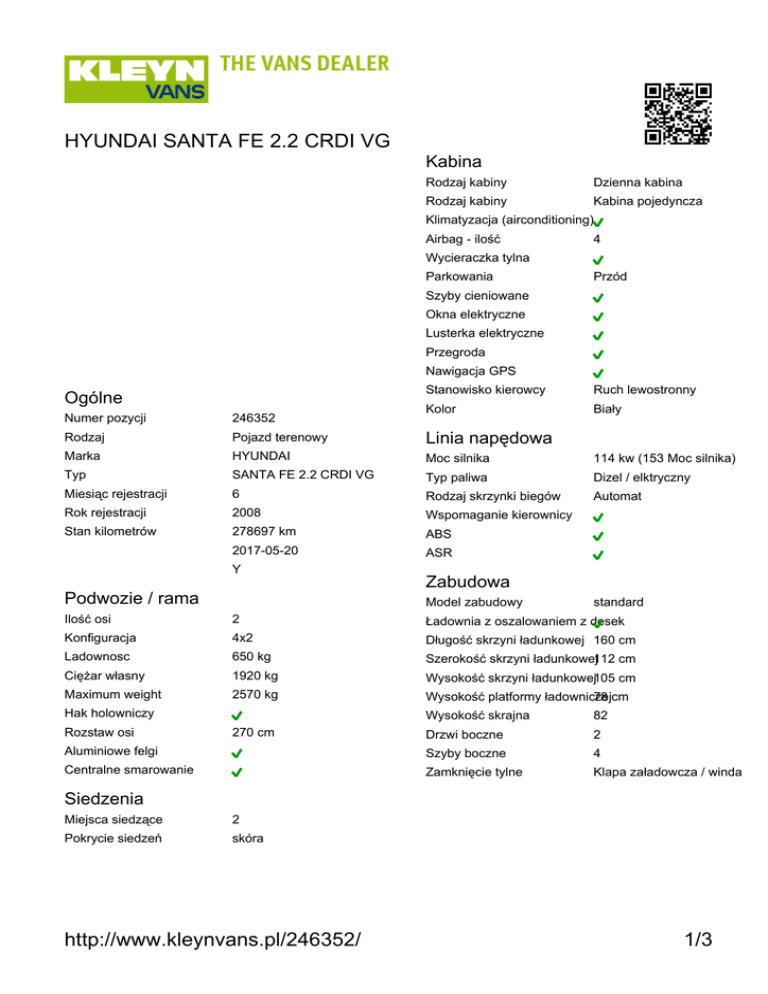 HYUNDAI SANTA FE 2.2 CRDI VG Kabina Rodzaj kabiny Dzienna kabina Rodzaj kabiny Kabina pojedyncza Klimatyzacja (airconditioning) Airbag - ilość 4 Wycieraczka tylna Parkowania Przód Szyby cieniowane Okna elektryczne Lusterka elektryczne Przegroda Nawigacja GPS Ogólne Stanowisko kierowcy Ruch lewostronny Kolor Biały Numer pozycji 246352 Rodzaj Pojazd terenowy Linia napędowa Marka HYUNDAI Moc silnika 114 kw (153 Moc silnika) Typ SANTA FE 2.2 CRDI VG Typ paliwa Dizel / elktryczny Miesiąc rejestracji 6 Rodzaj skrzynki biegów Automat Rok rejestracji 2008 Wspomaganie kierownicy Stan kilometrów 278697 km ABS 2017-05-20 ASR Y Podwozie / rama Zabudowa Model zabudowy standard Ilość osi 2 Ładownia z oszalowaniem z desek Konfiguracja 4x2 Długość skrzyni ładunkowej 160 cm Ladownosc 650 kg Szerokość skrzyni ładunkowej112 cm Ciężar własny 1920 kg Wysokość skrzyni ładunkowej105 cm Maximum weight 2570 kg Wysokość platformy ładowniczej 78 cm Hak holowniczy Wysokość skrajna 82 Drzwi boczne 2 Aluminiowe felgi Szyby boczne 4 Centralne smarowanie Zamknięcie tylne Klapa załadowcza / winda Rozstaw osi 270 cm Siedzenia Miejsca siedzące 2 Pokrycie siedzeń skóra http://www.kleynvans.pl/246352/ 1/3 HYUNDAI SANTA FE 2.2 CRDI VG Ilość osi mm mm Hamulce tarczowe Rodzaj osi skrętnej Mechaniczne Typ zawieszenia Wymiar opony Raport inspekcji Kody wyświetlacza Elektryczny Kolumna kierownicу Resory 235/60R18,0 mm mm Hamulce tarczowe Typ zawieszenia Wymiar opony Rama Idealny/nowy Hamulce Bardzo dobry Silnik - całość Rozsądny Stan Układ chłodzenia Akceptowalny Układ paliwowy Nie spełnia wymagań 235/60R18,0 Układ wydechowy Układ smarowania Skrzynka biegów Sprzęgło Napęd Opony http://www.kleynvans.pl/246352/ 2/3 HYUNDAI SANTA FE 2.2 CRDI VG http://www.kleynvans.pl/246352/ 3/3