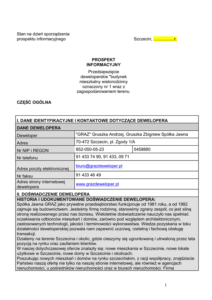 Stan na dzień sporządzenia prospektu informacyjnego Szczecin, …..............r. PROSPEKT INFORMACYJNY Przedsięwzięcie deweloperskie "budynek mieszkalny wielorodzinny oznaczony nr 1 wraz z zagospodarowaniem terenu CZĘŚĆ OGÓLNA I. DANE IDENTYFIKACYJNE I KONTAKTOWE DOTYCZĄCE DEWELOPERA DANE DEWELOPERA Deweloper "GRAZ" Gruszka Andrzej, Gruszka Zbigniew Spółka Jawna Adres 70-472 Szczecin, pl. Zgody 1/A Nr NIP i REGON 852-050-05-23 Nr telefonu 91 433 74 90, 91 433, 09 71 Adres poczty elektronicznej Nr faksu Adres strony internetowej dewelopera 5458880 [email protected] 91 433 46 49 www.grazdeweloper.pl II. DOŚWIADCZENIE DEWELOPERA HISTORIA I UDOKUMENTOWANE DOŚWIADCZENIE DEWELOPERA: Spółka Jawna GRAZ jako prywatne przedsiębiorstwo funkcjonuje od 1981 roku, a od 1992 zajmuje się budownictwem. Jesteśmy firmą rodzinną, stanowimy zgrany zespół, co jest silną stroną realizowanego przez nas biznesu. Wieloletnie doświadczenie nauczyło nas spełniać oczekiwania odbiorców mieszkań i domów, zarówno pod względem architektonicznym, zastosowanych technologii, jakości i terminowości wykonawstwa. Wiedza pozyskana w toku działalności deweloperskiej pozwala nam zapewnić uczciwą, rzetelną i fachową obsługę transakcji. Działamy na terenie Szczecina i okolic, gdzie cieszymy się ugruntowaną i utrwaloną przez lata pozycją na rynku oraz zaufaniem klientów. W naszej dotychczasowej ofercie znalazły się: nowe mieszkania w Szczecinie, nowe lokale użytkowe w Szczecinie, nowe domy w Szczecinie i okolicach. Poszukując nowych mieszkań i domów na rynku szczecińskim, z racji współpracy, znajdziecie Państwo naszą ofertę nie tylko na naszej stronie internetowej, ale również w agencjach nieruchomości, u pośredników nieruchomości oraz w biurach nieruchomości. Firma 1 współpracuje z wieloma bankami. Jako pierwszy budynek, w roku 2000 powstała kamienica przy ul. Chmielewskiego 18D w Szczecinie. W budynku znajduje się 27 mieszkań oraz 14 garaży w piwnicy. Mieszkania na parterze posiadają ogromne tarasy. Kolejną budową ( zakończona w 2001 roku) byłą budowa budynku dla obecnie Narodowego Funduszu Zdrowia przy ul. Arkońskiej 54 w Szczecinie. Równocześnie powstawał budynek -plomba przy ul. Szarotki 19, gdzie powstało 15 mieszkań. Na ostatniej kondygnacji mieszkania dwupoziomowe posiadają ogromne tarasy. W roku 2002 wybudowaliśmy kompleks 45 garaży przy ul. Fieldorfa w Szczecinie. W tym samym czasie budowaliśmy budynek wielorodzinny przy ul. Chmielewskiego 18E. Budowa została zakończona w 2003 roku. W budynku jest 33 mieszkania. W roku 2005 zakończyliśmy budowę kompleksu trzech budynków przy ul. Dąbrowskiego 4 i 5 oraz ul. Potulickiej 36. W sumie wybudowanych zostało tam 86 mieszkań, 5 lokali usługowych oraz garaże w podziemiu. Kolejna inwestycja powstała w roku 2007 na Pomorzanach przy ul. Inowrocławskiej. Mały, kameralny budynek posiada 12 mieszkań oraz garaże w podziemiu. Równocześnie powstał budynek na Pogodnie przy ul. Marii Konopnickiej 36, w którym powstało 5 mieszkań oraz garaże w podziemiu. Również w roku 2007 zakończona została budowa szeregowca w Dobrej Szczecińskiej przy ul. Granicznej, gdzie powstało 23 domki. Spółka nasza jako pierwsza na rynku deweloperskim wprowadziła bardzo wysoki standard części wspólnych oddawanych inwestycji. Klatki schodowe wykonane y marmuru lub granitu, energooszczędne systemy oświetlenia. Wszystkie realizowane przez nas obiekty oddane do użytku charakteryzują się niskimi kosztami eksploatacji dzięki wprowadzeniu energooszczędnych materiałów i nowych technologii. PRZYKŁAD UKOŃCZONEGO PRZEDSIĘWZIĘCIA DEWELOPERSKIEGO (należy wskazać o ile istnieją trzy ukończone przedsięwzięcia deweloperskie, w tym ostatnie Szczecin, ul. Legionów Dąbrowskiego 12, 13, 14; Przedsięwzięcie polegało na budowie zespołu budynków mieszkalnych, wielorodzinnych z garażem podziemnym. w doskonałej lokalizacji w centrum Szczecina. W skład zespołu budynków wchodzą dwa budynki. Budynek duży, trzyklatkowy i budynek mały, jednoklatkowy, w którym jest 12 mieszkań. W sumie inwestycja ma osiemdziesiąt cztery mieszkania oraz garaże i miejsca parkingowe w podziemiu. W budynkach Adres zamontowane są windy. Inwestycja rozpoczęta została w dniu 10 października 2006 roku zgodnie z pozwoleniem na budowę DECYZJA nr 1416/06 wydanym przez Urząd Miasta Szczecina w dniu 15.09.2006 r., znak WUiAB/IIB/IŻ/73531/296/06, UNP:45590/WUiAB/-I/06 oraz zaświadczeniem z dnia 12.12.2006 r., że powyższa decyzja jest ostateczna – znak WUiAB/IIB/IŻ/7359/142/06, Data rozpoczęcia UNP:68579/WUiAB/-XV/06 2 Data wydania ostatecznego pozwolenia na użytkowanie Dnia 4 kwietnia 2008 roku pismem znak PINBROP/DD/SK/7353/8992/1412/08 Państwowy Inspektor Nadzoru Budowlanego w Szczecinie zaświadcza, ze: decyzja z dnia 04.01.2008 r. znak PINB-ROP/DD/SK/7353/8992/07/08 o pozwoleniu na użytkowanie budynku mieszkalnego wielorodzinnego znajdującego się przy ul. Legionów Dąbrowskiego 13 w Szczecinie i decyzja z dnia 21.02.208 r. znak PINB-ROP/DD/SK/7114/301/08 o pozwoleniu na użytkowanie budynku mieszkalnego wielorodzinnego z garażami znajdującego się przy ul. Legionów Dąbrowskiego 14 w Szczecinie, oraz, ze decyzja z dnia 11.03.2008 r. znak PINBROP/DD/SK/7114/193/1281/08 o pozwoleniu na użytkowanie budynku mieszkalnego wielorodzinnego z garażem podziemnym, znajdującego się przy ul. Legionów Dąbrowskiego 15 w Szczecinie są ostateczne. PRZYKŁAD INNEGO UKOŃCZONEGO PRZEDSIĘWZIĘCIA DEWELOPERSKIEGO Wołczkowo, ul. Forsycji 1 – 24; Inwestycja polegała na budowie dwudziestu czterech budynków Adres mieszkalnych, jednorodzinnych w zabudowie szeregowej. Rozpoczęcie robót nastąpiło w dniu 29 lipca 2008 roku zgodnie z pozwoleniem na budowę DECYZJA nr 796/2008 z dnia 26.06.2008 r., znak AB.GS.7351-322 D/08 Data rozpoczęcia Zawiadomienie o zakończeniu budowy złożone zostało 08.09.2010