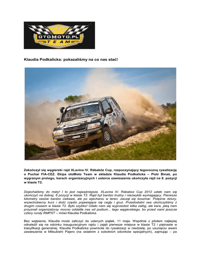 Klaudia Podkalicka: pokazaliśmy na co nas stać! Zakończył się węgierski rajd XLavina IV. Rábaköz Cup, rozpoczynający tegoroczną rywalizację o Puchar FIA-CEZ. Ekipa otoMoto Team w składzie Klaudia Podkalicka – Piotr Binaś, po wygranym prologu, karach organizacyjnych i usterce zawieszenia ukończyła rajd na 8. pozycji w klasie T2. Dojechaliśmy do mety! I to jest najważniejsze. XLavina IV. Rabakoz Cup 2012 udało nam się ukończyć na dobrej, 8 pozycji w klasie T2. Rajd był bardzo trudny i niezwykle wymagający. Pierwsze kilometry oesów bardzo ciekawe, ale po wjechaniu w teren, zaczął się koszmar. Potężne dziury, wszechobecny kurz i dość często pojawiające się cegły i gruz. Przedostatni oes ukończyliśmy z drugim czasem w klasie T2. Było szybko! Udało nam się wyprzedzić kilka załóg, ale kara, jaką nam przyznali organizatorzy mocno oddaliła nas od podium... tego węgierskiego, bo przed nami jeszcze cztery rundy RMPST – mówi Klaudia Podkalicka. Bez wątpienia, Klaudia może zaliczyć do udanych piątek, 11 maja. Wspólnie z pilotem najlepiej odnaleźli się na odcinku inauguracyjnym rajdu i zajęli pierwsze miejsce w klasie T2 i piętnaste w klasyfikacji generalnej. Klaudia Podkalicka powróciła do rywalizacji w niedzielę, po usunięciu awarii zawieszenia w Mitsubishi Pajero (na ostatnim z sobotnich odcinków specjalnych), zajmując – po przejechaniu trzech odcinków specjalnych o łącznej długości 122 km - kolejno czwarte, drugie i szóste miejsce w T2. Podczas węgierskiego rajdu udało nam się wykręcać czasy na stałym, wysokim poziomie, co pozwala nam pozytywnie myśleć o nadchodzących rundach. Doskonałym przykładem naszych możliwości był wygrany prolog. Najważniejsze to kolekcjonować mety i cenne punkty! Baja Carpathia już 29 czerwca! Damy z siebie wszystko – dodaje Klaudia Podkalicka Klaudia była jedyną kobietą kierowcą startującą w tym rajdzie. Wygrany prolog i osiągane na oesach czasy pokazały, że w Europie może ona z powodzeniem konkurować ze ścisłą czołówką w rajdach cross country. W sezonie 2012 Klaudię Podkalicką wspierają: otoMoto.pl, Miasto Szczecin, Entertainment Group, MinHolder, Verso, Rally Planet, CarGraphics, eXsports.TV, dReamfield Film Studio, ProDriving Team. Więcej o Klaudii Podkalickiej: Kierowca rajdowy i wyścigowy (otoMoto Team), najszybsza kobieta w Kia Picanto Cup i w 46. Rajdzie Barbórki. Wicemistrzyni ADAC Logan Cup. Zaczęła jeździć w wieku 13 lat, trenując na zamkniętych torach. W wieku 15 lat została członkiem i zawodnikiem Automobilklubu Szczecińskiego zrzeszonego w Polskim Związku Motorowym. W 2007 roku wystartowała w pucharze Kia Lotos Cup. Jako jedyna kobieta w zespole Prins Polish Racing Team (wspólnie z Kamilem Raczkowskim oraz Dariuszem Nowickim) bierze udział w zawodach ADAC Logan Cup. W sezonie 2007 jedyny polski zespół został wicemistrzem tej imprezy. Na początku 2008 roku miała wystartować jako pilot ciężarowym MAN-em wspólnie z Grzegorzem Baranem w odwołanym Rajdzie Dakar. Miała być drugą kobietą z Polski po Martynie Wojciechowskiej, która pojedzie w tym prestiżowym rajdzie. Jest córką Mariusza Podkalickiego, czterokrotnego mistrza i trzykrotnego wicemistrza Polski w wyścigach samochodowych.