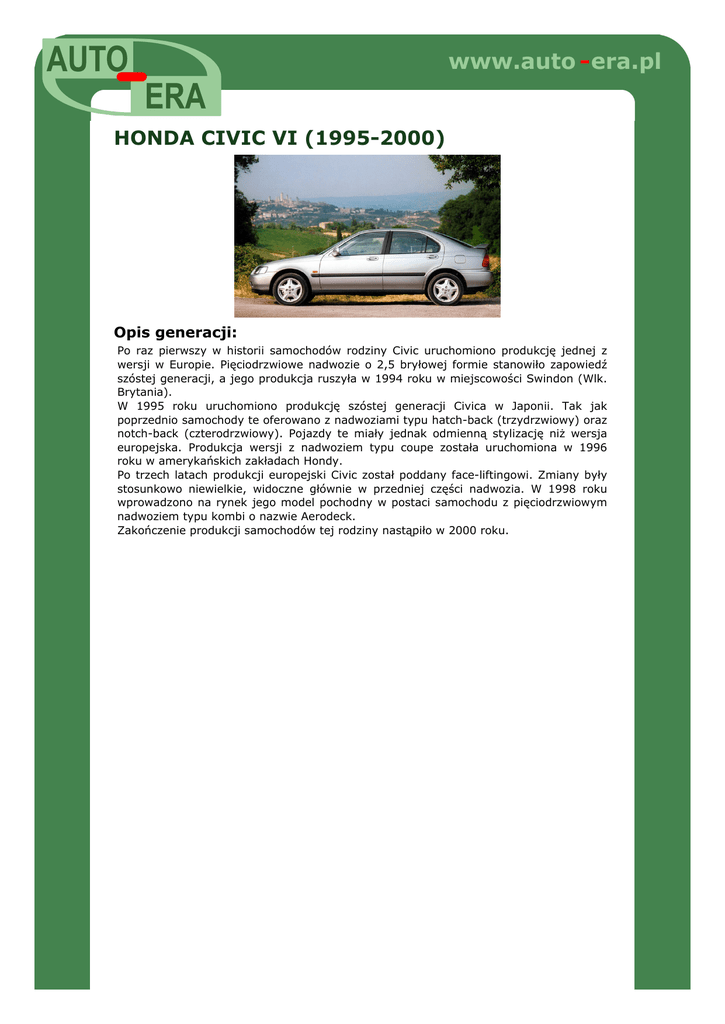 www.auto - era.pl HONDA CIVIC VI (1995-2000) Opis generacji: Po raz pierwszy w historii samochodów rodziny Civic uruchomiono produkcję jednej z wersji w Europie. Pięciodrzwiowe nadwozie o 2,5 bryłowej formie stanowiło zapowiedź szóstej generacji, a jego produkcja ruszyła w 1994 roku w miejscowości Swindon (Wlk. Brytania). W 1995 roku uruchomiono produkcję szóstej generacji Civica w Japonii. Tak jak poprzednio samochody te oferowano z nadwoziami typu hatch-back (trzydrzwiowy) oraz notch-back (czterodrzwiowy). Pojazdy te miały jednak odmienną stylizację niż wersja europejska. Produkcja wersji z nadwoziem typu coupe została uruchomiona w 1996 roku w amerykańskich zakładach Hondy. Po trzech latach produkcji europejski Civic został poddany face-liftingowi. Zmiany były stosunkowo niewielkie, widoczne głównie w przedniej części nadwozia. W 1998 roku wprowadzono na rynek jego model pochodny w postaci samochodu z pięciodrzwiowym nadwoziem typu kombi o nazwie Aerodeck. Zakończenie produkcji samochodów tej rodziny nastąpiło w 2000 roku.