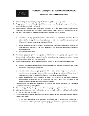 PROCEDURA UDOSTĘPNIANIA DOKUMENTACJI MEDYCZNEJ KLIENTÓW KLINIK LA PERLA SP. z o.o. 1. Dokumentacja medyczna pacjenta jest własnością spółki La perla sp. z o.o. 2. Przy przyjęciu do placówki pacjent jest informowany o przysługujących ma prawach, w tym o prawie do dokumentacji medycznej. 3. Udostępnianie dokumentacji medycznej następuje w trybie zapewniającym zachowanie poufności i ochrony danych osobowych i na podstawie decyzji Dyrektora Medycznego Kliniki. 4. Placówka ma obowiązek udostępnić dokumentację medyczną na żądanie: a) pacjentowi lub jego przedstawicielowi ustawowemu po uprzednim okazaniu dowodu tożsamości lub innego dokumentu urzędowego ze zdjęciem i przedstawieniu stosownych dokumentów umocowujących przedstawicielstwo, b) osobie upoważnionej przez pacjenta po uprzednim okazaniu upoważnienia notarialnego lub w obecności pracownika KLP, który poświadcza fakt złożenia w jego obecności podpisu upoważniającego, c) upoważnionym organom. 5. Po śmierci pacjenta, prawo do wglądu w dokumentację medyczną lub uzyskanie kopii dokumentacji medycznej ma wyłącznie osoba upoważniona przez pacjenta za jego życia, w sposób określony jak w pkt. 4 a i b powyżej. 6. Dokumentacja medyczna jest udostępniana do wglądu na terenie placówki na wniosek: a) pacjenta, którego ona dotyczy po uprzednim okazaniu dowodu tożsamości lub innego dokumentu urzędowego ze zdjęciem, 7. 8. 9. 10. b) przedstawiciela ustawowego pacjenta lub osoby przez niego upoważnionej po przedstawieniu stosownych dokumentów umocowujących przedstawicielstwo, a co do osoby upoważnionej po uprzednim okazaniu upoważnienia notarialnego, c) osoby upoważnionej przez pacjenta w razie jego śmierci, po uprzednim okazaniu upoważnienia notarialnego lub w obecności pracownika KLP, który poświadcza fakt złożenia w jego obecności podpisu upoważniającego. Udostępnianie dokumentacji medycznej do wglądu na terenie placówki, po uprzednim uzgodnieniu terminu jest bezpłatne. Dokumentację udostępnia się również w formie wyciągów, odpisów lub kopii. Udostępnienie dokumentacji medycznej w formie wyciągów, odpisów lub kopii w placówkach La Perla sp. z o.o. jest nieodpłatne. Dokumentacja może też być przesłana pocztą (przesyłką poleconą za potwierdzeniem odbioru) na wskazany adres: a) dla osób fizycznych koszt przesyłki pobierany jest za zaliczeniem pocztowym w momencie odbioru przesyłki wg obowiązujących przepisów – przesyłka pobraniowa, b) dla instytucji opłata za kserokopie dokumentacji medycznej oraz opłata z tytułu kosztów przesyłki wskazana jest na w fakturze, płatnej w terminie 14 dni (list polecony). Faktura przesłana jest wraz z dokumentacją. 11. Dokumentacja wysyłana pocztą jest zapakowana w dwie koperty. Koperta wewnętrzna jest opatrzona napisem „Dokumentacja Medyczna”, w kopercie zewnętrznej znajduje się faktura (dotyczy instytucji pkt. 10b) za wykonanie kserokopii., kopia pozostaje w archiwum KLP. 12. Oryginał dokumentacji wydawany jest tylko i wyłącznie na prośbę uprawnionych organów w związku z prowadzeniem sprawy przez organy państwowe. 13. Każdorazowo wydanie oryginałów dokumentacji medycznej musi zostać potwierdzone pokwitowaniem odbioru i z zastrzeżeniem zwrotu dokumentacji po jej wykorzystaniu z podaniem przybliżonej daty zwrotu dokumentacji (załącznik nr 1 do procedury). 14. Pokwitowanie odbioru powinno zawierać dane osoby przekazującej dokumentację, dane osoby odbierającej dokumentację, datę przekazania dokumentacji, jakiemu organowi została ona przekazana (ewentualnie numer sprawy itp.), przybliżoną datę zwrotu dokumentacji oraz podpisy osoby przekazującej oraz odbierającej. 15. Pokwitowanie umieszczamy w karcie zbiorczej danego pacjenta. Dodatkowo wykonujemy scan pokwitowania i przechowujemy w dokumentacji elektronicznej placówki oraz przesyłamy drogą mailową do dyrektora medycznego oraz dyrektora biura zarządu spółki. 16. W przypadku wydania oryginału dokumentacji upoważnionym organom w placówce należy pozostawić kserokopie dokumentacji wydanej lub jej pełny odpis, chyba , że zwłoka w jej wydaniu mogłaby narazić pacjenta na szkodę. 17. W celu uzyskania kopii dokumentacji medycznej osoba zainteresowana – pacjent, osoba przez niego upoważniona, przedstawiciel ustawowy pacjenta a w przypadku zgonu pacjenta osoba przez niego upoważniona do uzyskiwania dokumentacji medycznej, występuje z pisemnym wnioskiem do Prezesa spółki La Perla o sporządzenie wyciągów, odpisów lub kopii dokumentacji pacjenta (załącznik nr 2 do procedury). 18. Do wniosku należy dołączyć pisemne upoważnienie do wydania dokumentacji medycznej w przypadku upoważnienia osoby innej niż wskazana w dokumentacji medycznej. 19. Biuro spółki za pośrednictwem menadżera placówki przygotowuje dokumentację medyczną do udostępniania (sporządzanie wyciągów, odpisów, kopii). Kopie udostępnianych dokumentów podpisuje za zgodność z oryginałem upoważniony przez Prezesa spółki pracownik – menadżer placówki. 20. Udostępnianie dokumentacji medycznej na zewnątrz placówki następuje na podstawie decyzji Prezesa spółki lub osoby przez niego upoważnionej. 21. Odmowa wydania dokumentacji medycznej wymaga formy pisemnej i podania uzasadnienia odmowy. 22. La Perla przechowuje dokumentację medyczną przez okres 20 lat, licząc od końca roku kalendarzowego, w którym dokonano w niej ostatniego wpisu, z wyjątkiem: a) dokumentacji medycznej w przypadku zgonu pacjenta na skutek uszkodzenia ciała lub zatrucia, która jest przechowywana przez 30 lat, licząc od końca roku kalendarzowego, w którym nastąpił zgon, b) dokumentacji medycznej dotyczącej dzieci do ukończenia 2 roku życia, która jest przechowywana przez 22 lata, c) zdjęć rentgenowskich przechowywanych poza dokumentacją medyczną pacjenta, które są przechowywane przez 10 lat, licząc od końca roku kalendarzowego,