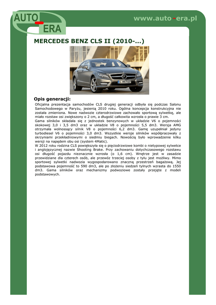 www.auto - era.pl MERCEDES BENZ CLS II (2010-...) Opis generacji: Oficjalna prezentacja samochodów CLS drugiej generacji odbyła się podczas Salonu Samochodowego w Paryżu, jesienią 2010 roku. Ogólna koncepcja konstrukcyjna nie została zmieniona. Nowe nadwozie czterodrzwiowe zachowało sportową sylwetkę, ale miało rozstaw osi zwiększony o 2 cm, a długość całkowita wzrosła o prawie 3 cm. Gama silników składała się z jednostek benzynowych w układzie V6 o pojemności skokowej 3,0 i 3,5 dm3 oraz w układzie V8 o pojemności 5,5 dm3. Wersja AMG otrzymała wolnossący silnik V8 o pojemności 6,2 dm3. Gamę uzupełniał jedyny turbodiesel V6 o pojemności 3,0 dm3. Wszystkie wersje silników współpracowały z skrzyniami przekładniowymi o siedmiu biegach. Nowością było wprowadzenie kilku wersji na napędem obu osi (system 4Matic). W 2012 roku rodzina CLS powiększyła się o pięciodrzwiowe kombi o nietypowej sylwetce i anglojęzycznej nazwie Shooting Brake. Przy zachowaniu dotychczasowego rozstawu osi długość pojazdu nieznacznie wzrosła (o 1,6 cm). Wnętrze jest w zasadzie przewidziane dla czterech osób, ale przewóz trzeciej osoby z tyłu jest możliwy. Mimo sportowej sylwetki nadwozia wygospodarowano znaczną przestrzeń bagażową. Jej podstawowa pojemność to 590 dm3, ale po złożeniu siedzeń tylnych wzrasta do 1550 dm3. Gama silników oraz mechanizmy podwoziowe zostały przejęte z modeli podstawowych.